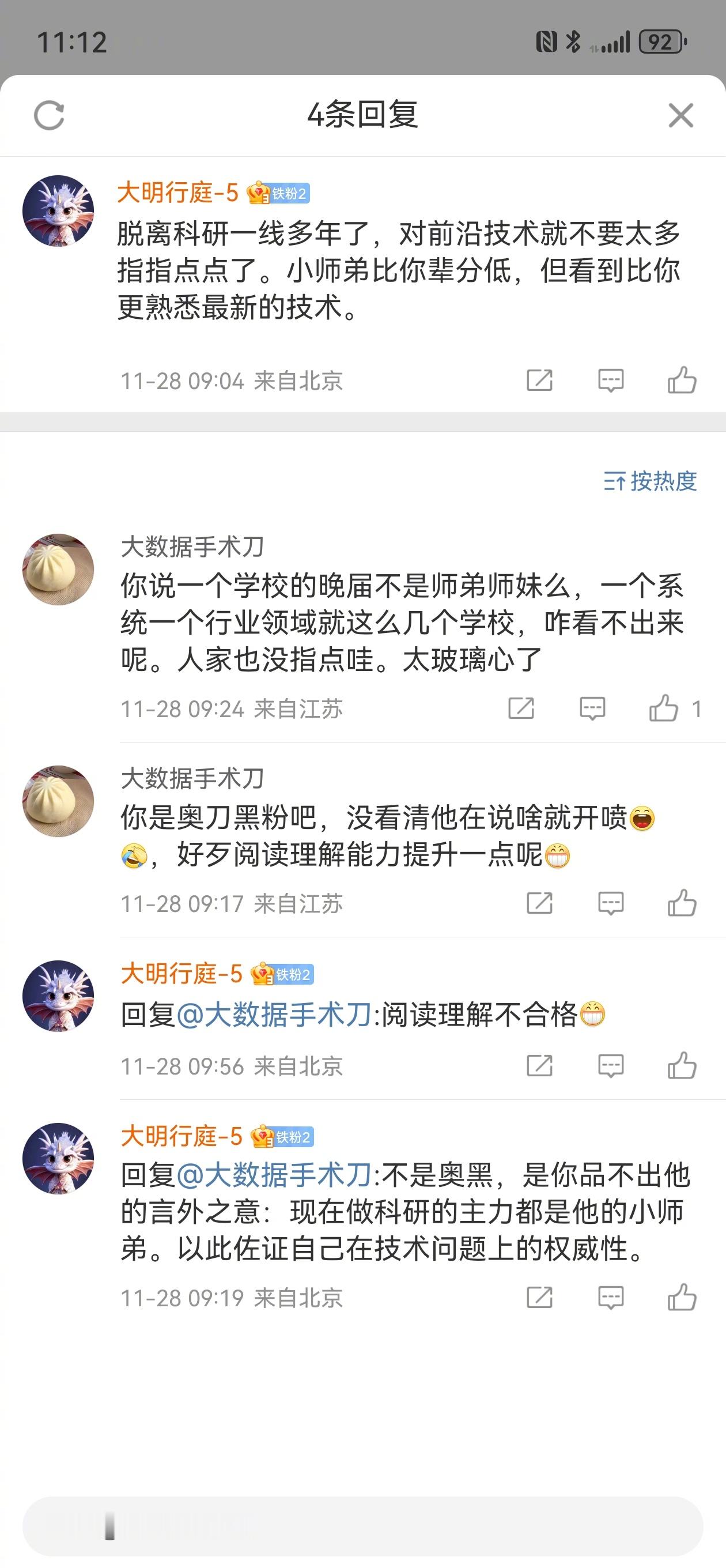 中国电信沟通会结束了,转场去亦庄参加“空间信息通信技术”专委会会议。地铁中无事聊个闲白,有些网友也太玻璃心了我称现在母校里发论文的是我小师弟,其实这是自谦了,他们还算不上小师弟,而是是我的徒弟甚至徒孙辈。我今年57周岁,母校留任同学都是快退休的资深教授博导了,那些发论文的研究生都是他们的弟子,甚至是弟子的弟子。但在中国学术界,从来就没有越资深学术水平越高的说法,而是恰恰相反,越是后辈水平就越强,否则中国科技怎么可能飞速进步三十年。我入职军校当教员时,只是个硕士研究生,那时候军校抢着要,有三个系都约我面试。现在,即使985博士毕业,想争个军校教职都难如登天。我多次公开说过,大约2015年时,我就明确感受到学生发论文的档次已经比我高了,再在教职硬撑会越来越难,两年后我就选择自主择业了。年龄大资历深是客观事实,但绝没有资历越深水平越高的说法,而是恰恰相反。这位同学对学术界一无所知,真的误解我了