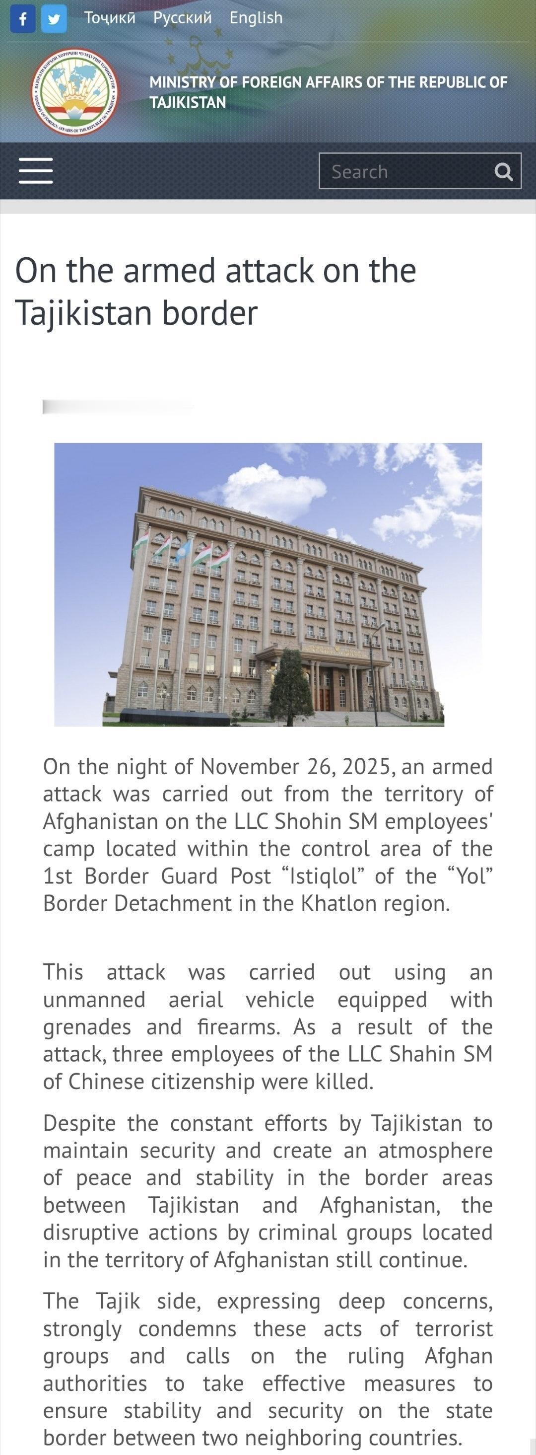 塔吉克斯坦外交部称,2025年11月26日夜间,一个位于阿富汗境内的武装团伙对“沙欣SM”有限责任公司的员工营地发动了武装袭击。该营地位于塔吉克斯坦哈特隆州“约尔”边防支队所辖的“伊斯蒂克洛尔”第一边防哨所的控制区域内。 袭击者使用了枪支和装载手榴弹的无人机进行攻击,导致“沙欣SM”有限责任公司的三名中国籍员工不幸身亡。阿富汗尚未对塔吉克斯坦的指控作出回应。
