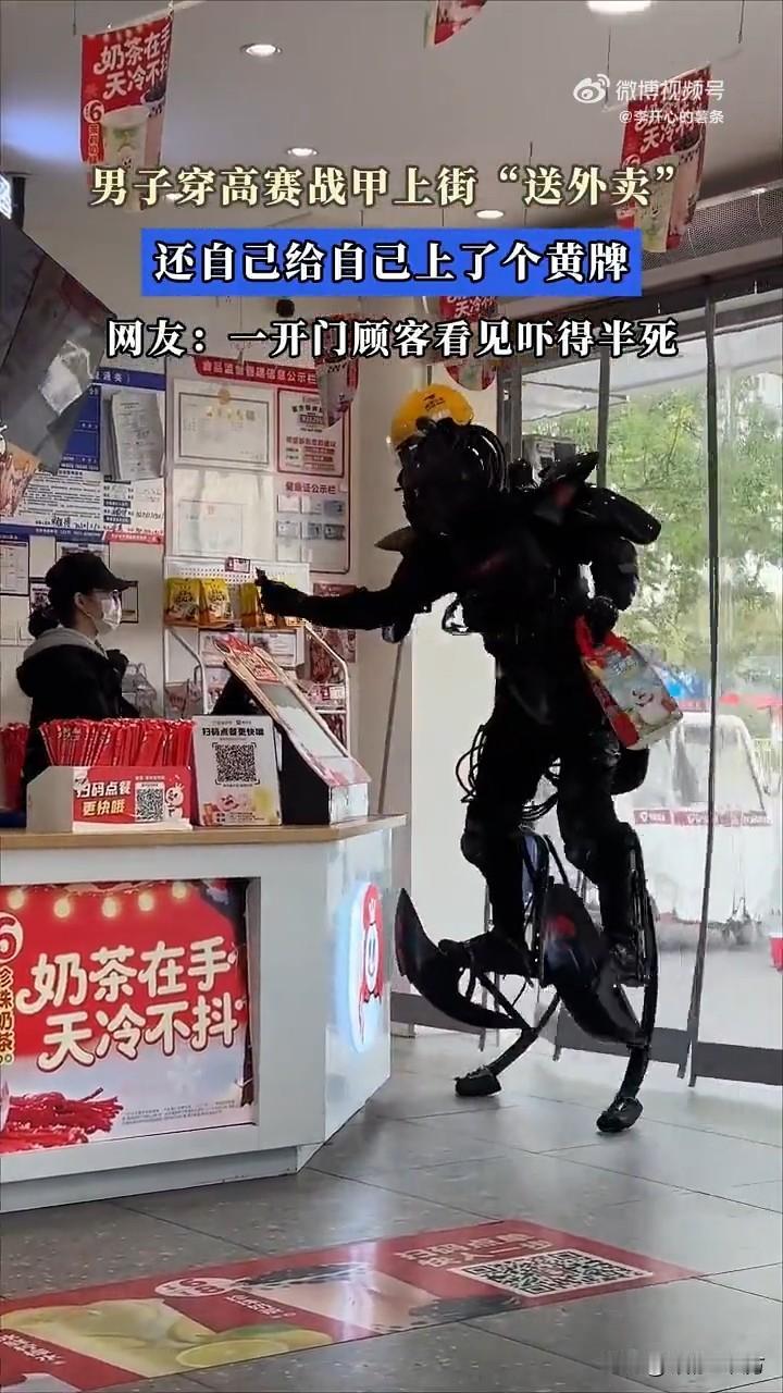 未来战甲范拉满的“高赛战甲外卖哥”真的是科技感十足啊! 如果给你送外卖的是身穿“高赛战甲”的外卖小哥,你会不会惊掉下巴? 看到一个外卖小哥身穿“高赛战甲”取外卖的视频,科技感十足,回头率直接顶格拉满啊! 有新奇的目光,羡慕的目光,也有不解的目光!不管怎么样这回头率绝对拉满了! 就是不知道收外卖的人看到小哥的造型会不会吓到!