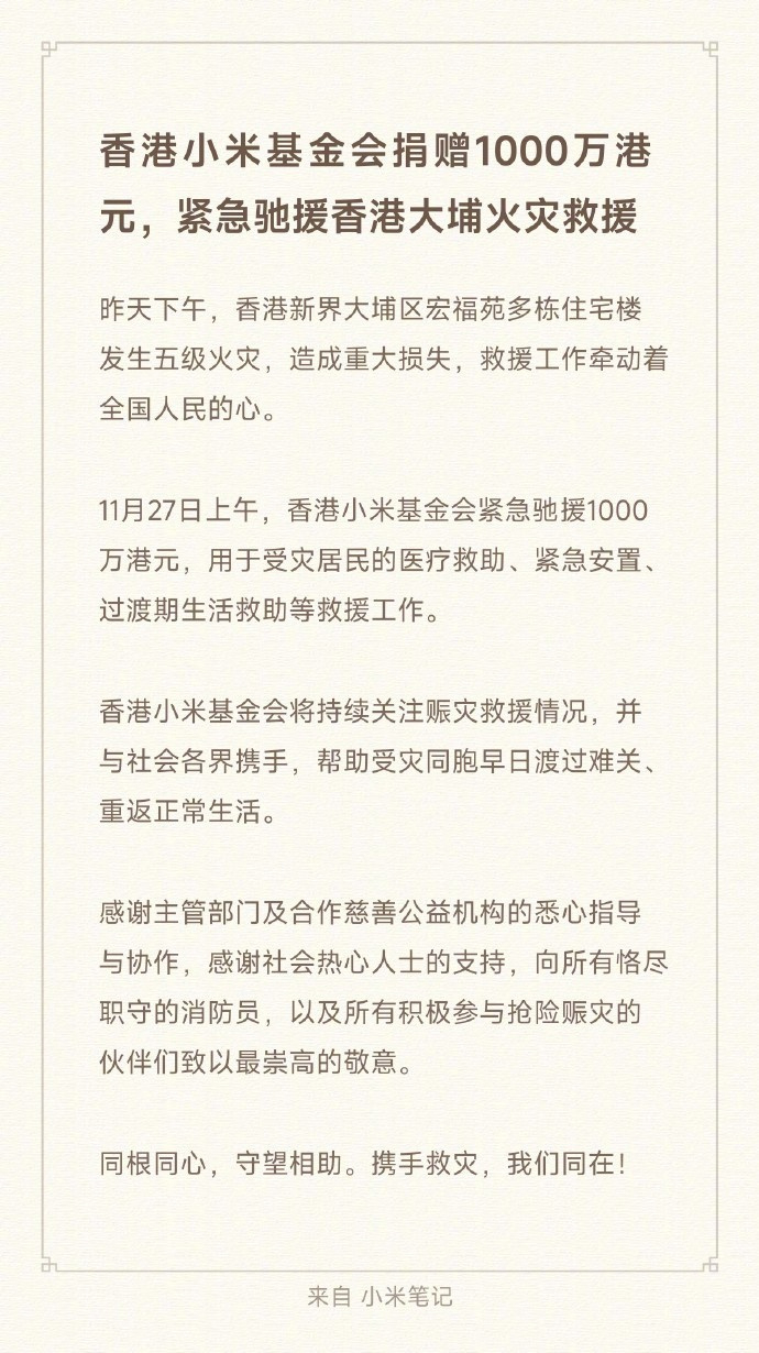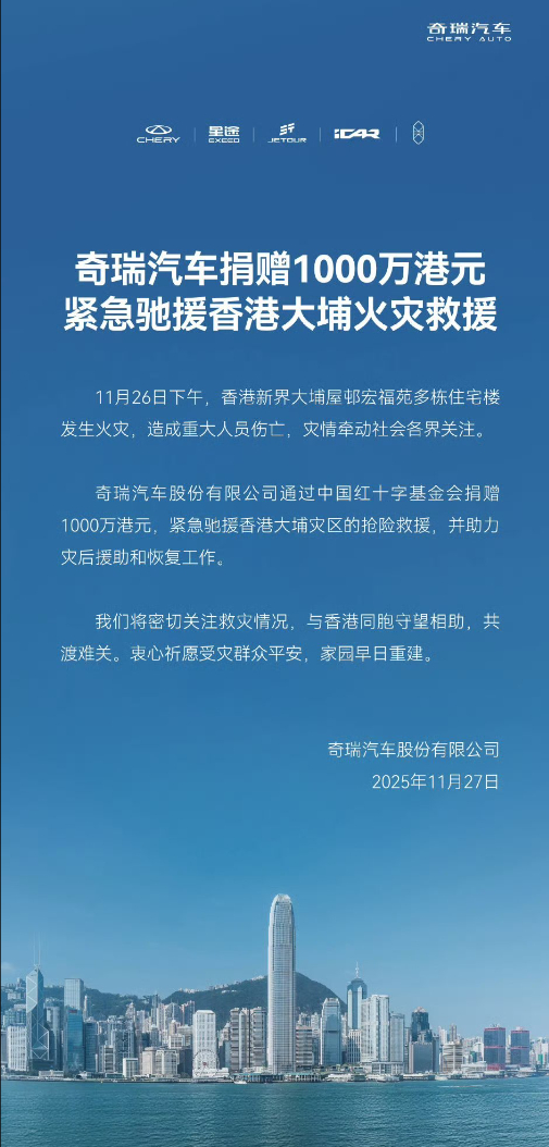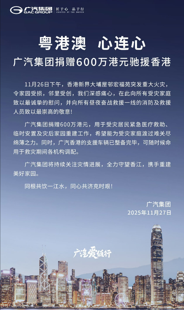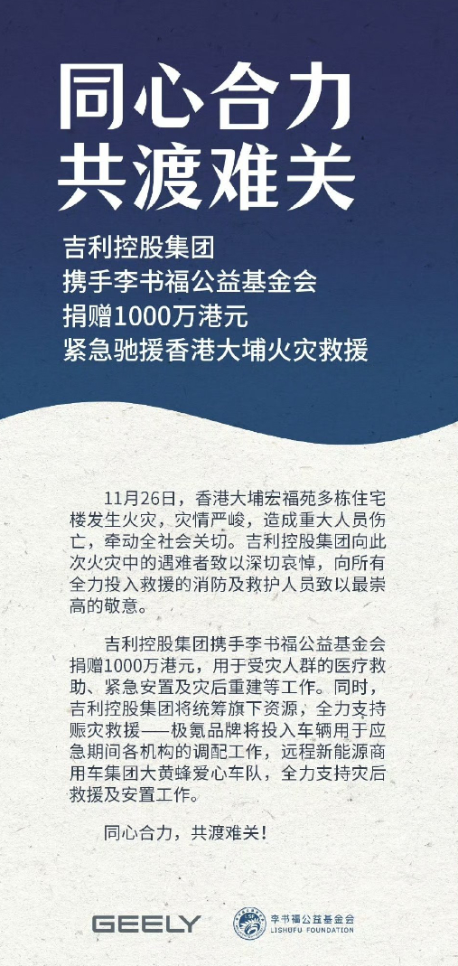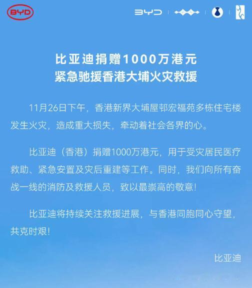 香港大火已致94人遇难 车企捐款香港大火的行动还在继续,除了小鹏、小米和比亚迪外,赛力斯捐款500万港元、广汽集团捐款600万港元、吉利集团捐款1000万港元、奇瑞汽车捐款1000万港元,患难见真情!何小鹏还提到了他们的飞行汽车,未来会实现吨级别的全自动加水+灭火能力,为城市和森林灭火贡献力量。