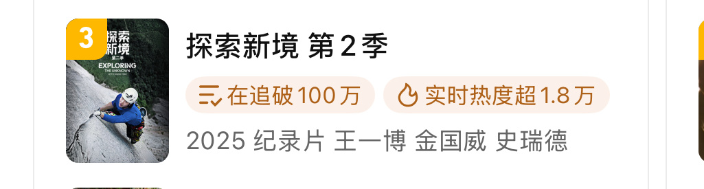 一部纪录片,胆敢选在工作日的上午11点开播,3分钟🔒svip,还没有大固屏。不只是王一博大胆,整个探索新境2都很大胆。但是上线仅仅10分钟就超过了第一部最高热度,探索新境 1大出圈,王一博的影响力更大了。
