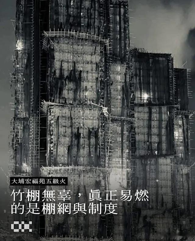 香港天文前台长称「竹棚无辜,真正易燃的是棚网与制度」香港大火已致94人遇难,香港天文台前台长林超英今日(27 日)在社交平台发文,认为火灾中保护棚架工人的「围网」反而可能成为致命元凶,指出虽然「围网」的原意是防止棚架上物件或工人跌下,但这些易燃物料在火灾中却助长火势迅速蔓延。超英同时批评,自 2009 年为工程界「保就业」而推行的「屋宇更新大行动」开始,全港无数居民饱受不人道的全面围封生活困扰,生活以年计,无人理会他们的苦况,现在更增加火灾带来的死亡威胁。他质问,「保就业重要,那么普罗市民的有尊严生活呢?维修为了改善生活,何以变成死亡陷阱?」帖文亦发上多张图片,其中一张图片以黑白色调呈现火灾后的宏福苑建筑外貌,并配有文字「竹棚无辜,真正易燃的是棚网与制度」。遗体照片和遗物辨认程序开放