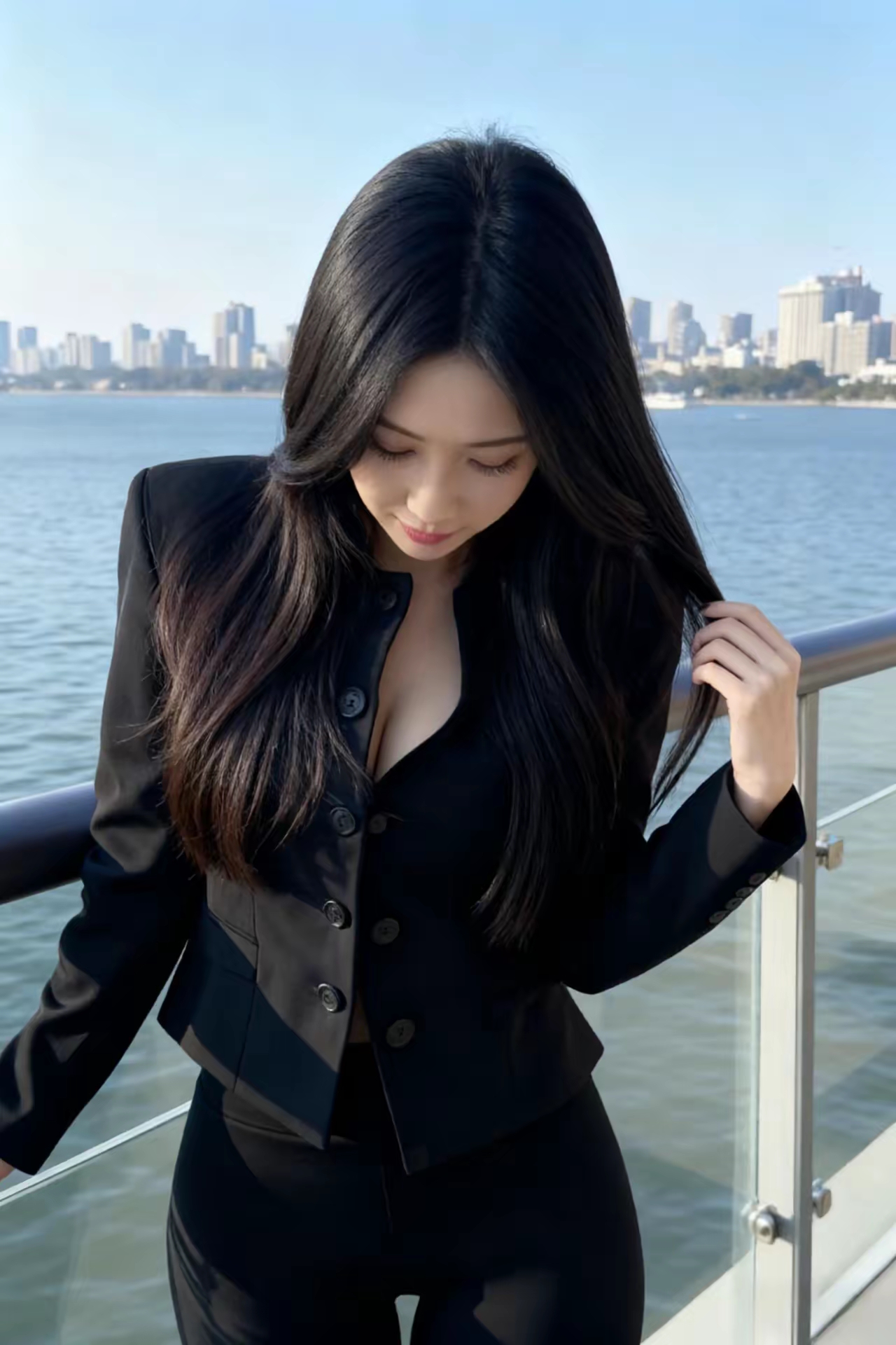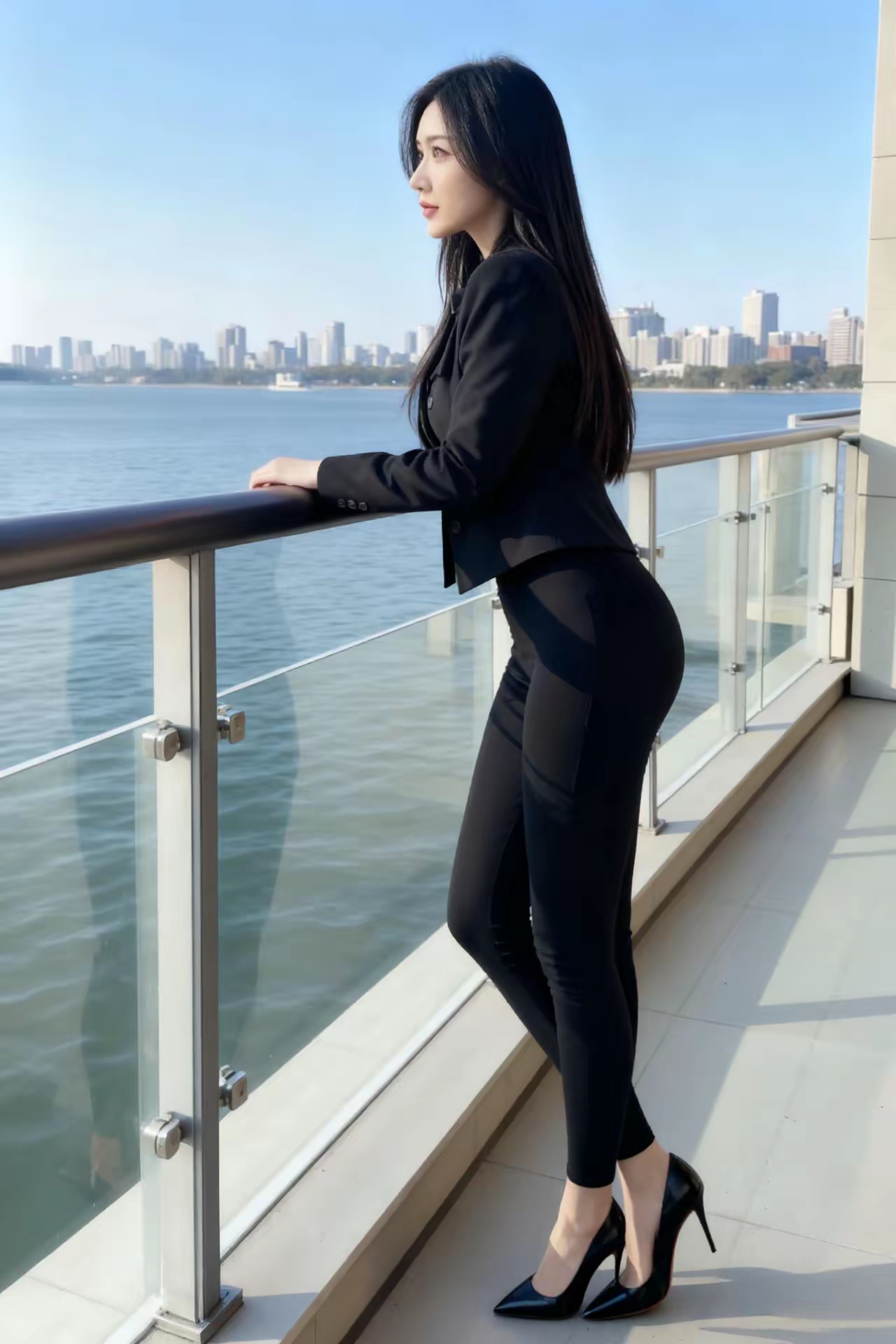 都市女郎,眺望湖畔,时尚黑白穿搭,尽显优雅气质。