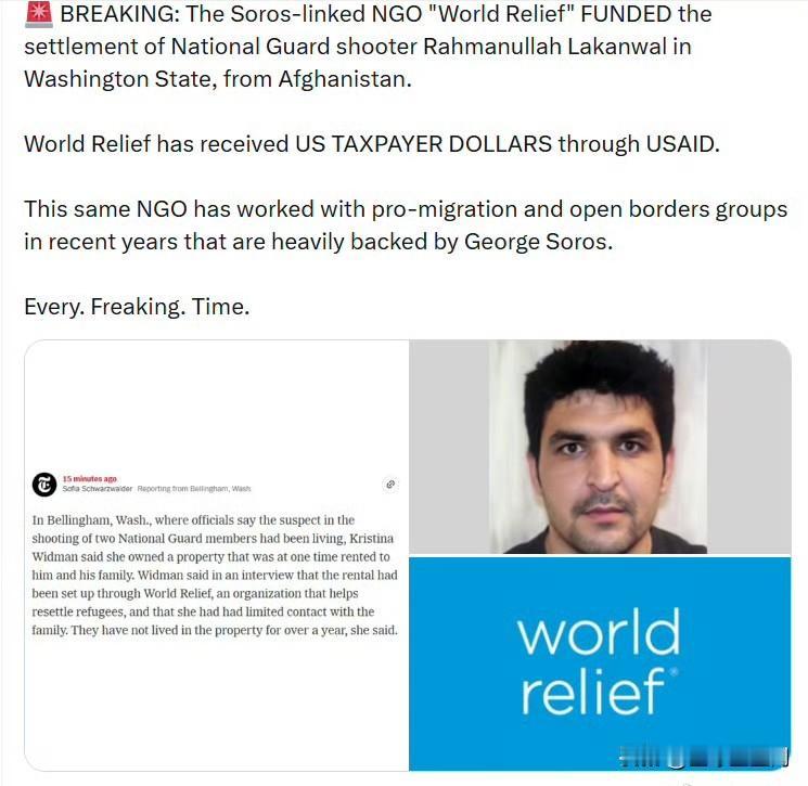 与索罗斯有关的非政府组织 “世界救援(World Relief)” 为来自阿富汗的国民警卫队枪手 拉赫马努拉·拉坎瓦尔 在华盛顿州的安置提供了资金支持。 World Relief 曾通过美国国际开发署(USAID)获得 美国纳税人的资金。 近年来,这家非政府组织还与支持移民与开放边境政策的团体合作,而这些团体受到 乔治·索罗斯的大力资助。 每次都是这样,真是一次例外。