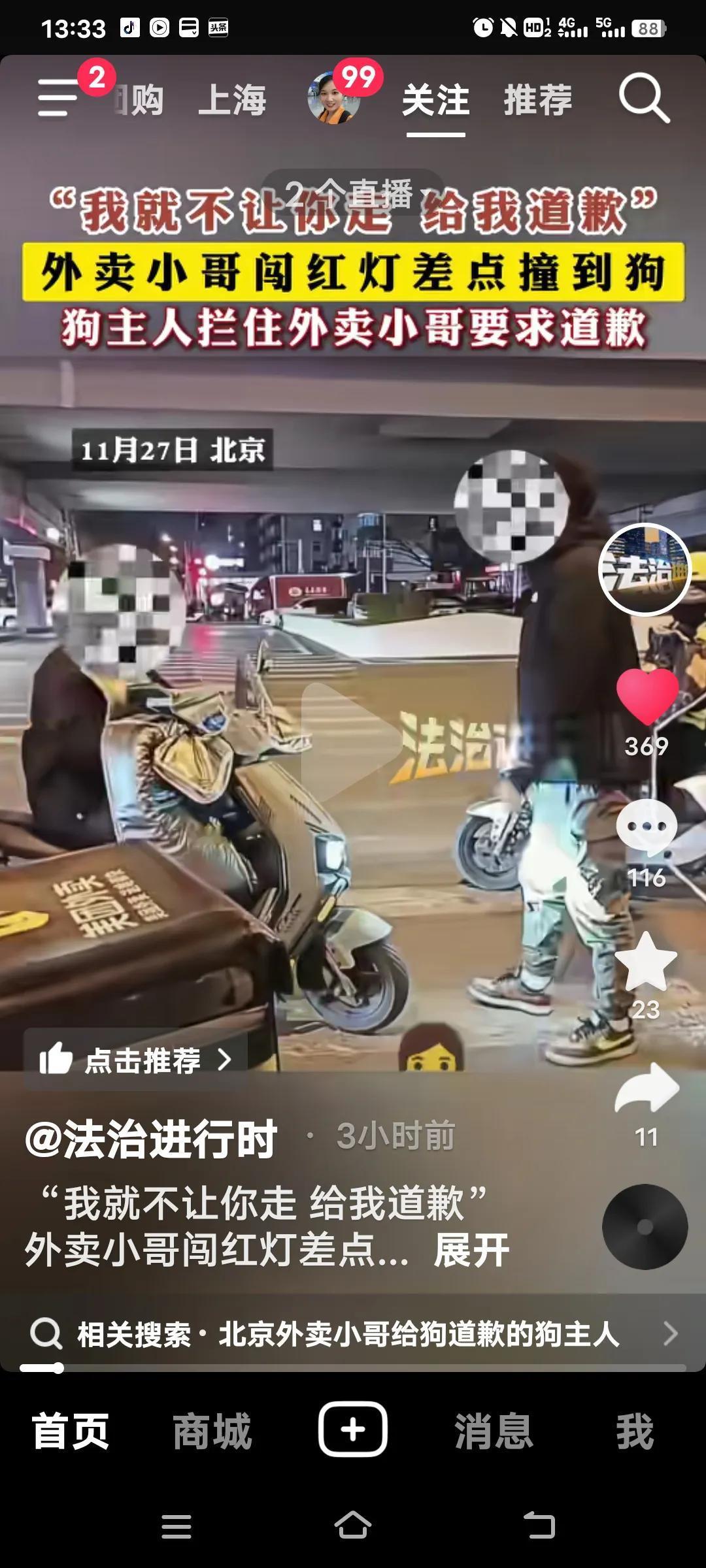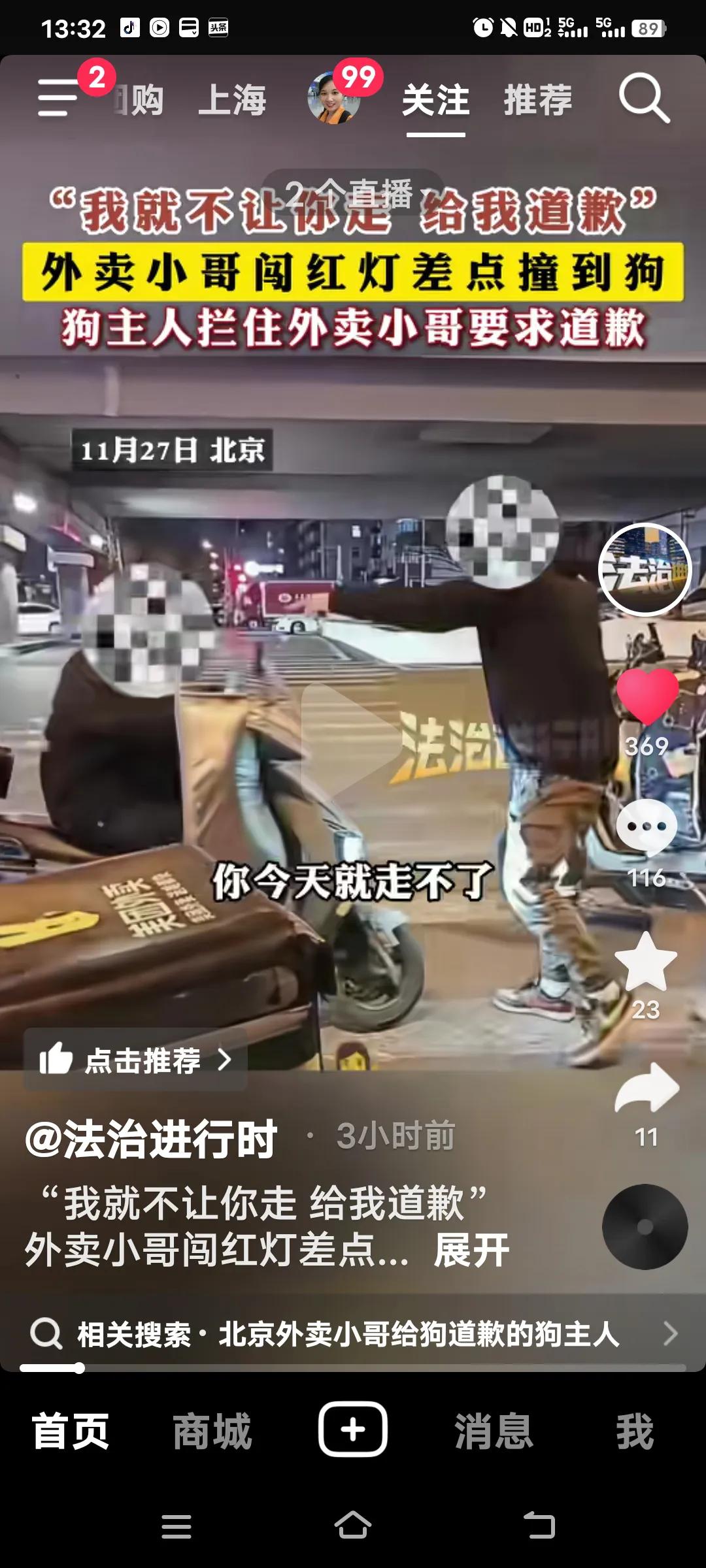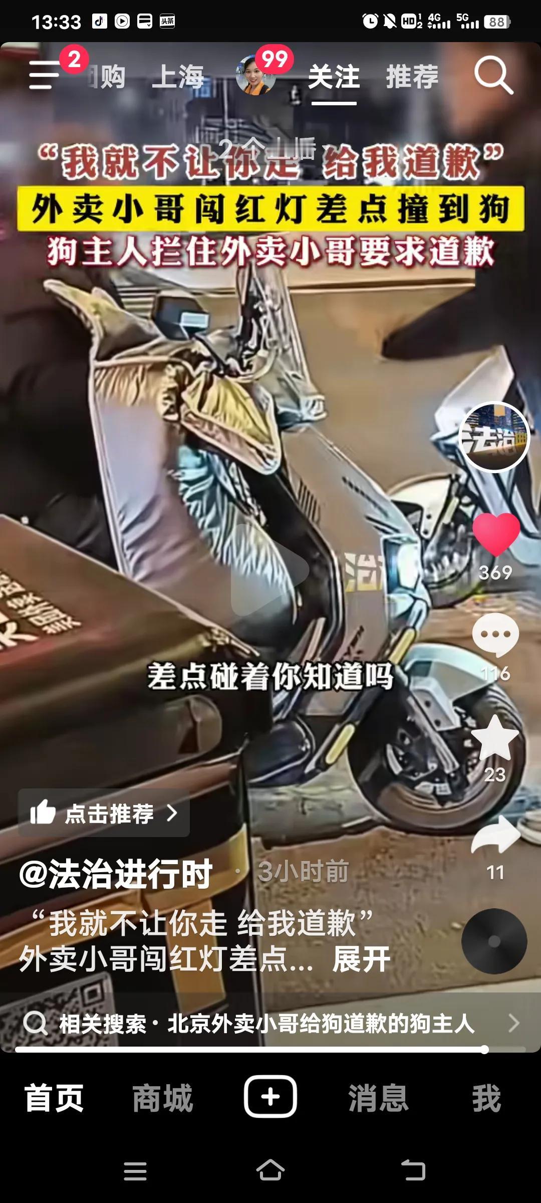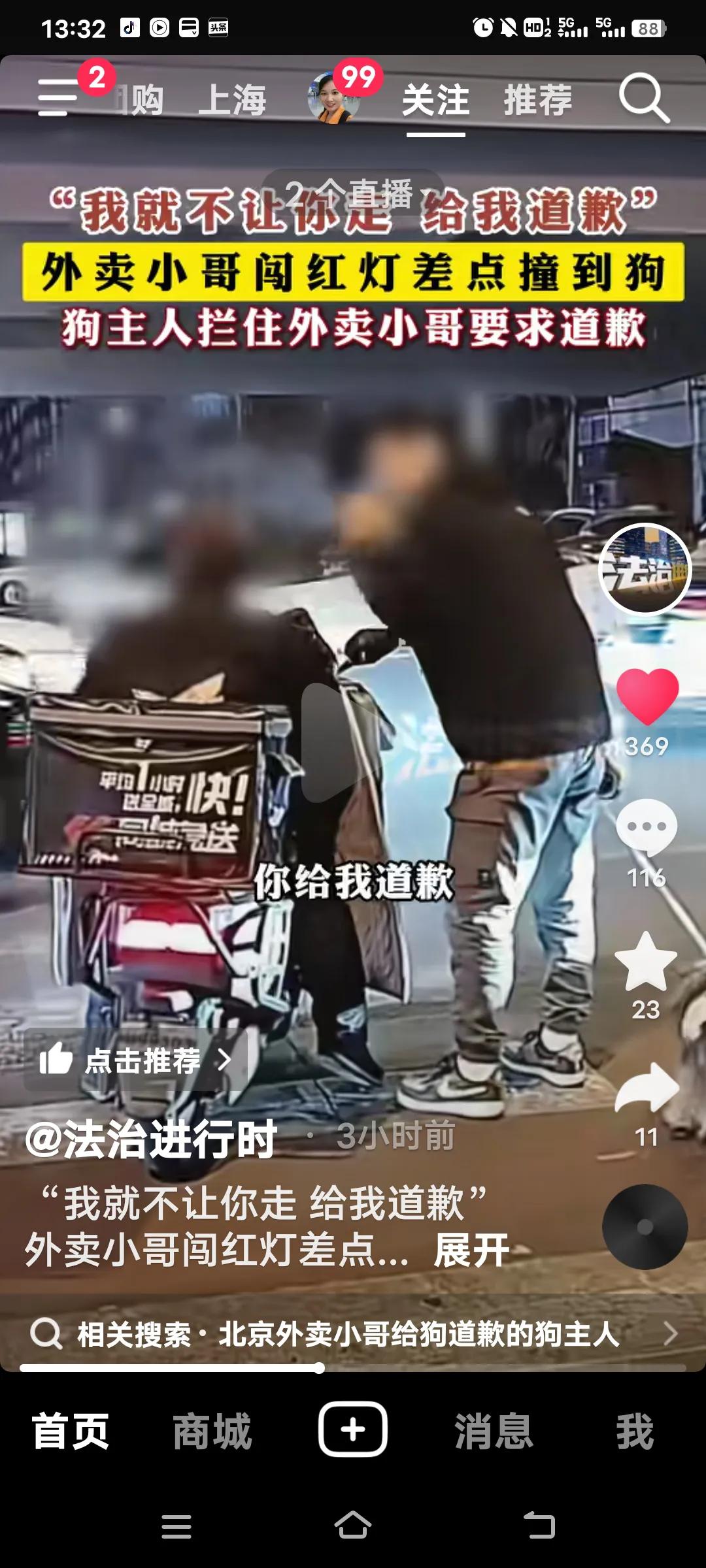 11月27日,北京一外卖小哥,闯红灯差点撞到狗。狗主人非得让外卖小哥道歉,外卖小哥说我没有撞到你的狗。狗主人说,我没有让你给我的狗道歉,“你必须给我道歉”。外卖小哥就说你牵多大的绳子等扭论! 一句话讲到底,外卖小哥就是不愿意道歉。狗主人就说,“你今天不给我们道歉就别想走,”俩人就在那里杠上了。 说句实话,这狗主人也不是不讲道理的人,道歉又有什么关系啊?闯红灯就是错误的。要是本身善良不用人争,出自内心就能说句对不起。本来没有多大的事情有时候短短的几个字让人心里暖暖的。 这样犟着也耽误自己送外卖是不是呀?评论区里很多网友也不赞成卖小哥的做法。有人说闯红灯应该给人道歉,也有人说闯红灯上头了等看法。 生活中难免会遇到一点小问题,动一下嘴就解决了,却不愿张嘴。以前我也是觉得外卖小哥不容易,看来这人与人的确不一样呀!不是每个人都值得同情!送外卖事故 外卖事故 外卖员防卫过当