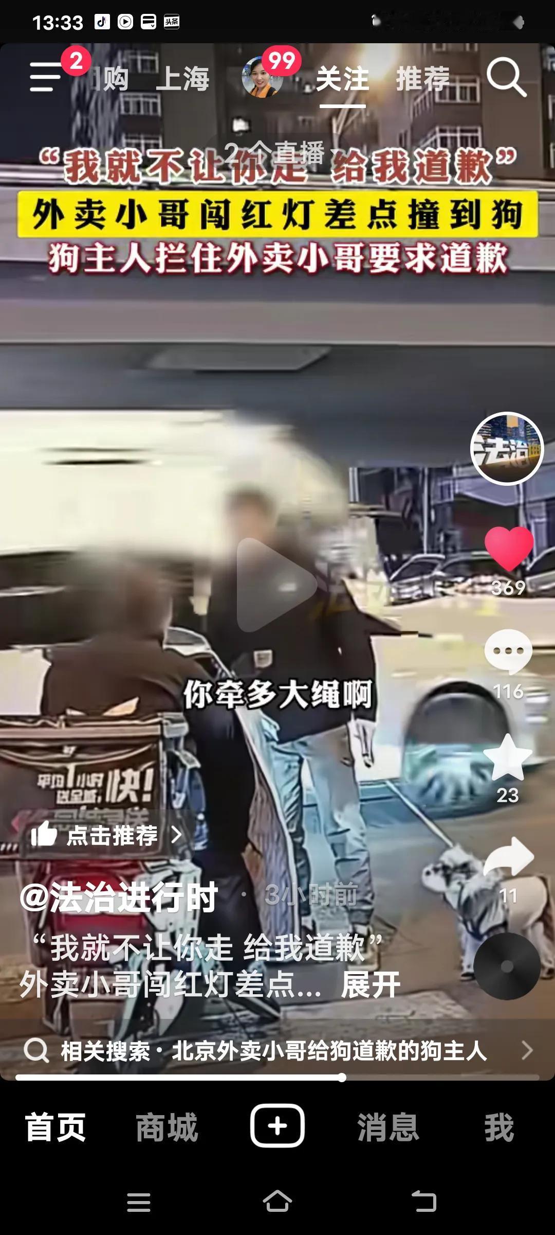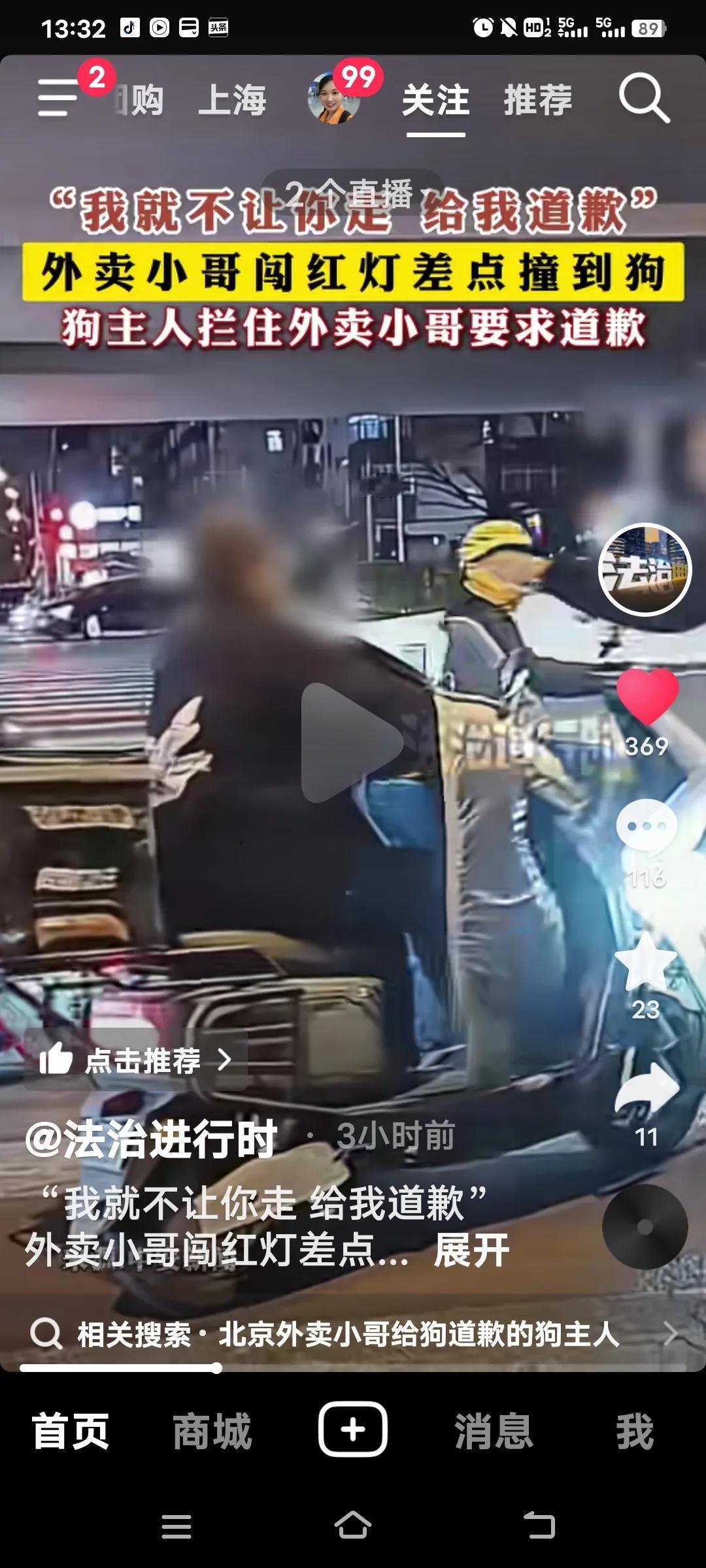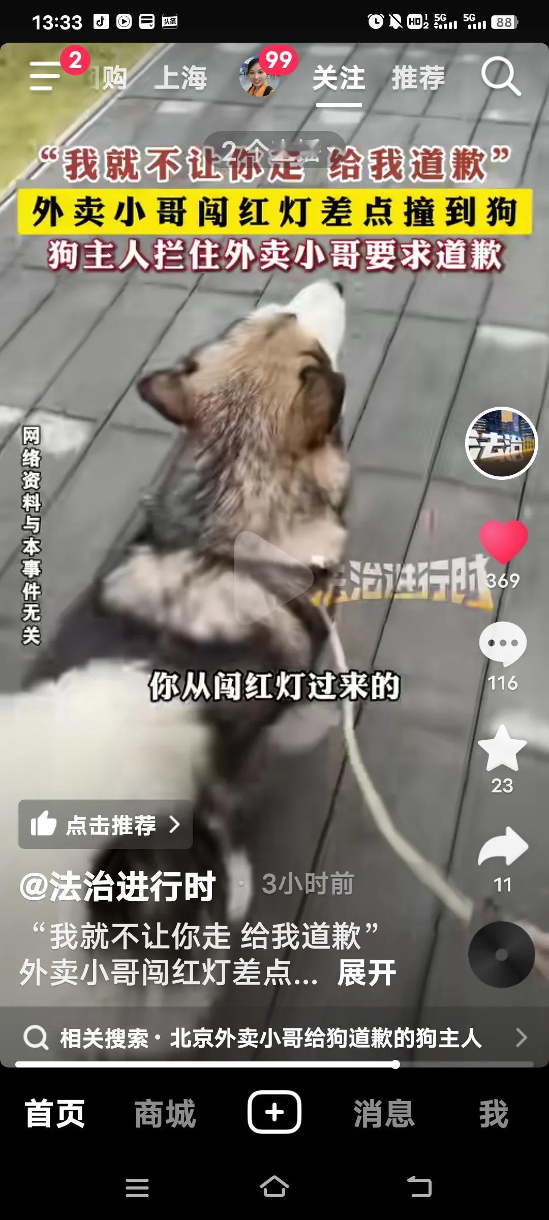11月27日,北京一外卖小哥,闯红灯差点撞到狗。狗主人非得让外卖小哥道歉,外卖小哥说我没有撞到你的狗。狗主人说,我没有让你给我的狗道歉,“你必须给我道歉”。外卖小哥就说你牵多大的绳子等扭论! 一句话讲到底,外卖小哥就是不愿意道歉。狗主人就说,“你今天不给我们道歉就别想走,”俩人就在那里杠上了。 说句实话,这狗主人也不是不讲道理的人,道歉又有什么关系啊?闯红灯就是错误的。要是本身善良不用人争,出自内心就能说句对不起。本来没有多大的事情有时候短短的几个字让人心里暖暖的。 这样犟着也耽误自己送外卖是不是呀?评论区里很多网友也不赞成卖小哥的做法。有人说闯红灯应该给人道歉,也有人说闯红灯上头了等看法。 生活中难免会遇到一点小问题,动一下嘴就解决了,却不愿张嘴。以前我也是觉得外卖小哥不容易,看来这人与人的确不一样呀!不是每个人都值得同情!送外卖事故 外卖事故 外卖员防卫过当