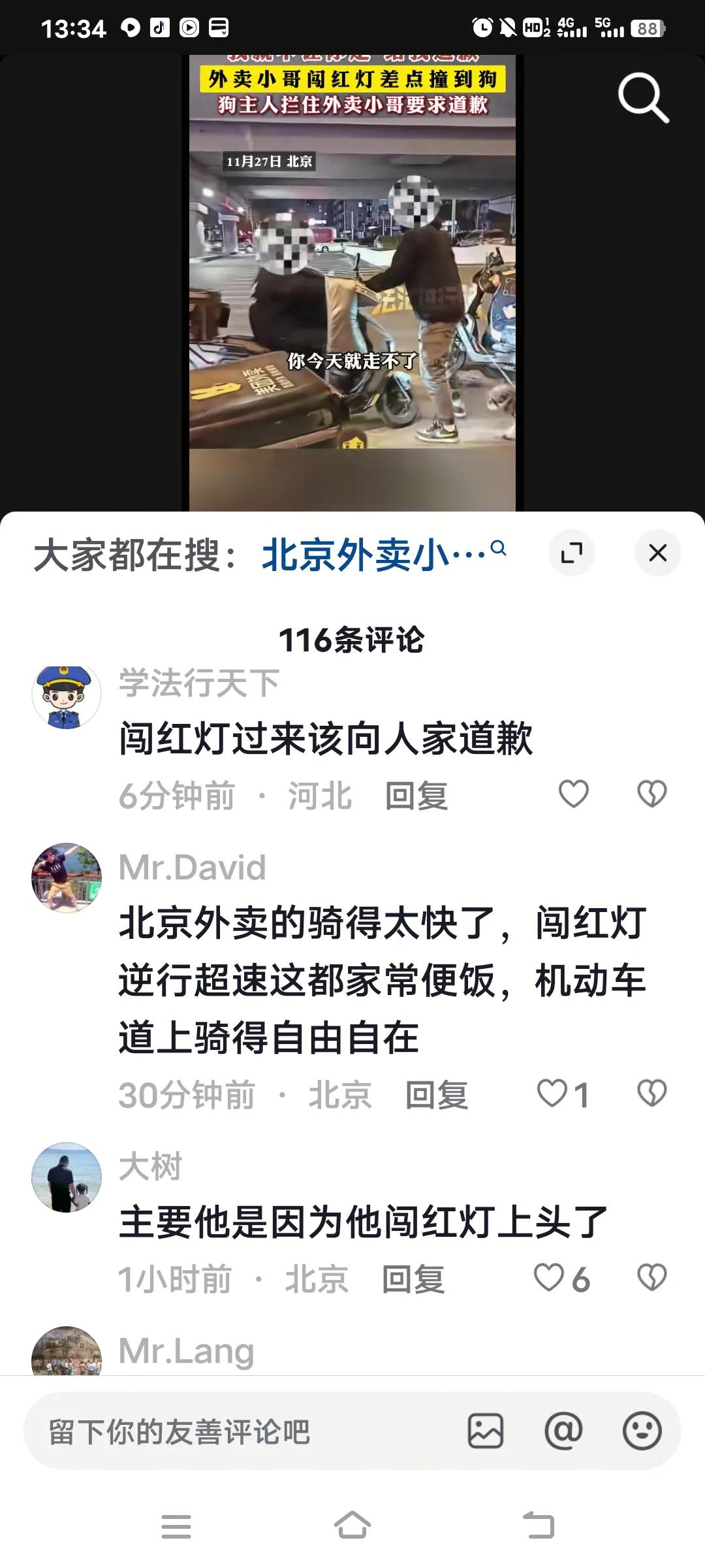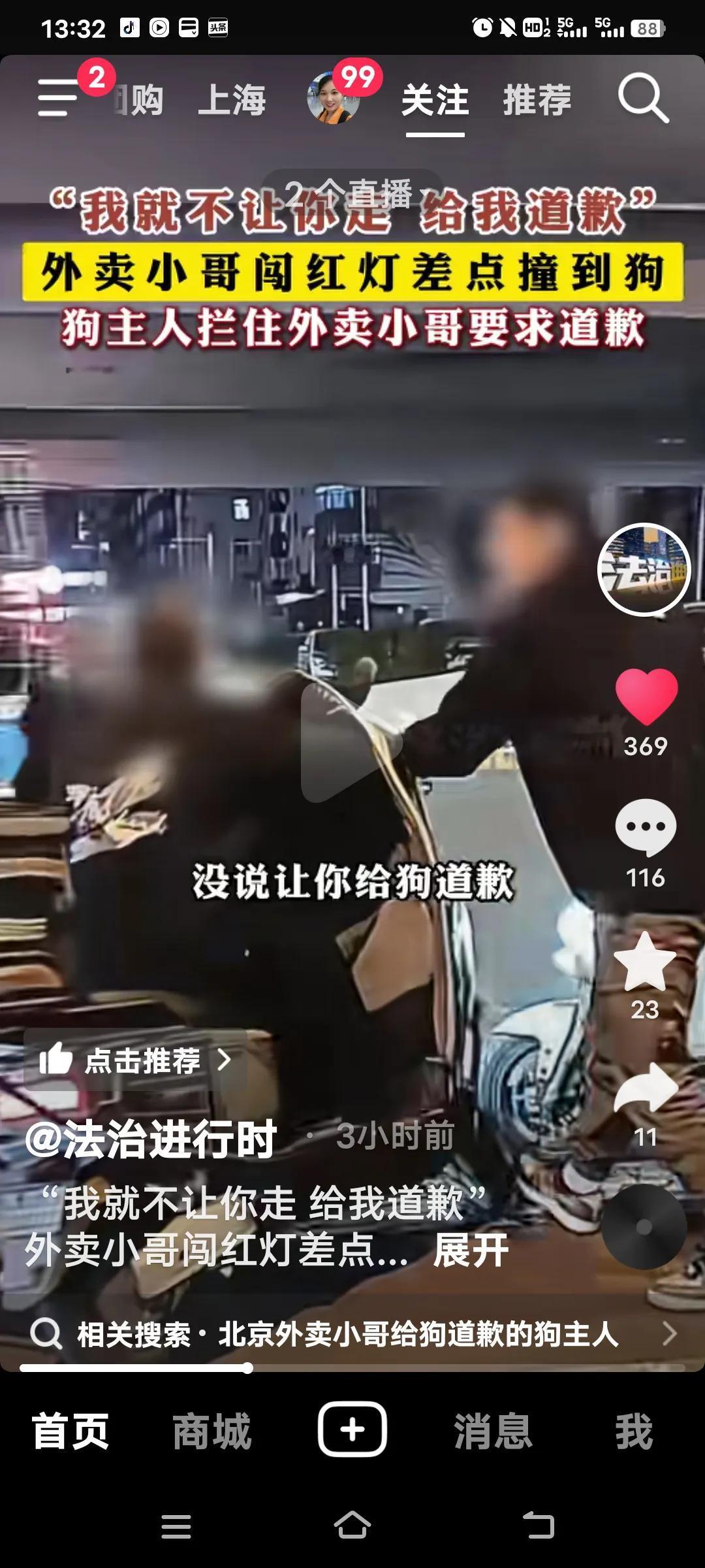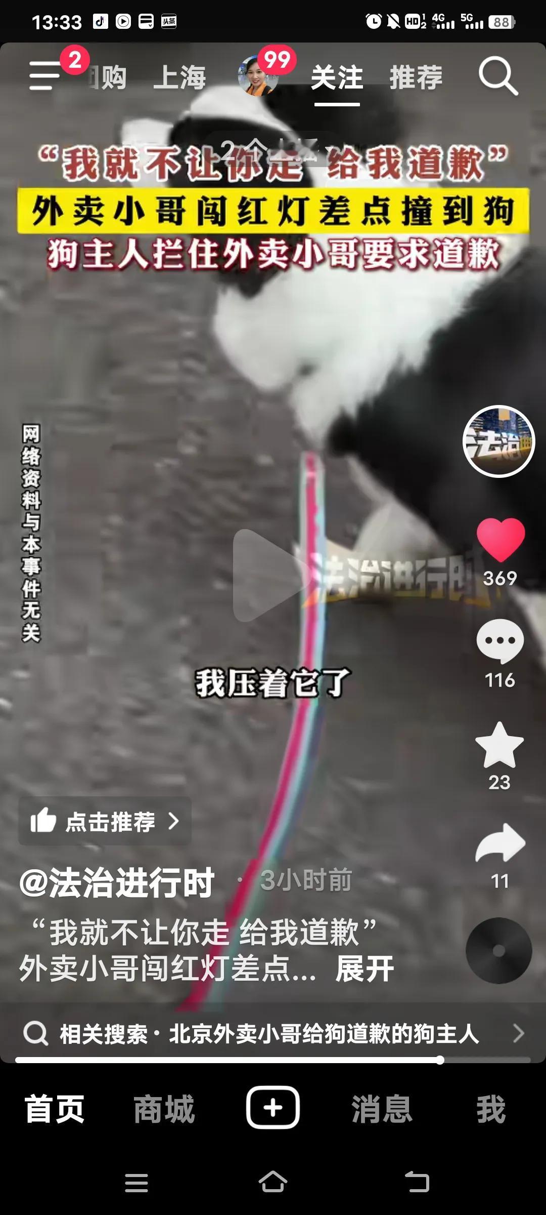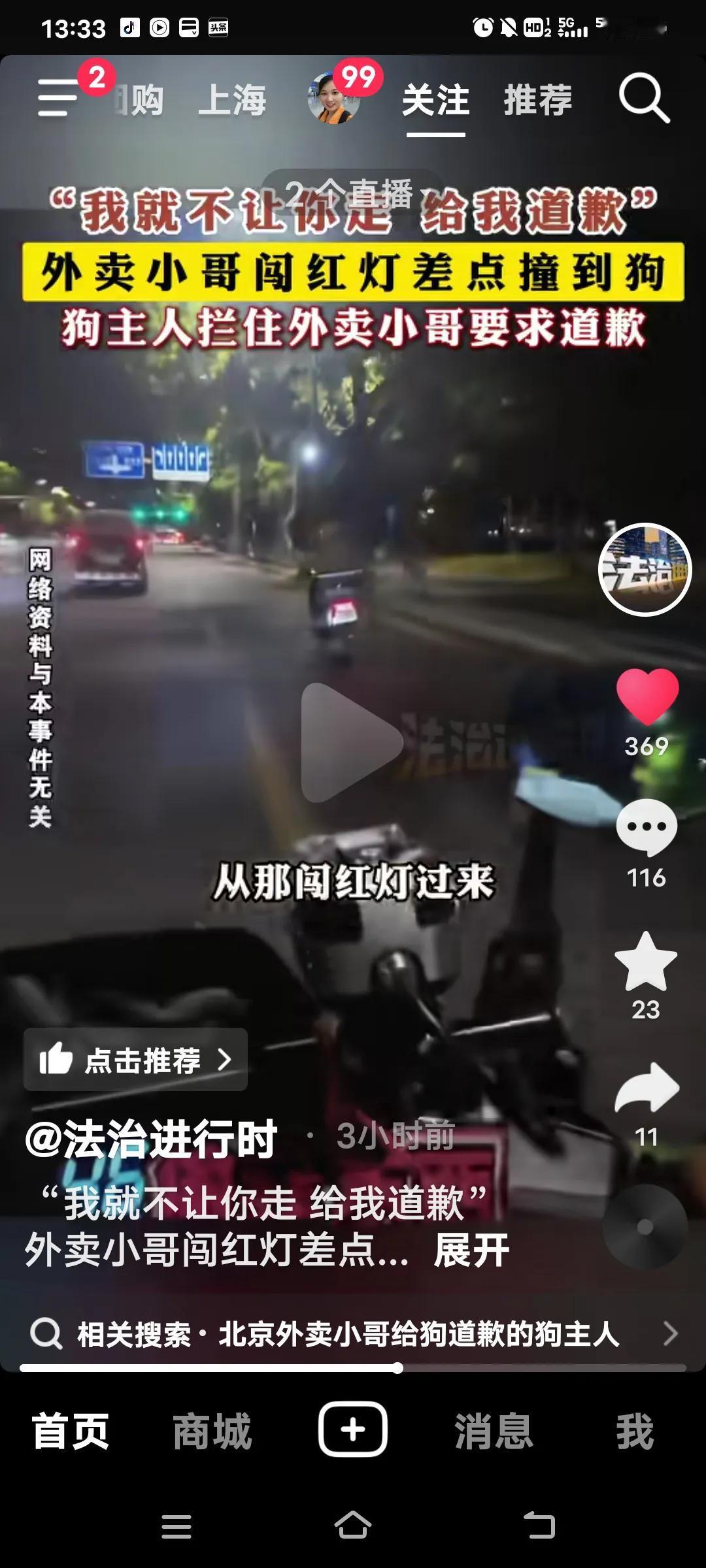 11月27日,北京一外卖小哥,闯红灯差点撞到狗。狗主人非得让外卖小哥道歉,外卖小哥说我没有撞到你的狗。狗主人说,我没有让你给我的狗道歉,“你必须给我道歉”。外卖小哥就说你牵多大的绳子等扭论! 一句话讲到底,外卖小哥就是不愿意道歉。狗主人就说,“你今天不给我们道歉就别想走,”俩人就在那里杠上了。 说句实话,这狗主人也不是不讲道理的人,道歉又有什么关系啊?闯红灯就是错误的。要是本身善良不用人争,出自内心就能说句对不起。本来没有多大的事情有时候短短的几个字让人心里暖暖的。 这样犟着也耽误自己送外卖是不是呀?评论区里很多网友也不赞成卖小哥的做法。有人说闯红灯应该给人道歉,也有人说闯红灯上头了等看法。 生活中难免会遇到一点小问题,动一下嘴就解决了,却不愿张嘴。以前我也是觉得外卖小哥不容易,看来这人与人的确不一样呀!不是每个人都值得同情!送外卖事故 外卖事故 外卖员防卫过当