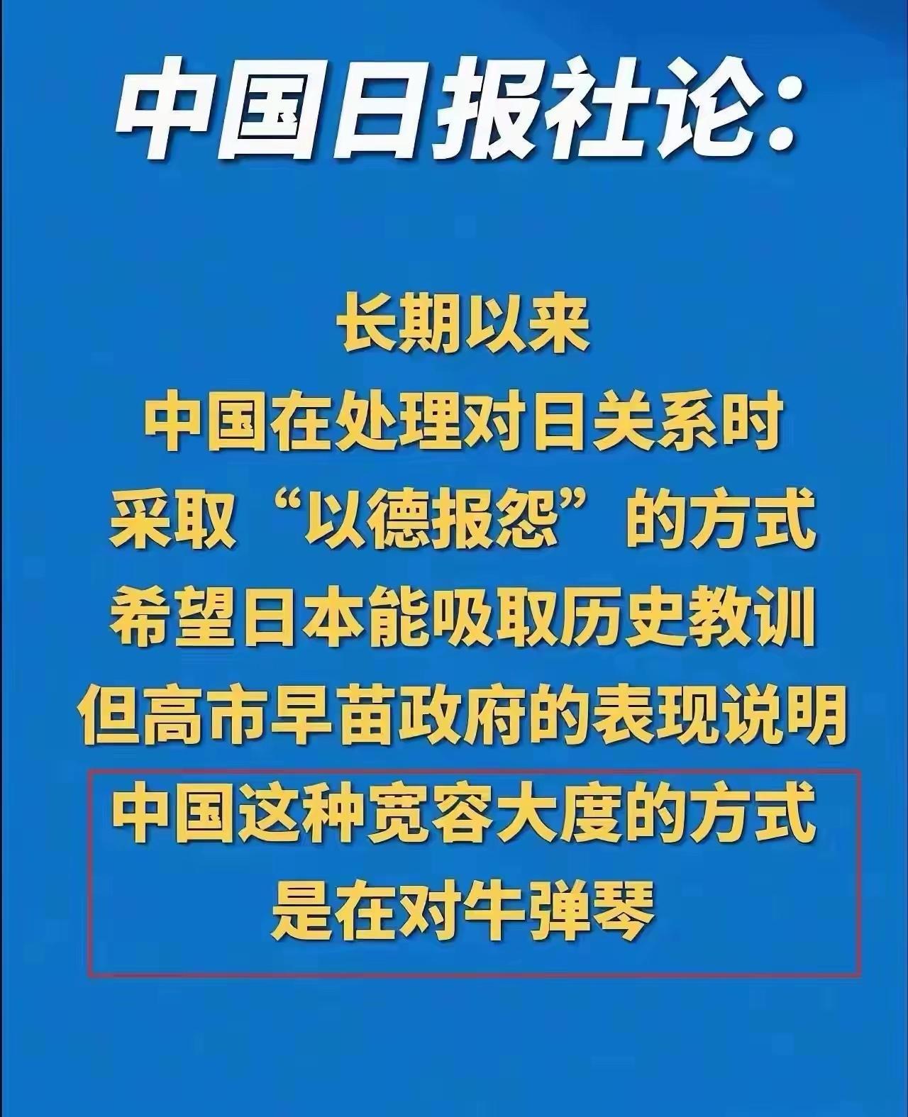 中国日报社论指出:我们在处理中日关系时,常秉持“以德报怨”的态度,始终期望日本能汲取历史教训。然而,高市早苗政府的所作所为表明,我们的这份大度,不过是对牛弹琴! 值得注意的是,“以德报怨”“对牛弹琴”这类成语鲜少出现在官方文稿中。显然,我方对日本的行径已极为愤慨。我们曾以“以德报怨”的方式相待,日本却不仅未回以善意,反倒死不悔改、变本加厉。如此一来,接下来或许要新仇旧恨一并清算!