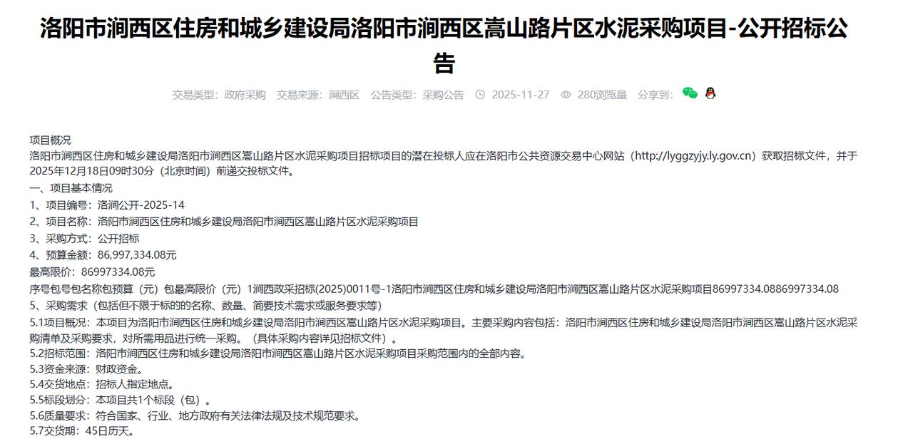 洛阳市涧西区嵩山路片区水泥采购项目-公开招标公告,预算8699.73万元