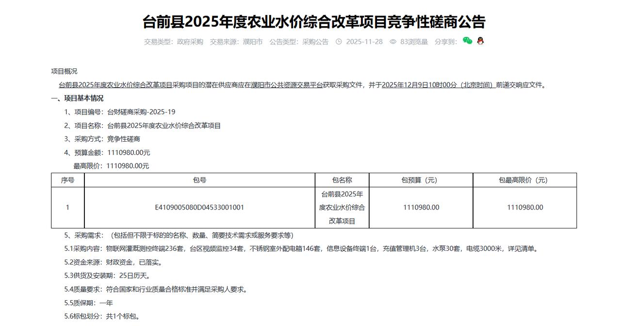 台前县2025年度农业水价综合改革项目竞争性磋商公告,预算111.09万元