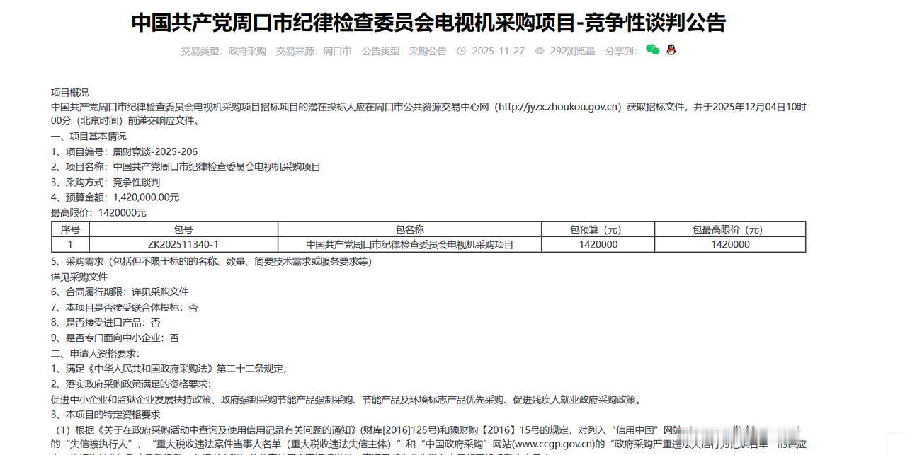 周口市纪律检查委员会电视机采购项目-竞争性谈判公告,预算142万元