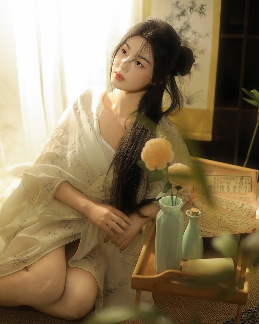 窗边少女,花海相伴,温柔时光