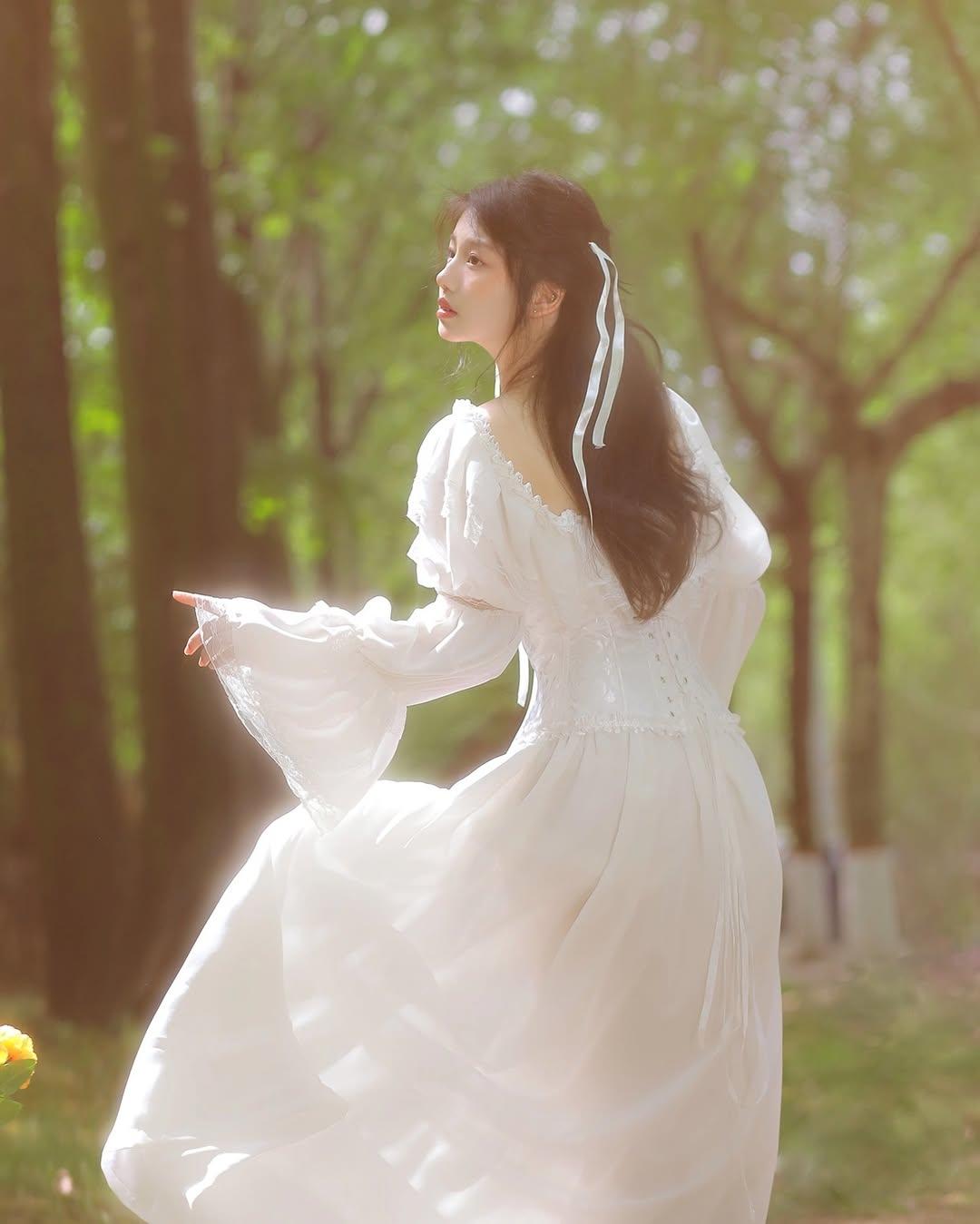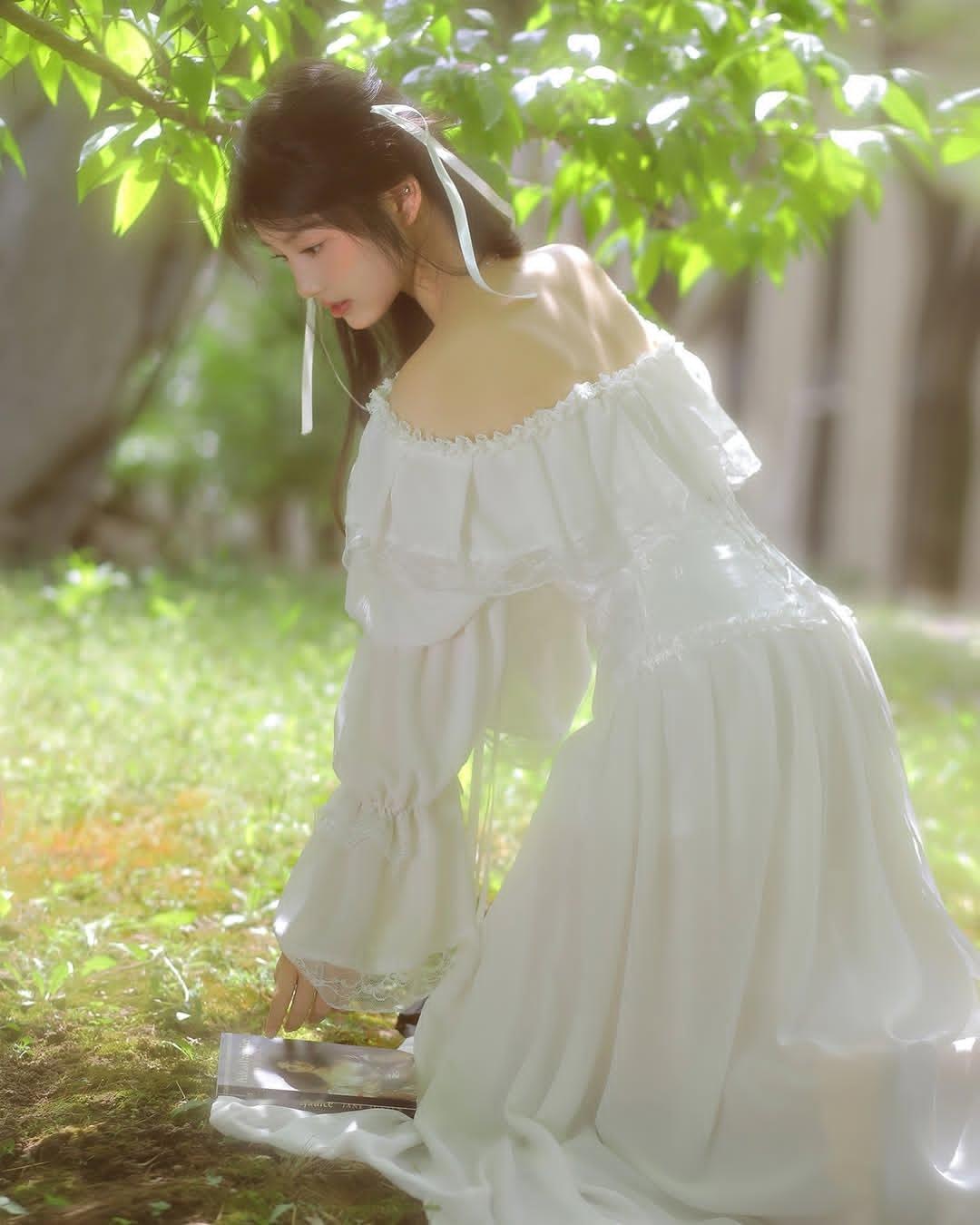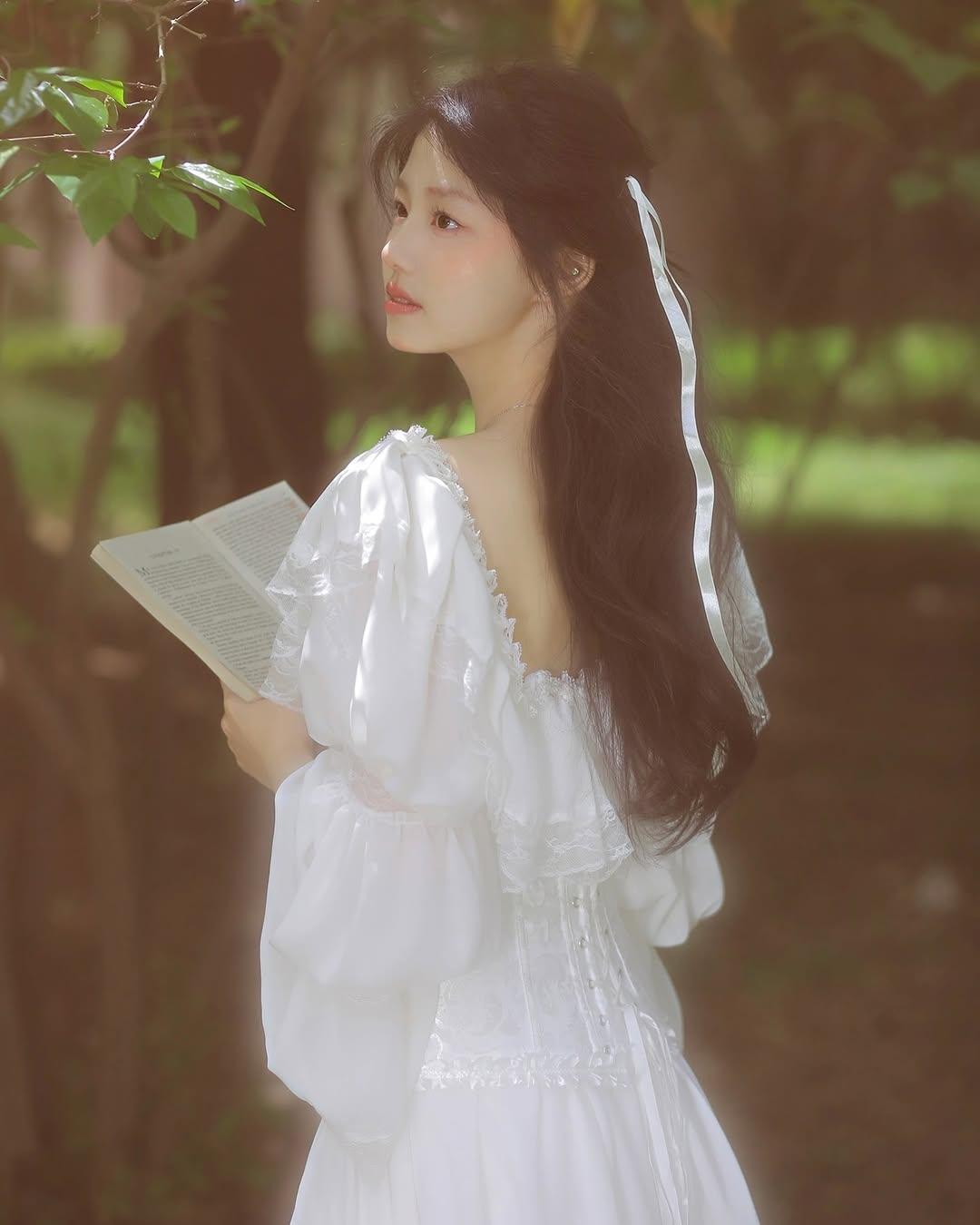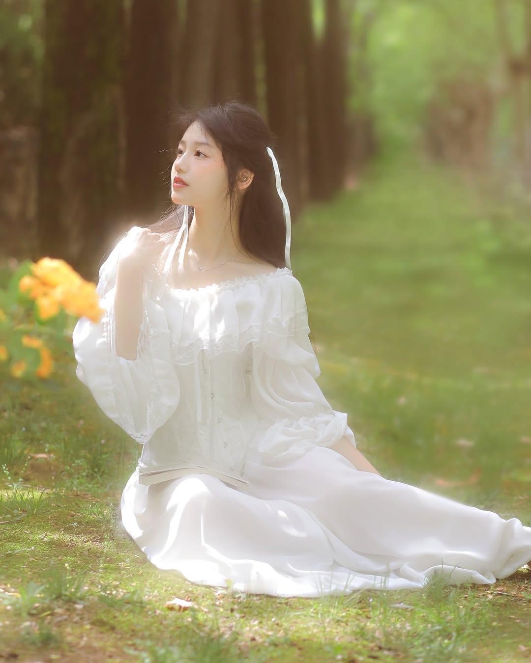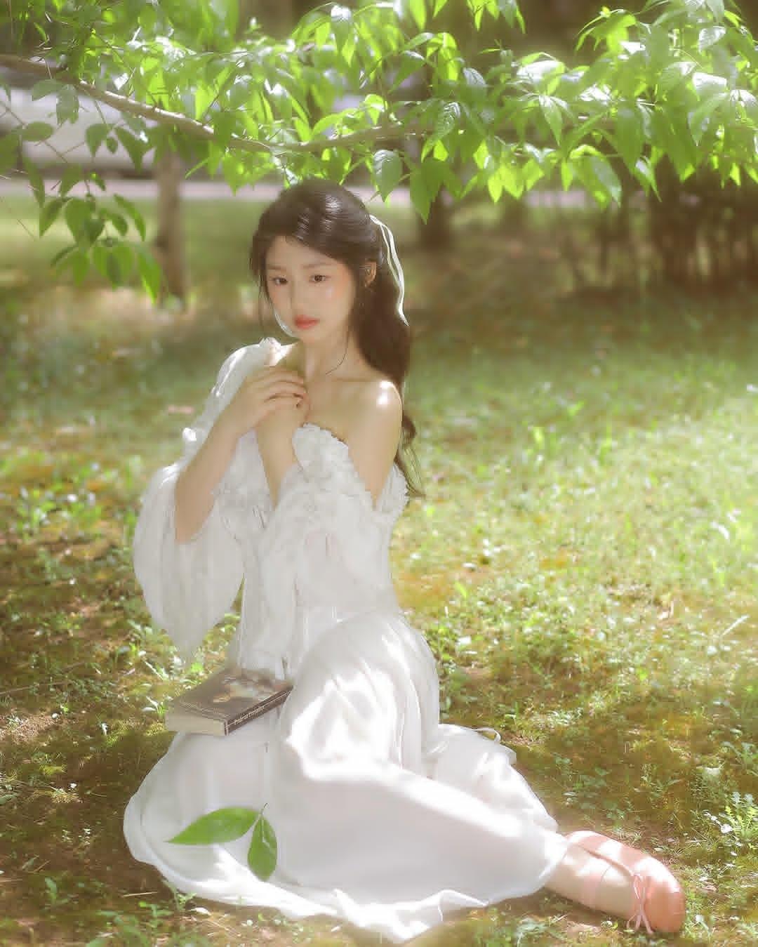 梦幻森林中的白衣少女,静谧阅读的美好时光。