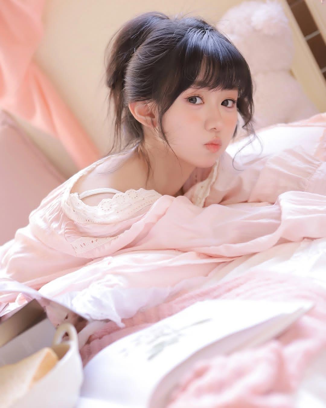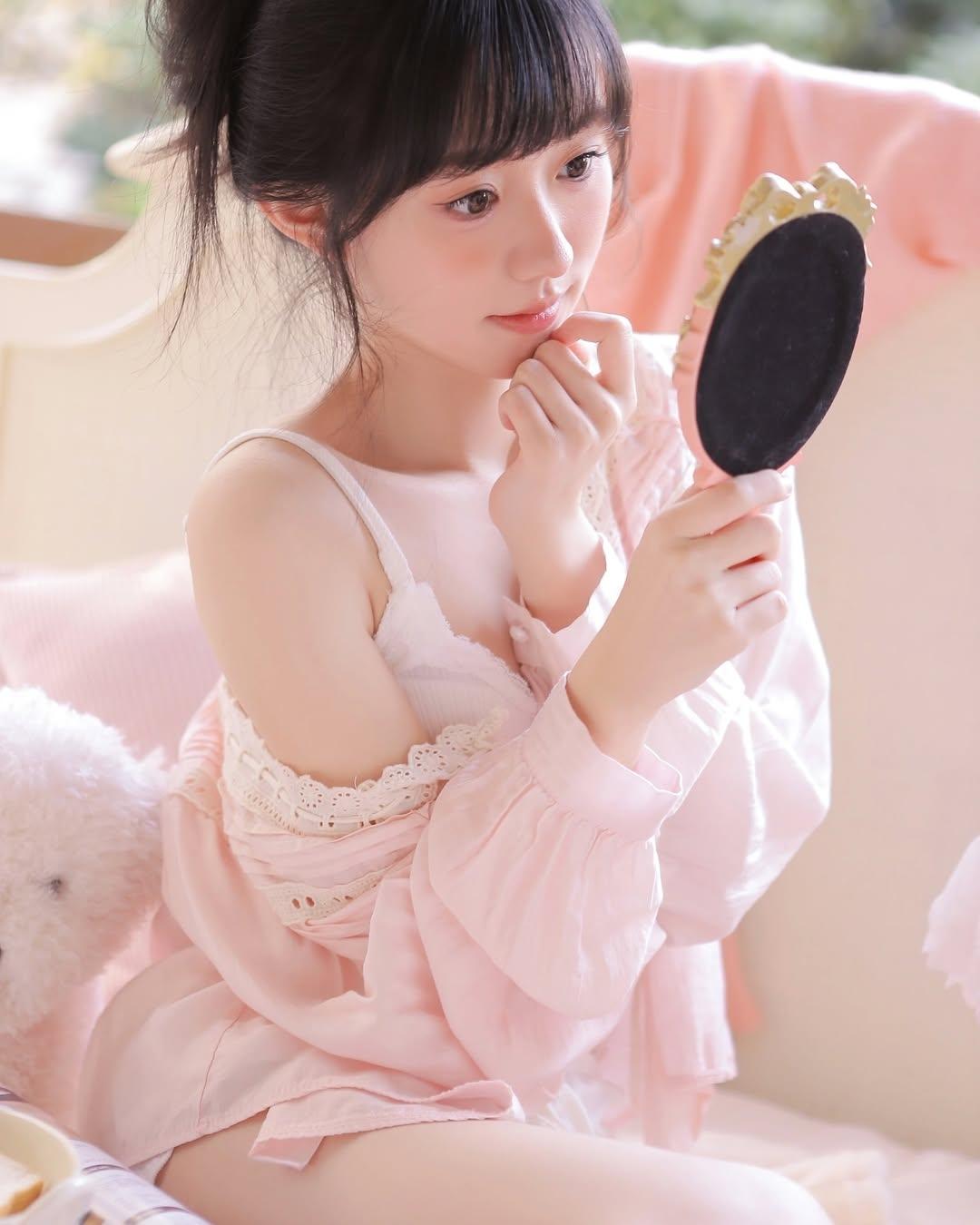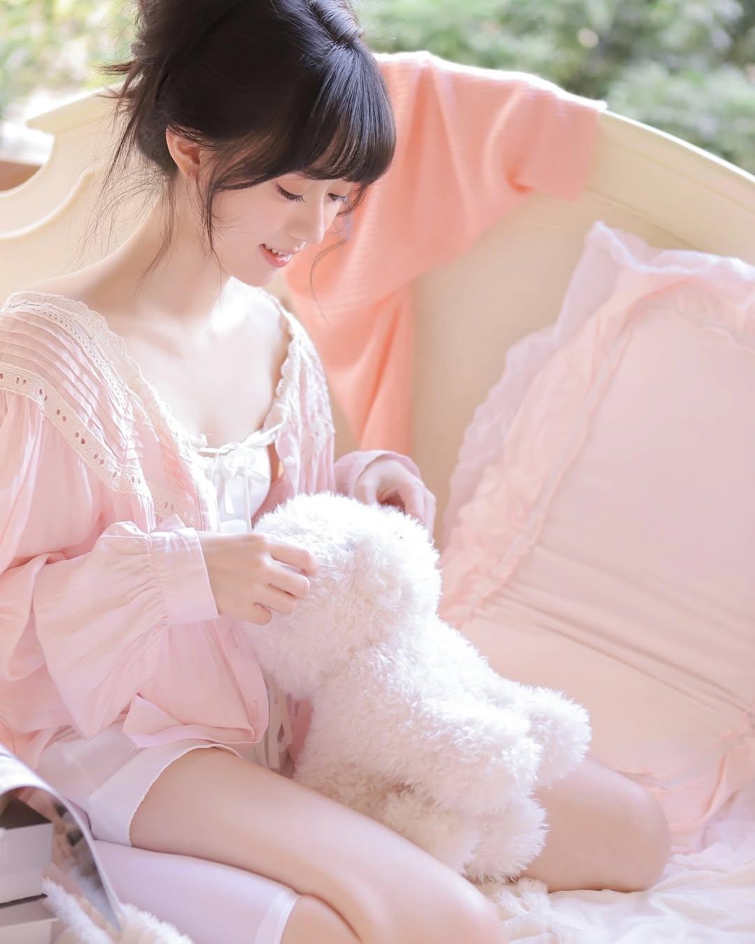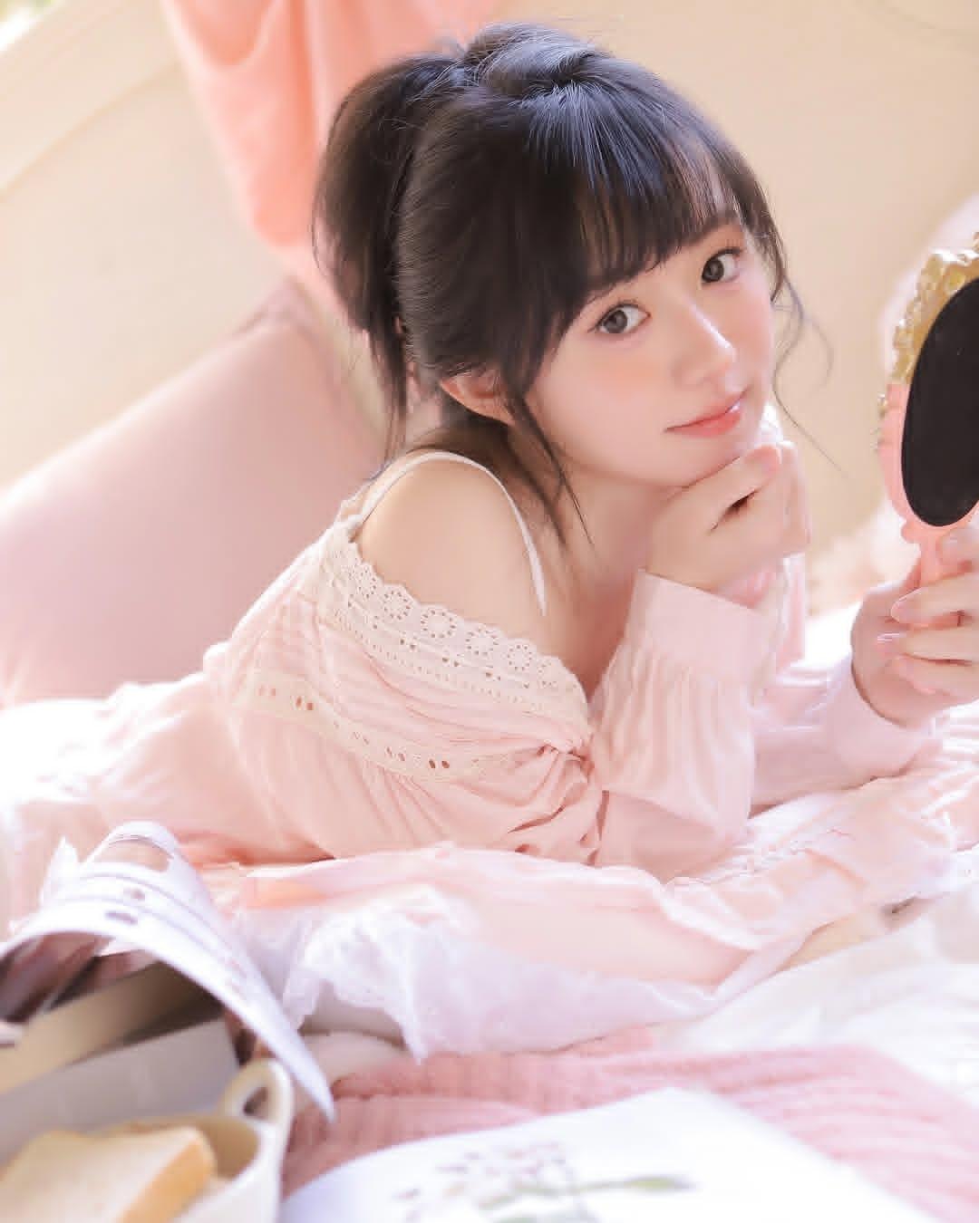 粉衣美人倚枕眠,梦回春日暖阳天。
