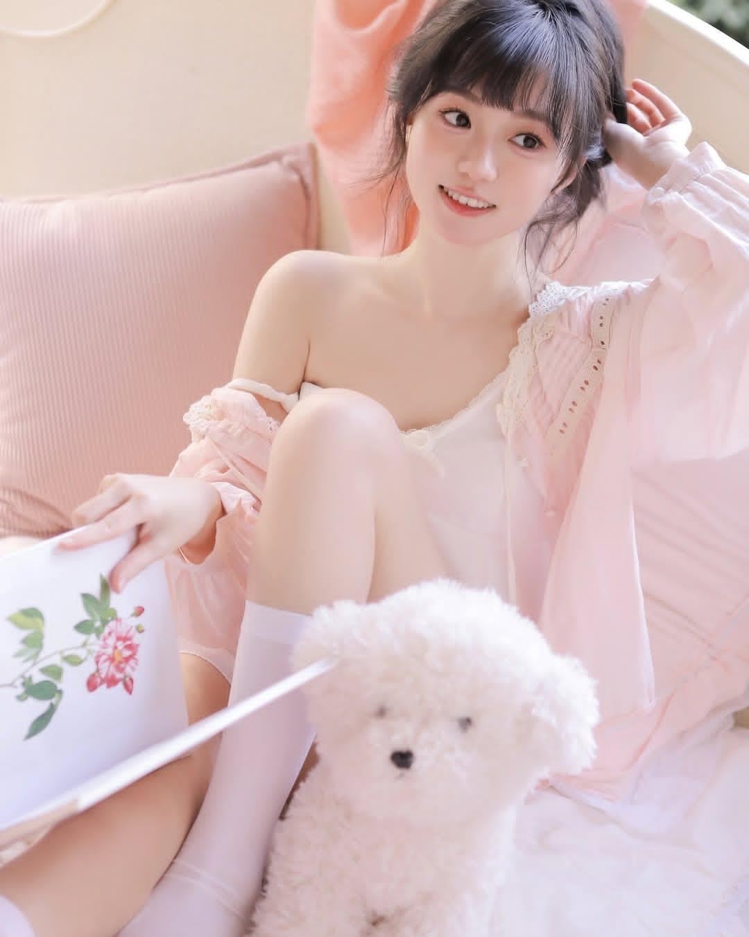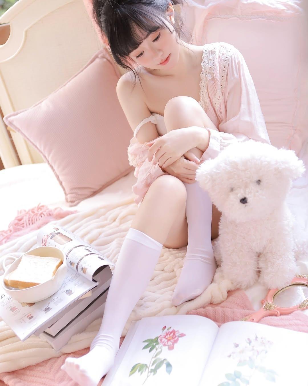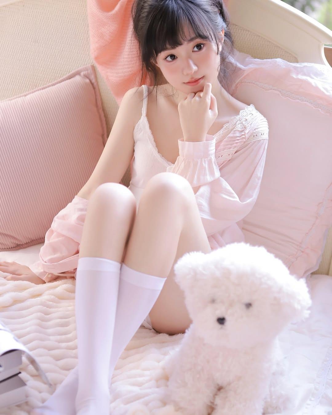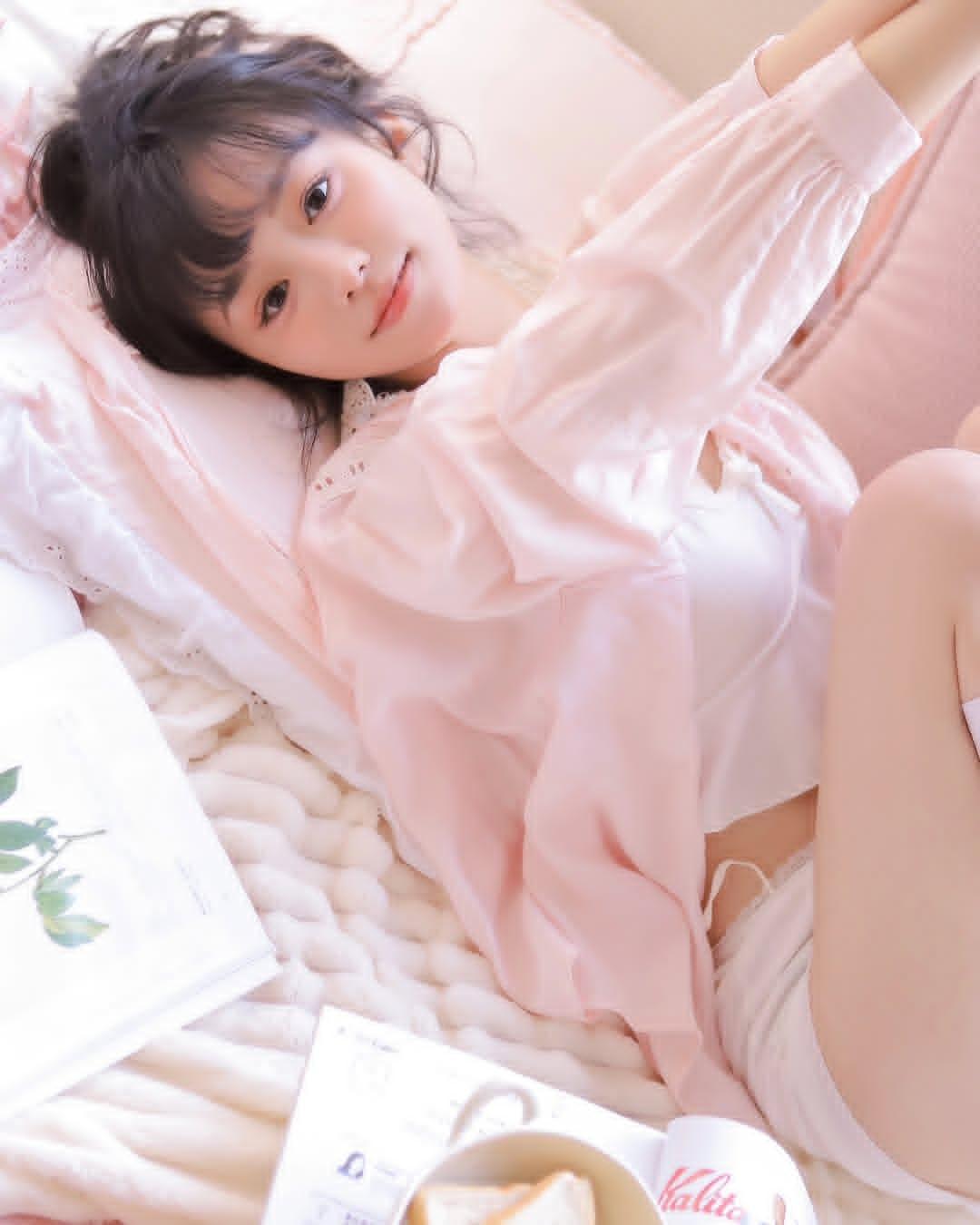 粉衣美人倚枕眠,梦回春日暖阳天。
