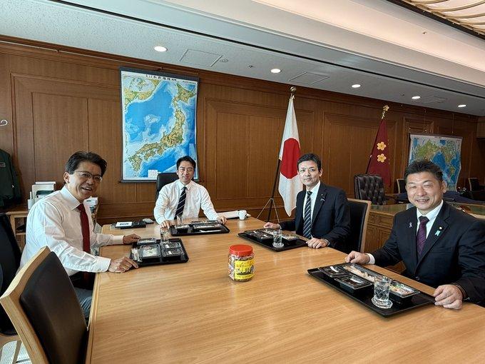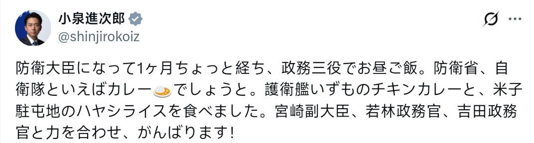 小泉进次郎:我担任防卫大臣至今已过去一个多月,今天与三位政府要员共进午餐。说到防卫省和自卫队,我首先想到的就是咖喱🍛 。我品尝了驱逐舰“出云”号上的鸡肉咖喱和米子驻防区的林氏米饭。我将与宫崎副大臣、若林副大臣和吉田副大臣携手合作,竭尽全力!