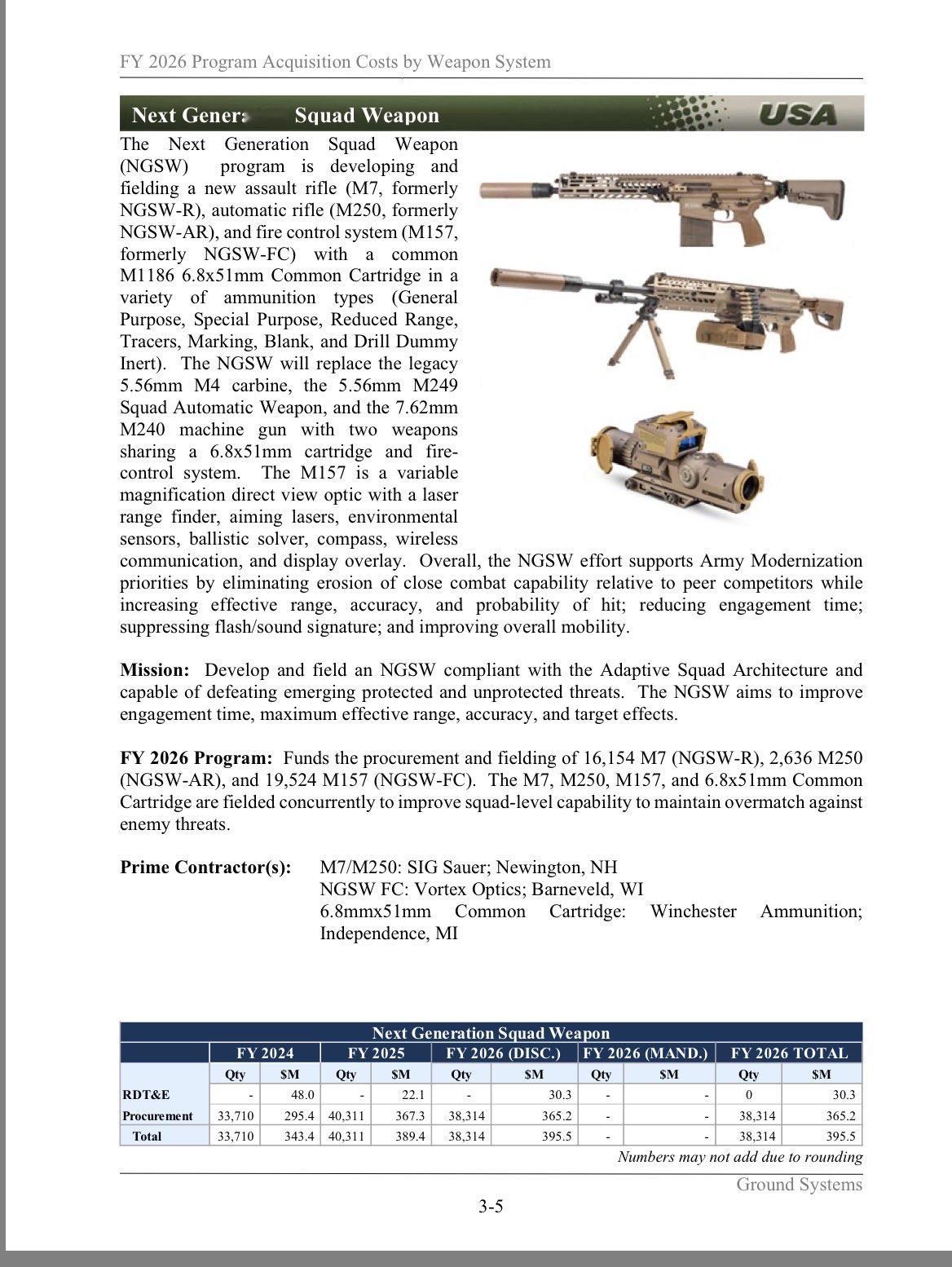 MD三等人2026财年计划:采购和部署16,154支M7步枪(NGSW-R)、2,636支M250自动步枪(NGSW-AR)和19,524具M157瞄具(NGSW-FC)。