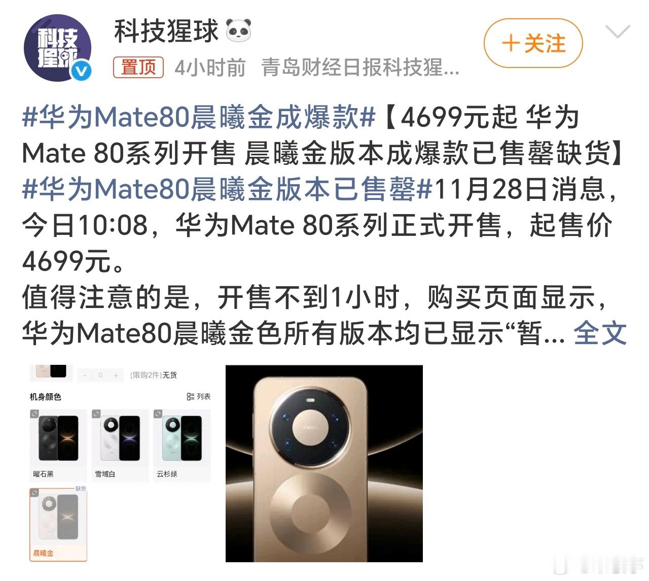 华为Mate80晨曦金版本已售罄这需求太高,太抢手了,大家买到了吗?