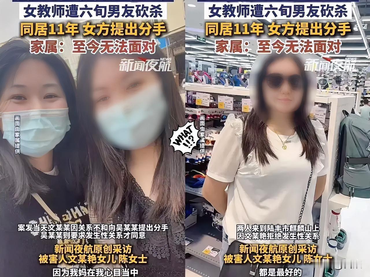 拒绝野外性行为, 女教师被男友用斧头砍杀。 女儿说:我不相信她死了!要死刑报仇!发生在四川的这起案件,令人心痛!女儿无法接受母亲就这么离开了,她说:“我妈妈是个好人!”死去的文老师,是一名女教师,和她的男友同居11年。男友如此残忍,文老师到底拒绝了什么?竟然让他下得了狠手?据警方通报:嫌犯刘某与受害人文某某系男女朋友关系。某天,两人在野外发生争吵。嫌犯刘某拿起斧头将受害人砍死,潜逃。文老师和男友同居11年,难道不清楚他的为人?为何还要和他在一起?有网友分析:女教师的坚守,让她有了好名声,却成了她生命的导火索。文老师坚守的底线,是作为教育者的体面。她拒绝的不仅仅是和男友在野外发生性关系,还有作为教育者的羞耻。亲密关系中的拒绝权,被剥夺的情况,是最可怕的。法律要为逝者伸张正义!也希望能有更多的人看到,选择伴侣,要看人品!要有底线!不能贪图一时享乐!或者一时孤单!给自己选择伴侣,留下的风险评估报告。 咱就想问,11年的同居都没看清对方的真面目,这到底是遇人不淑还是隐忍太久?如果是你,面对亲密关系里的不合理要求,会果断拒绝吗?来评论区说说你的看法!