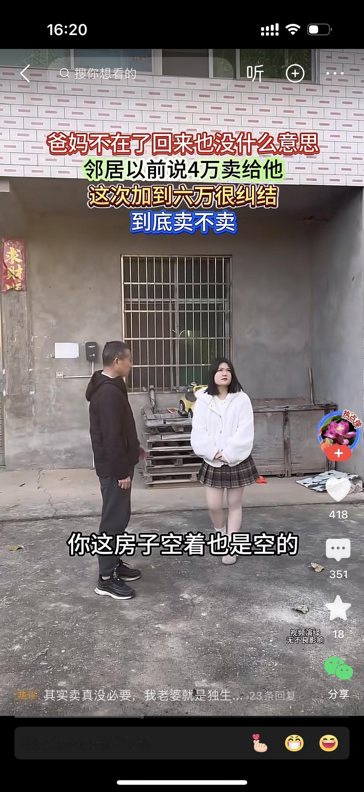 女子的爸妈都去世了。没有兄弟姐妹的她独得父母留下的一栋老房子。女子的夫家离娘家很远。父母留下的这老宅让她很纠结,卖也不是,不卖也不是。邻居天天缠着她要买这房子,以前出4万,现在加到6万了。邻居说,你爸妈都不在了,这房子空着也是空着,6万块钱卖给我算了。女子却还是犹豫不决,毕竟这是自己小时候十几年的家,是自己的根。女子最后拒绝了,她跟邻居说,这里永远都是我的家,我会常回家看看。