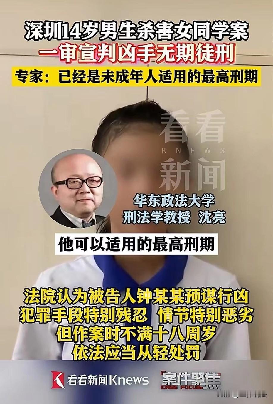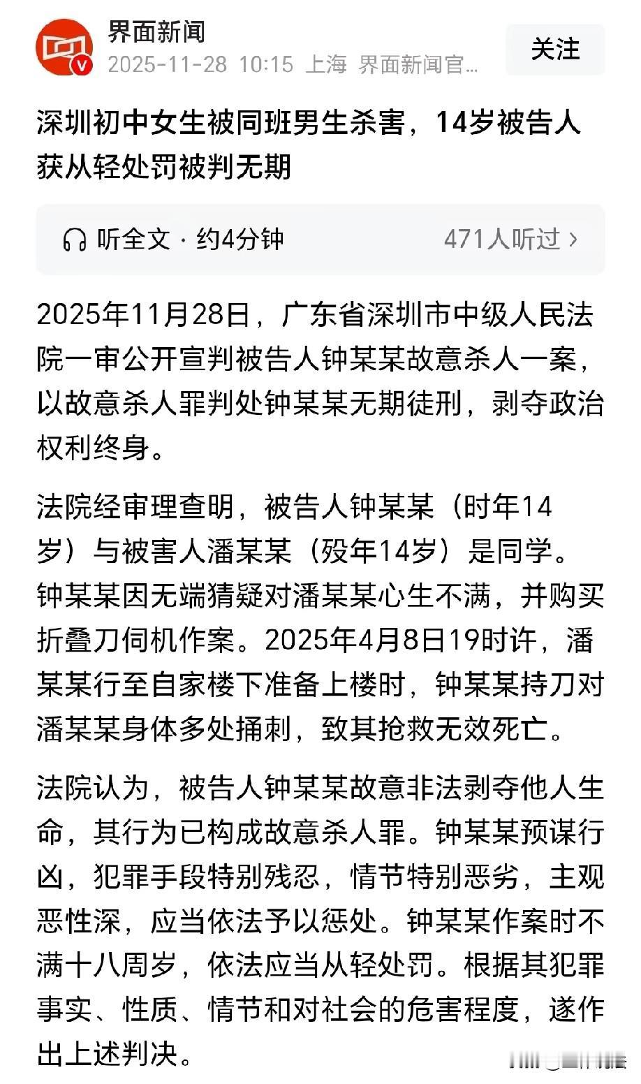 必须死刑!广东深圳,男孩因一些生活琐事,对同住一个小区的女同学心生不满,他偷偷网购折叠刀,趁她放学回家之际,捅刺女同学。逃离现场后,看到女同学倒地求救,男孩又折返回来捅刺多刀,直至女同学死亡。被提起公诉后,法官认为男孩构成故意杀人罪,手段残忍,应予严惩,奈何男孩只有14周岁,只能依法判处有期徒刑。女孩母亲:必须给男孩判处死刑。 2025年11月28日,随着法槌落下,男孩钟某某被法院依法判处无期徒刑,剥夺政治权利终身。 说起这一切,还要从案发那个下午开始,原本是放学回家的温馨时刻,却被一场突如其来的血腥暴力彻底打破。 那天,14岁的钟某某攥着手里的折叠刀,把心中聚集已久的愤怒,全部刺向同班女孩潘某某。 钟某某、潘某某和另一名同学陈某某不仅是初三同班同学,还同住一个小区。 从初一开始,陈某某的父亲和潘某某的父亲就轮流负责接送三人上下学,这份朝夕相伴的情谊,在钟某某看来却渐渐变了味。 一些微不足道的争执、无意的玩笑,都被他解读为针对自己的敌意,无端的猜疑像藤蔓一样缠绕着他的内心,让他对潘某某的不满与日俱增。 2025年4月8日下午放学后,钟某某提前回到小区,没有像往常一样回家,而是径直走向潘某某家所在的楼栋。 他从书包里掏出那把网购来的黑色折叠刀,躲在楼道拐角,带着宣泄怨恨的冲动,静静的等待着时机。 傍晚7点左右,潘某某背着书包,像往常一样轻快地走到自家楼下,正准备上楼时,钟某某突然从阴影中冲了出来。 没等潘某某反应过来,冰冷的刀刃就已经连续刺向了她的身体。 突如其来的剧痛让潘某某瞬间倒地,她忍着疼痛拼命呼救,声音里充满了恐惧与绝望。 钟某某见状,慌乱地逃离了现场。 可刚跑出去没几步,听到潘某某的呼救声,他心中的恶念再次占了上风,竟又折返回来,对着倒地的潘某某连刺数刀,直到确认潘某某不再动弹,他才仓皇逃离。 路过的邻居发现倒在血泊中的潘某某后,立即拨打了急救电话和报警电话。 医护人员赶到时,潘某某已经奄奄一息,尽管全力抢救,最终还是因伤势过重不幸离世。 法医鉴定后得出结论,潘某某系被锐器刺切胸部、背部以及左锁骨下,导致心脏贯通创伤、双肺破裂、锁骨下静脉破裂,最终因失血性休克死亡。 公安机关经过侦查,以故意杀人罪对钟某某立案侦查,随后移送检察机关审查起诉。 检察机关审查发现,钟某某主管恶性强,犯罪手段极为残忍,性质非常恶劣,当即提起公诉。 案件开庭审理时,钟某某的父亲当着曾女士的面下跪磕头,希望能得到她的谅解,给钟某某一个从轻发落的机会。 可失去女儿的痛苦太深,曾女士根本无法释怀,执意要求对钟某某判处死刑,给她女儿一个公道。 更气人的是,钟某某还多次表达了想回到学校、回归正常生活的愿望,甚至在法庭上向曾女士磕头忏悔,念叨着自己“不应该恩将仇报”。 可这份迟来的忏悔,终究无法挽回逝去的生命,也无法抚平曾女士内心的愤怒。 法院经审理认为,钟某某故意非法剥夺他人生命,其行为已构成故意杀人罪。他预谋行凶,犯罪手段特别残忍,情节特别恶劣,主观恶性极深,本应依法严惩。 但考虑到钟某某作案时不满十八周岁,依据相关法律规定应当从轻处罚。 《刑法》第四十九条明确规定:犯罪的时候不满十八周岁的人和审判的时候怀孕的妇女,不适用死刑。 这里的死刑既包括死刑立即执行,也涵盖死刑缓期二年执行。 本案中,钟某某作案时年仅14岁,远未达到18周岁的标准,这是其绝对不能被判处死刑的核心法律依据。 法律作此规定,是因为未成年人身心发育尚未成熟,认知和自控能力较弱,仍有教育挽救、改过自新的可能,也是我国履行《儿童权利公约》相关义务的体现。 法律基于人道主义精神,给予其改过自新的机会,而非直接剥夺生命,这更是现代法治文明的重要体现。 《刑法》第十七条规定:已满14周岁不满16周岁的人,犯故意杀人等八种严重罪行的,应当负刑事责任;且已满12周岁不满18周岁的人犯罪,应当从轻或者减轻处罚。 钟某某的行为已构成故意杀人罪,且预谋作案、手段残忍、情节恶劣,主观恶性极深,本应重罚,但因他处于14岁这一未成年阶段,依法享有从轻处罚的法定情节。 这一规定是法律的刚性规定,必须严格遵守,法官这才无法作出死刑的判决。 最终,深圳市中级人民法院以故意杀人罪判处钟某某无期徒刑,剥夺政治权利终身。 一场因琐事引发的怨恨,最终酿成了无法挽回的悲剧。 两个14岁的少年,一个永远定格在了花季,一个则要在铁窗内度过漫长的人生,留给两个家庭的,是无尽的伤痛与遗憾。