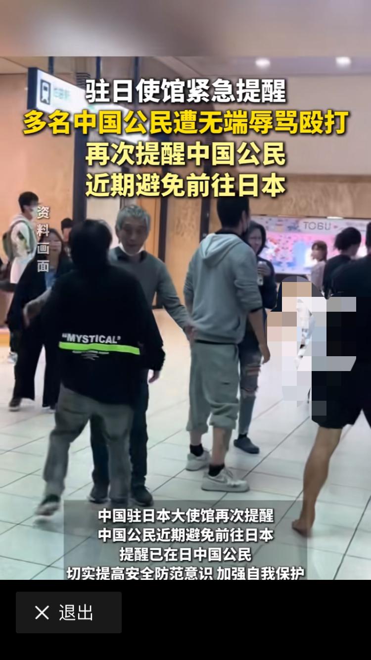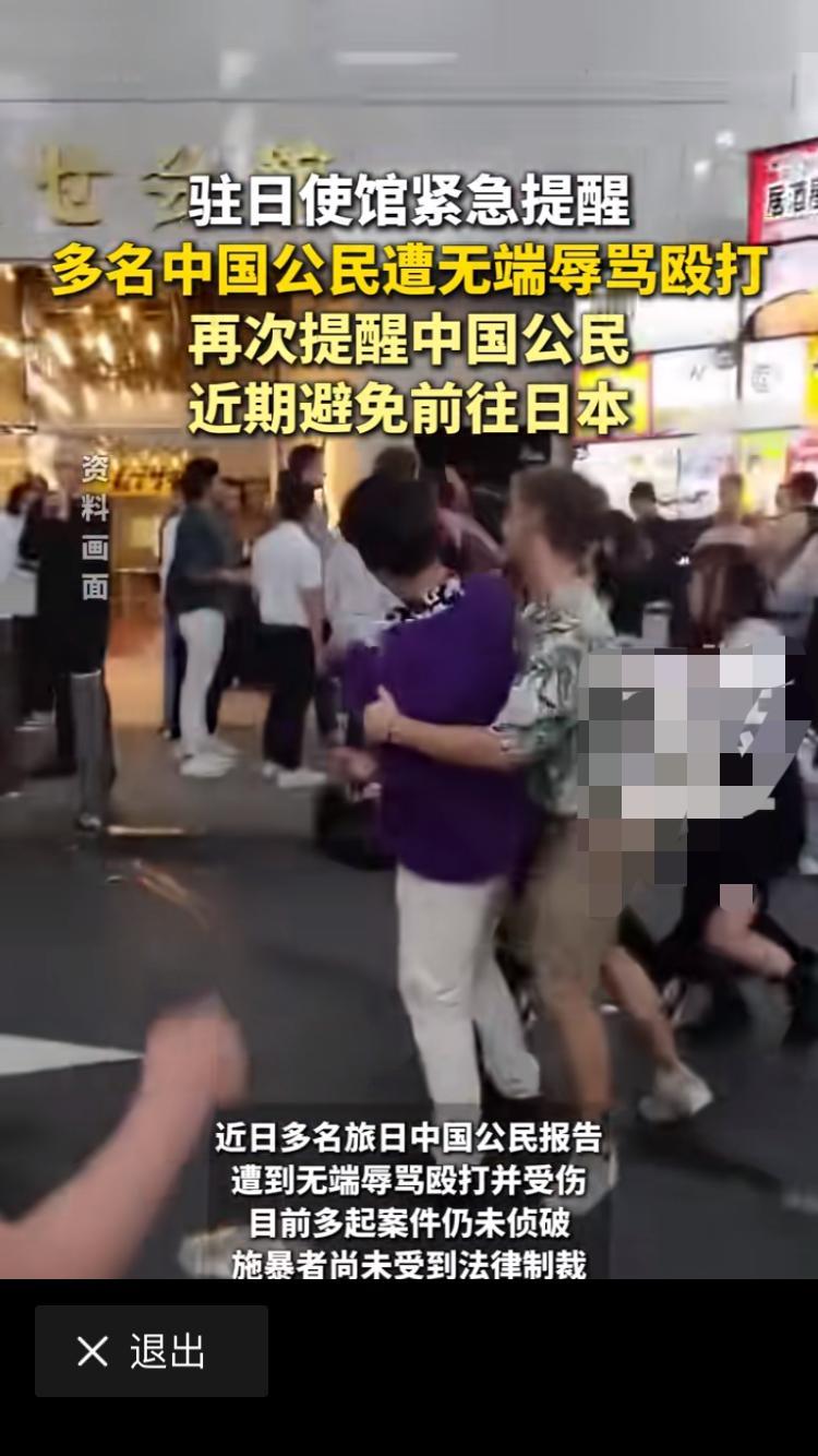 发警告叫你们不要去,非要去,这下被日本人打了吧。在街上走的都不自在,都被别人盯着。日本人对我们的仇恨,那可不是一丁点。讨厌我们是每一个日本人心里从小树立的。 不要以为自己说日本好,日本人就对你友好。这是需要国家实力来支撑的。