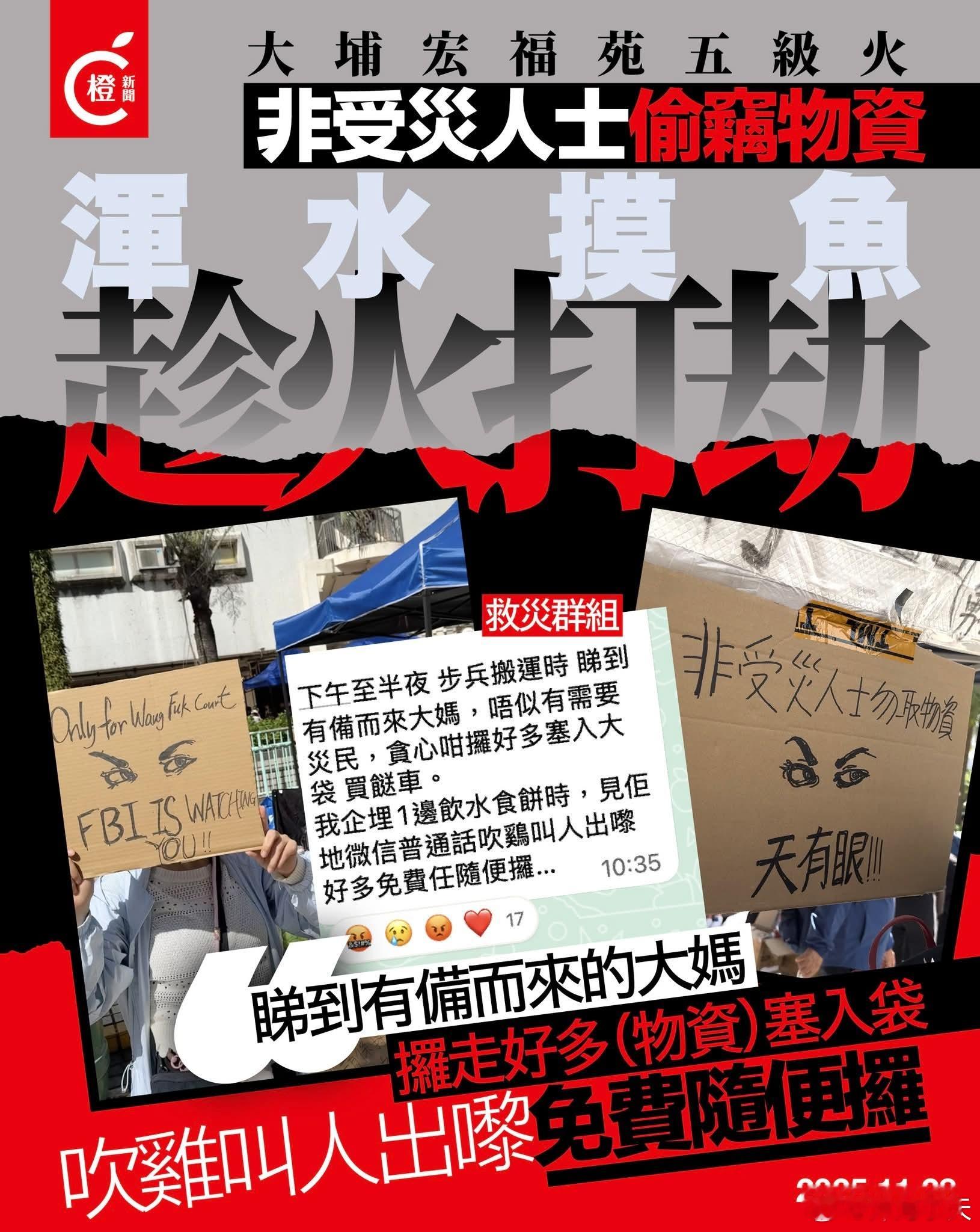 港媒称有普通话大妈偷窃救援物资橙新闻报道,大火发生后香港大埔区多间食店及商场纷纷通宵营业,为受影响居民免费提供食物,市民自发通宵到场协助整理捐赠物资,形成感人的人链搬运场面,充分体现港人「一方有难,八方支援」的狮子山精神,凝聚力令人动容。然而,令人遗憾的是,部分不法之徒竟混入物资区偷走发放给灾民的物资,更有「救援组群」人员称,「下午至半夜,步兵搬运时,看到有备而来大妈,不像有需要灾民,贪心的拿了好多,塞进大袋买菜车,我站在旁边喝水吃饼时,见他们微信普通话叫人出来,(说)好多免费、任随便拿」。香港大火71岁阿伯现场寻家人香港大埔火灾已致128人遇难