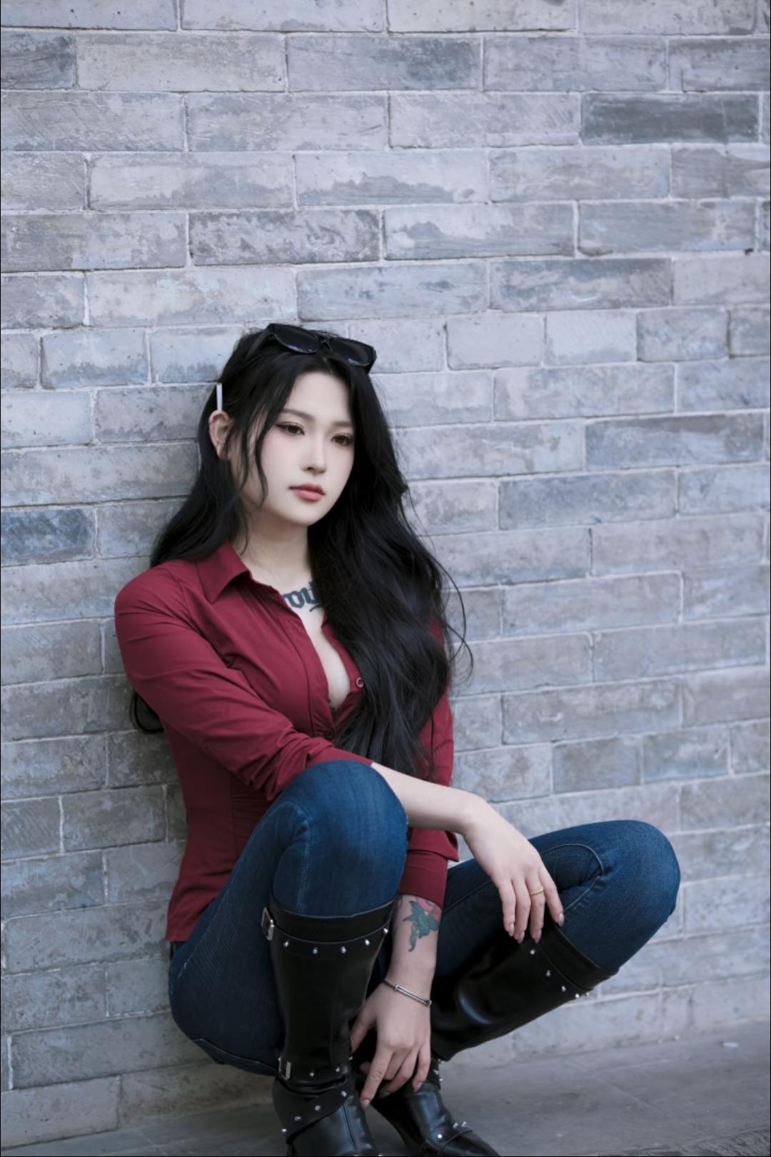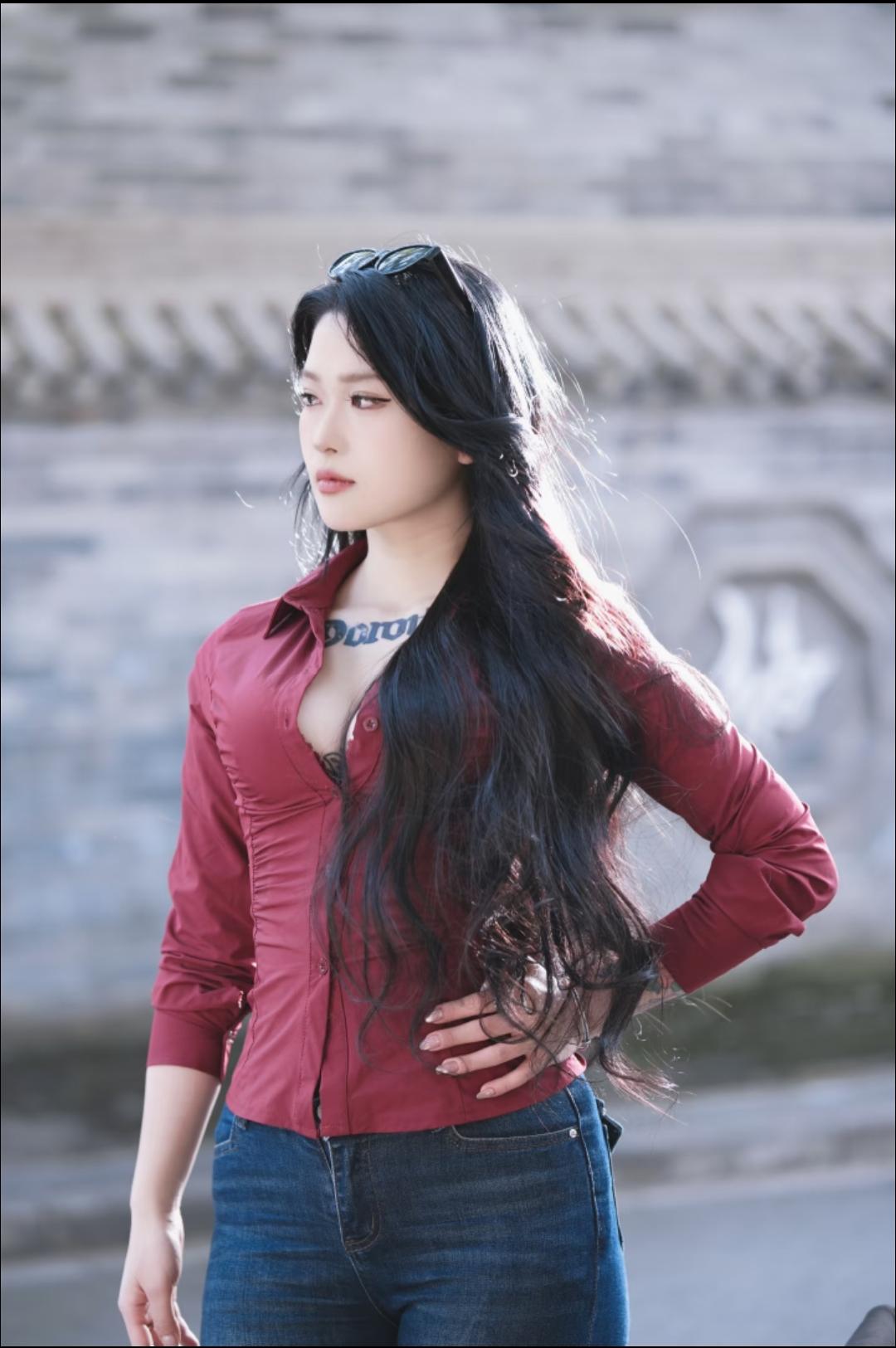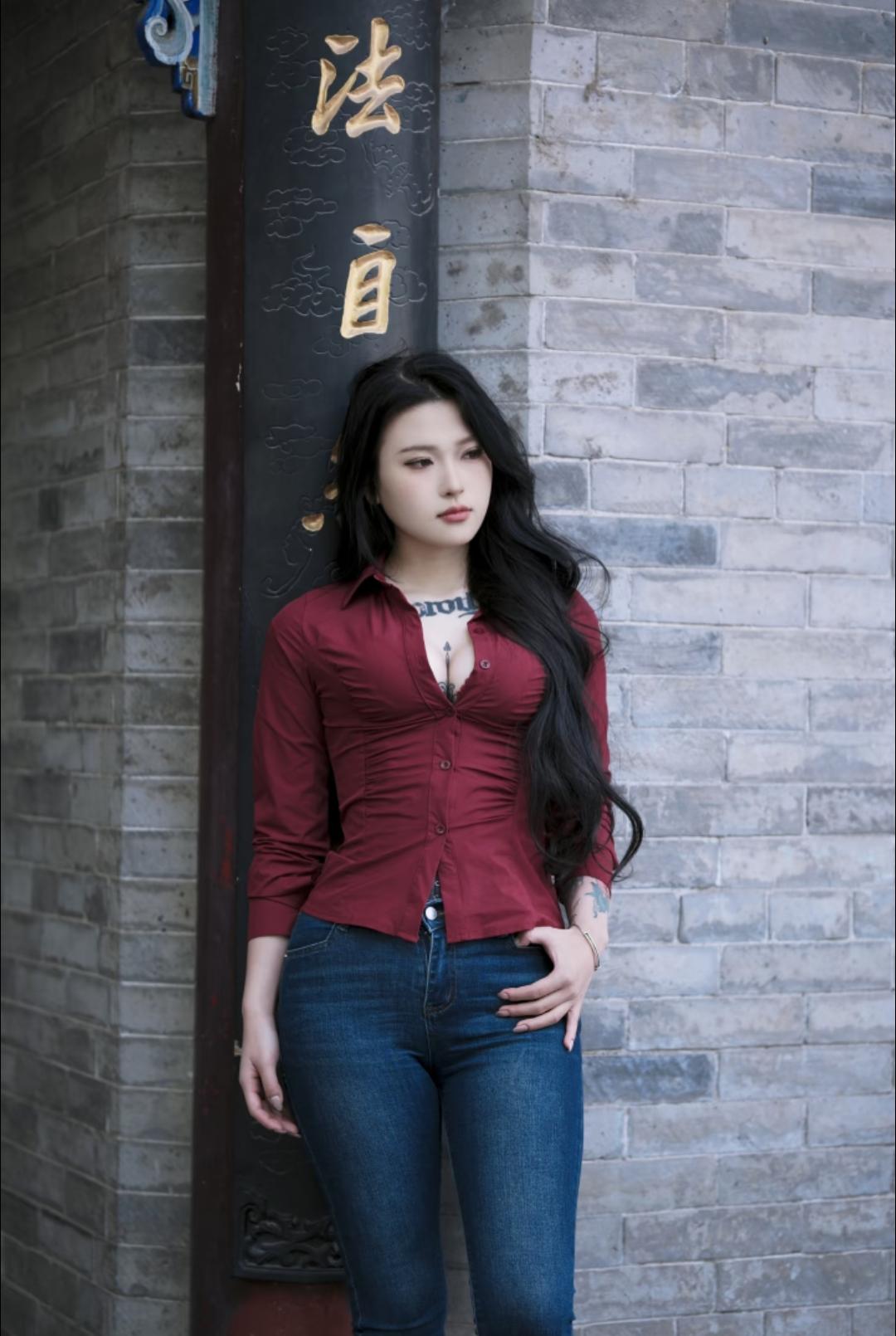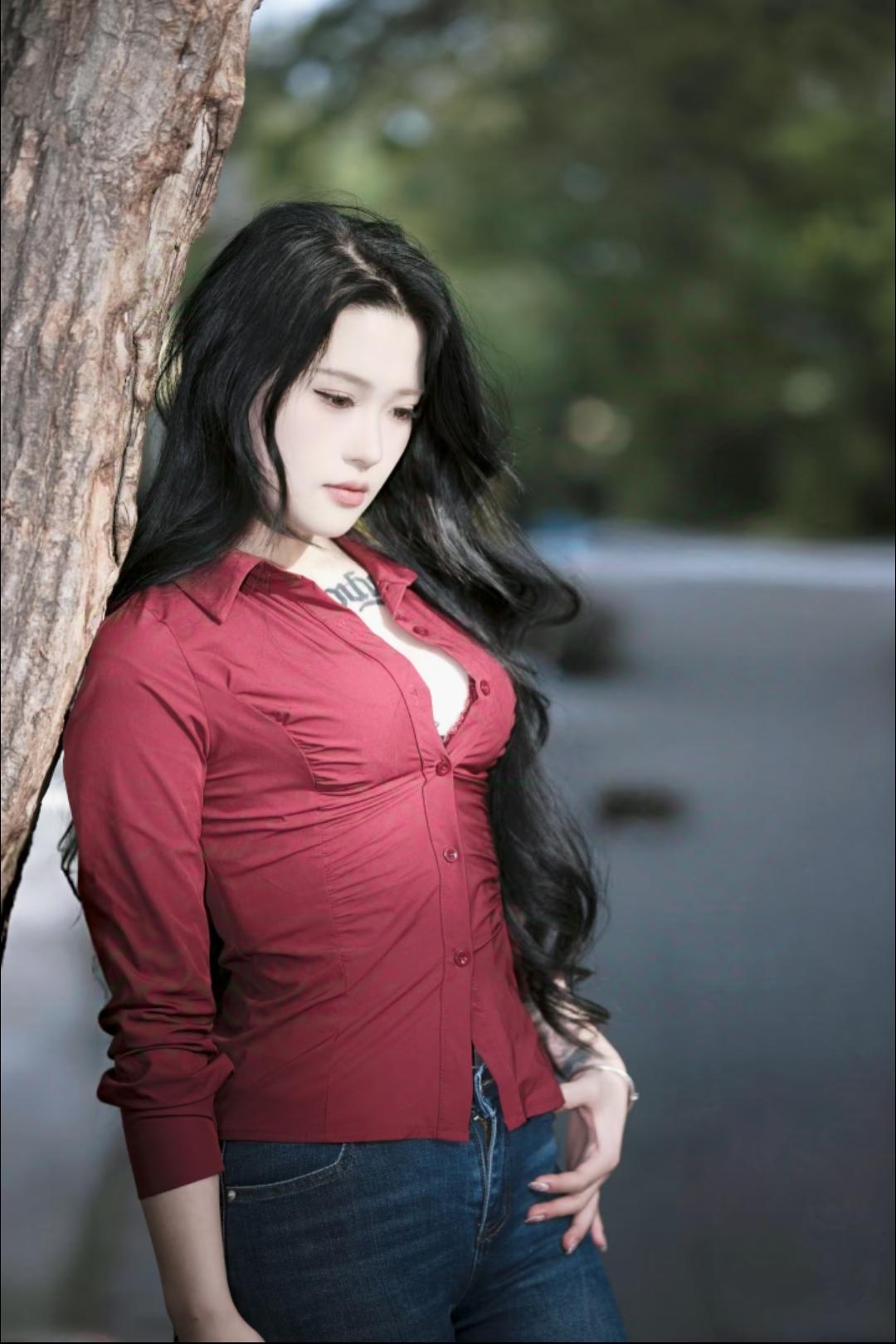 红衣美人倚树立,青石巷中见芳姿。