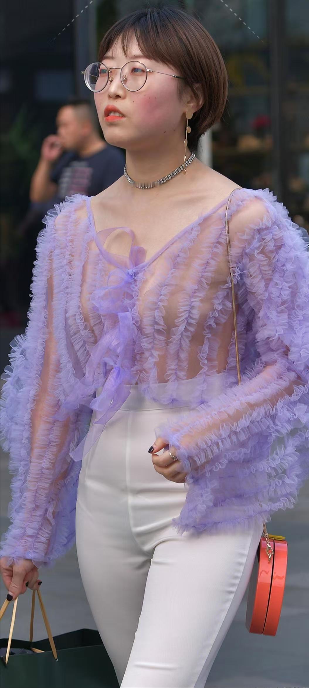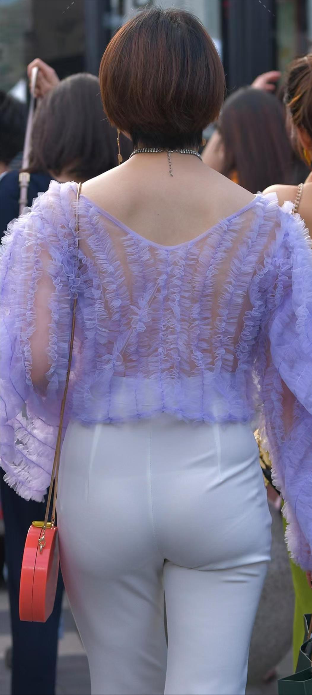 街头偶遇时尚达人,紫色泡泡袖上衣搭配白色裤子,手提小红包,回头率满分
