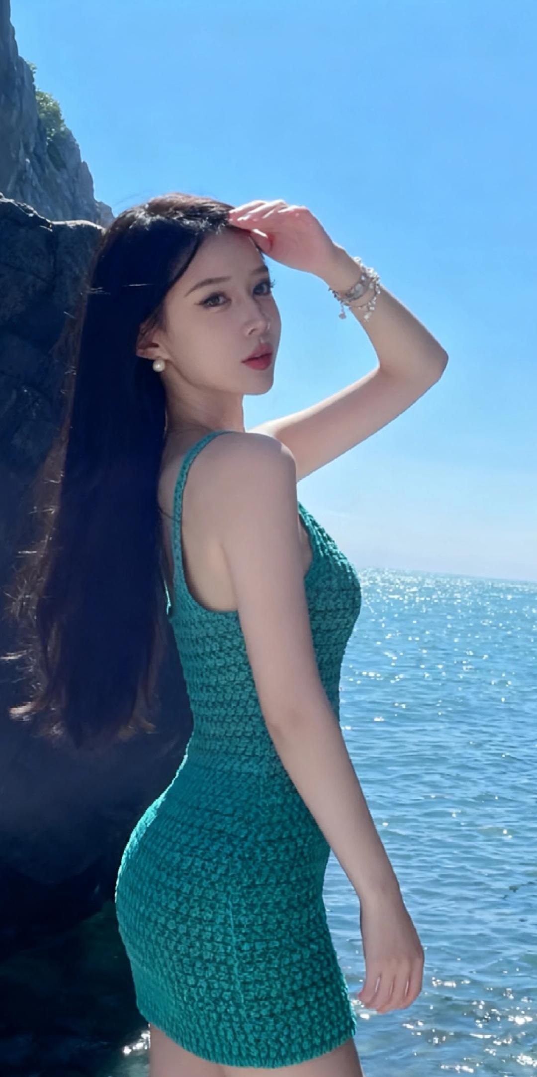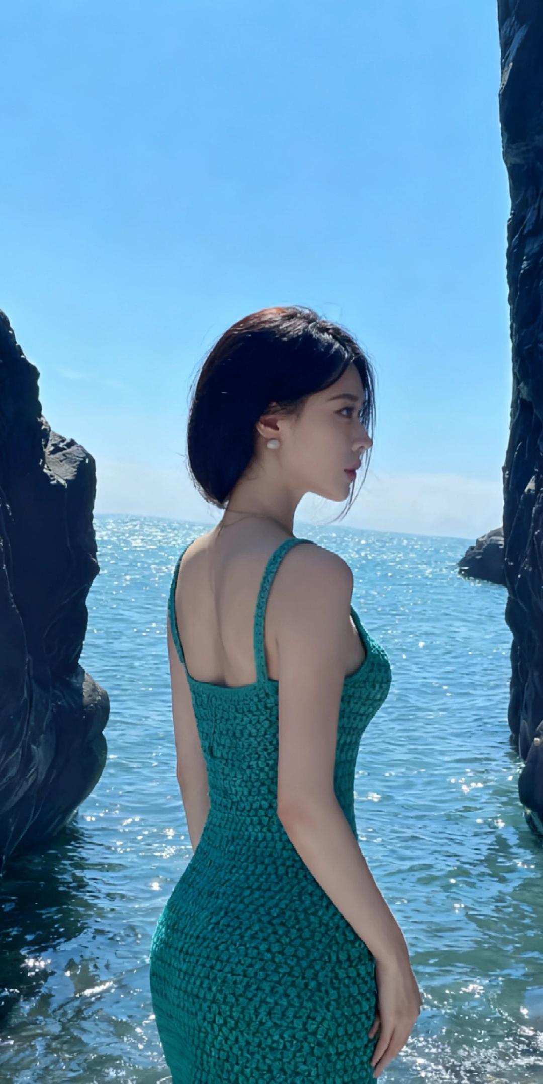 这组海边大片绝了!白裙配红披肩,珍珠项链一戴,在碧海蓝天的衬托下,又美...
