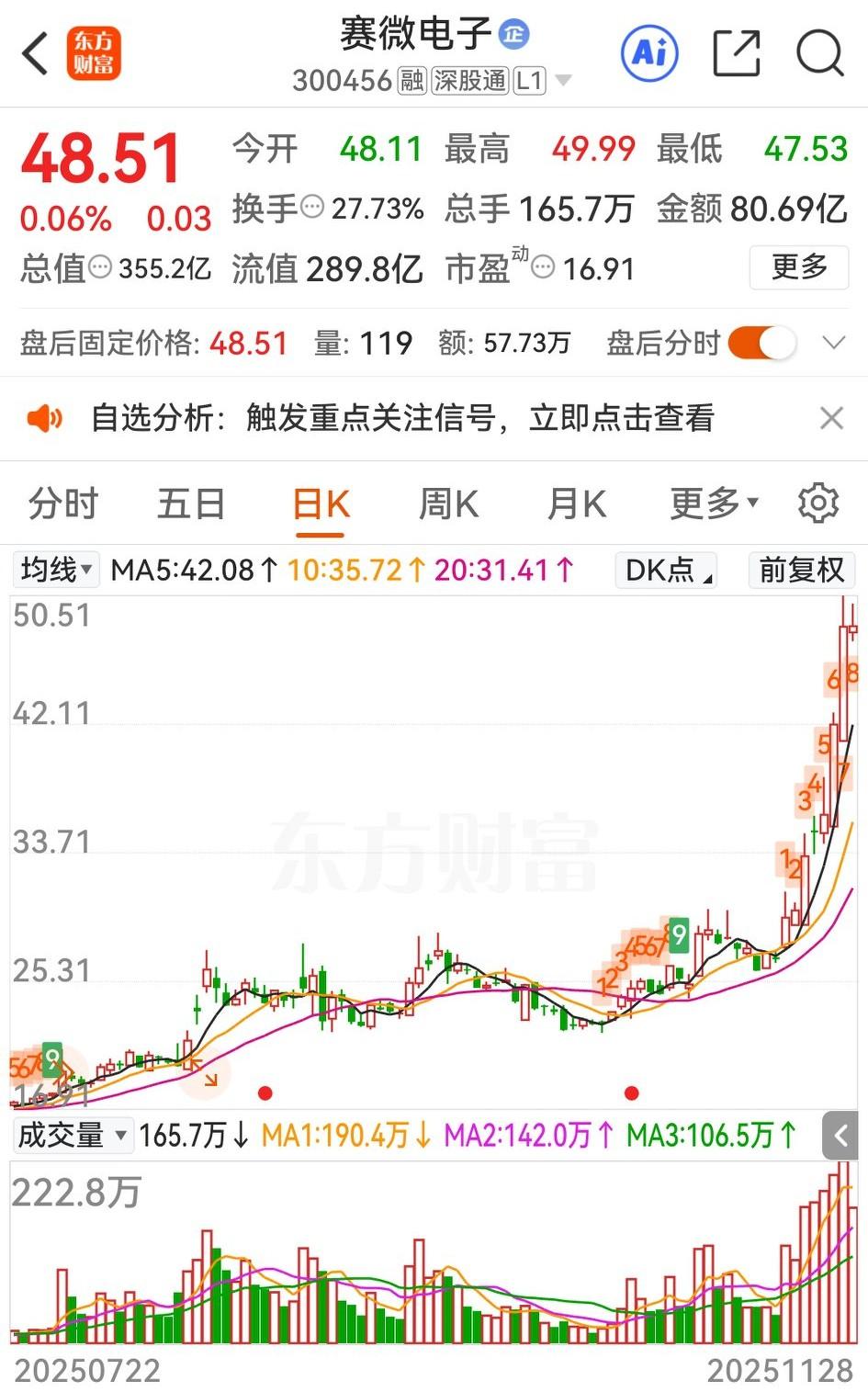 赛微电子无疑是本周市场的亮仔,但昨天重仓买入的3家机构恐怕笑不出来。因为第一大流通股东——集成电路大基金在涨停板上大甩卖,这批机构成了大基金盘中的菜。 大基金二期进入退出期,要减持赛微电子早成明牌。但这些机构10多元不买,40元后却无脑大买,不得不说机构的价值发现能力真菜。 如果这些机构不赶紧割肉甚至还敢大买,必遭持股占比降至5%以下却还有4000余万股的大基金再度大卖,大基金已经吃定了机构这盘菜。