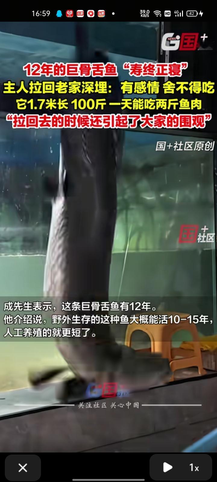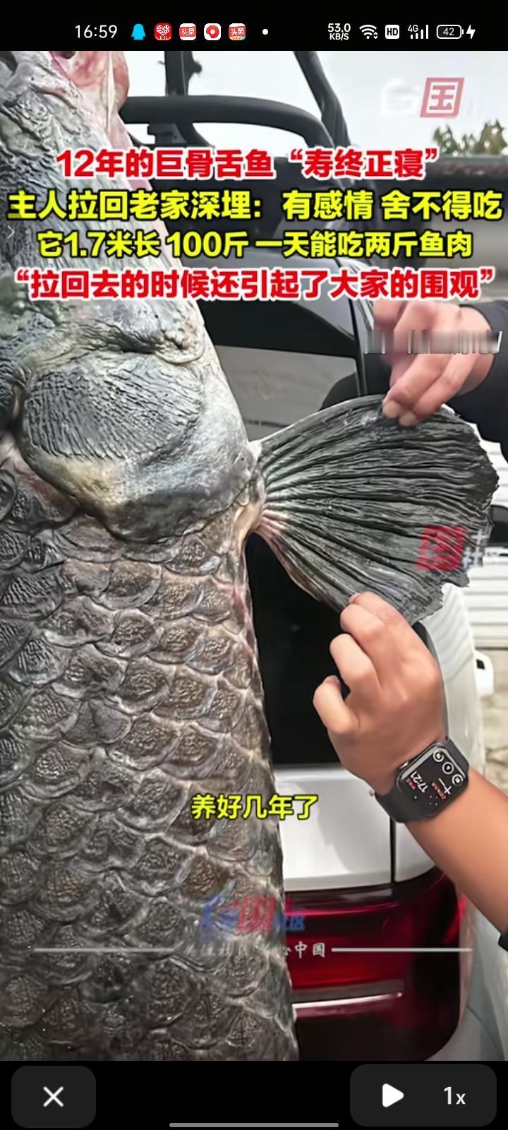 11月6日,山东滨州。12年的巨骨舌鱼“寿终正寝”,主人把它拉回老家深埋,期间遇到不少路人围观。 成先生介绍称,这条巨骨舌鱼活了12年,野外生存的鱼大概能活10-15年,人工养殖的更短。自己对鱼有感情,舍不得吃,这条鱼长一米七,100斤左右,一顿吃两斤鱼肉,两三天喂一次
