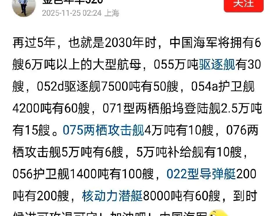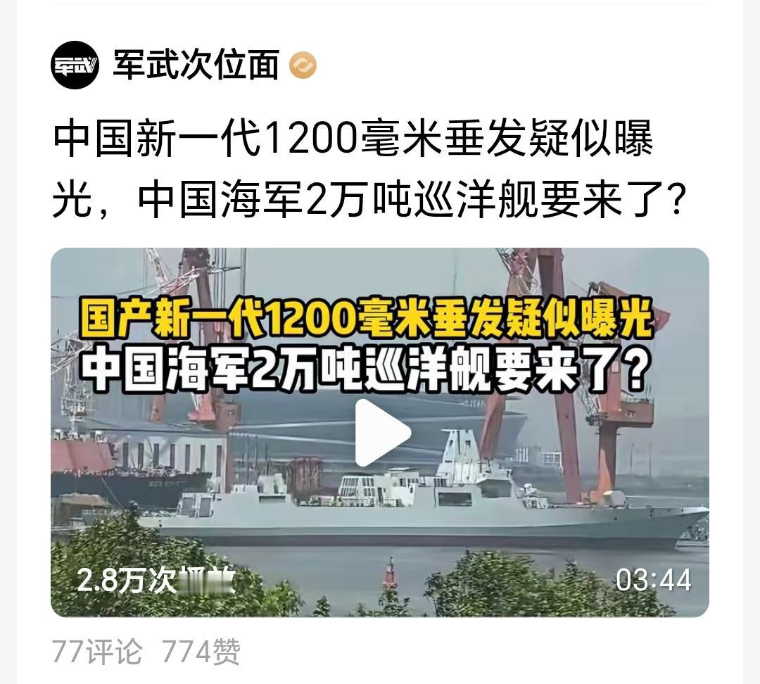 中国军工,你这让我们情何以堪啊![捂脸]我们全国军迷前不久才嘲笑美税宗要回过头去搞巡洋舰,现在,你们这是几个意思?[流泪] 2万吨的大舰都赶上别国轻型航母了,1200毫米垂发系统,这战力还有谁?!! 看到网友对我们2030年海军舰船的预测,那个时候全世界的和平应该都到来了吧。 果然只有我们才是蓝星和平的最大保障。 点右上角关注我,我们一起去看这个魔幻的世界