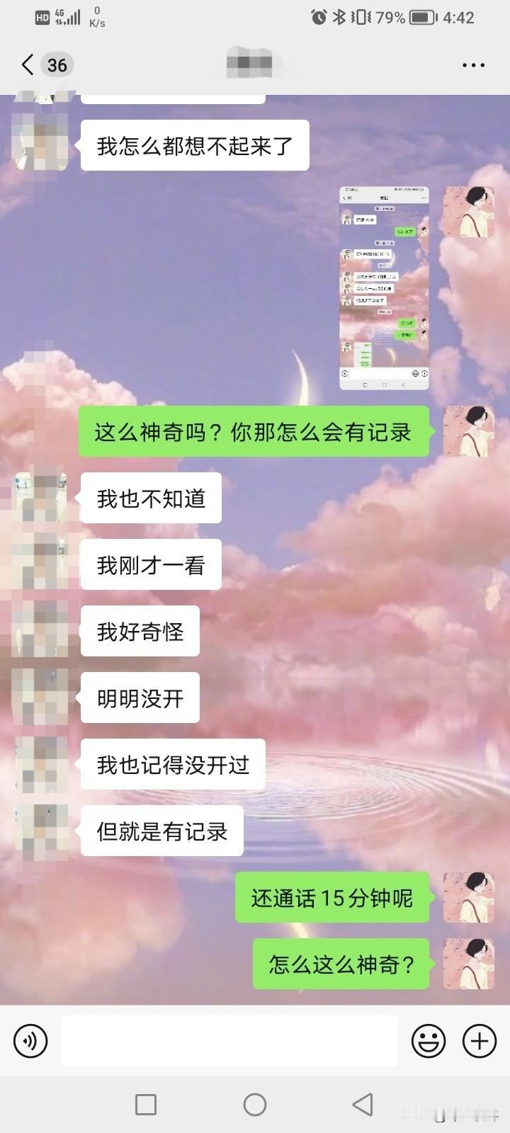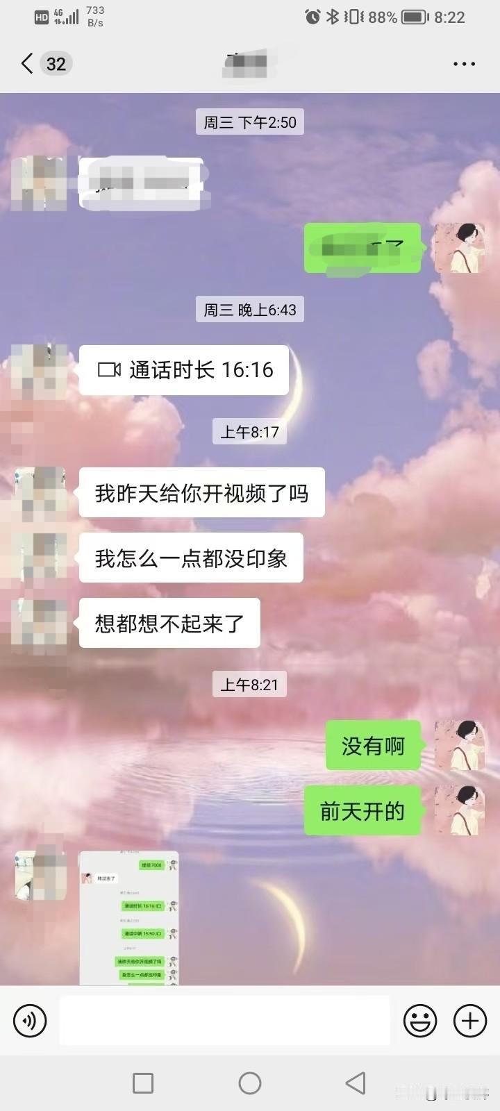 微信是出bug了吗?竟发生了如此神奇的事! 昨晚我弟明明没有给我开视频,可在他微信和我的聊天记录里,却显示有一段15分钟50秒的视频通话记录,且通话还被中断了。然而,我这边的聊天记录里压根没有视频通话的痕迹! 这究竟是怎么回事呢?难不成真有平行时空?