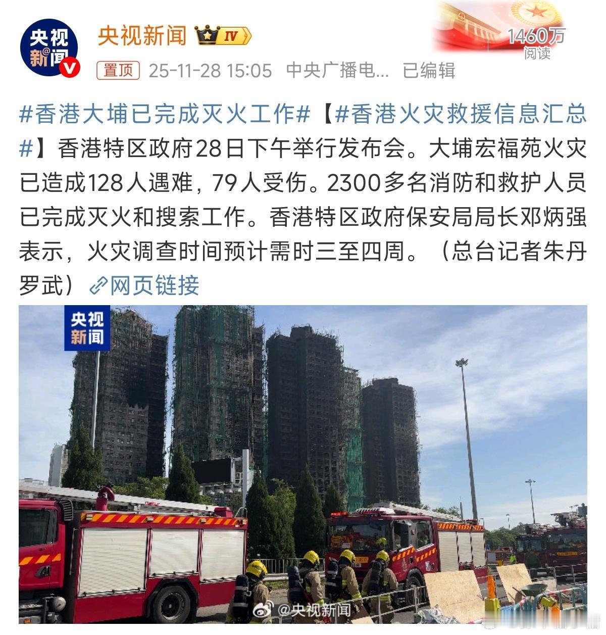 香港大埔火灾已致128人遇难救火英雄们辛苦了望逝者安息相信官方会查出问题原因,以后出规则要求进行规避,并将涉事人员绳之于法严惩