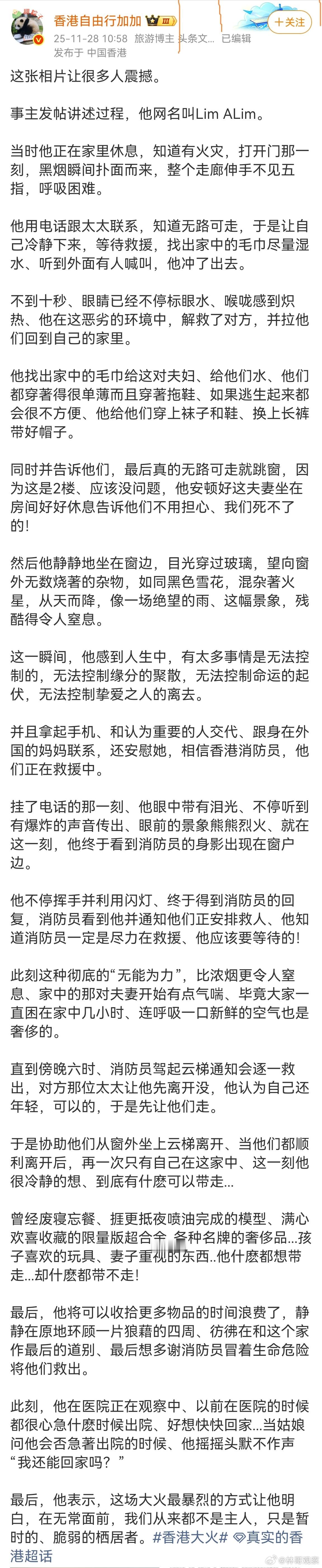 香港大埔火灾已致128人遇难这张图片让很多人震撼泪目!事主网名叫Lim ALim,他讲述了发帖的过程…这一瞬间,他感到人生中,有太多事情是无法控制的,无法控制缘分的聚散,无法控制命运的起伏,无法控制挚爱之人的离去!生命就是如此,曾经在意的东西,重视的东西打拼的东西,在生命结束那一刻什么都带不走,什么都不属于他的了.......香港大火香港大火已致94人遇难香港捐款