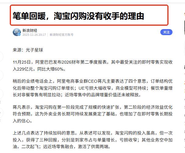 阿里财报数据一公开,都在说阿里的外卖投入要熄火了?其实很多人压根没看懂背后的逻辑! 说白了,大多数人都是抱着看热闹的心态在看,这几个月外卖大战打得这么凶,阿里还能顶得住吗?或者说阿里巴巴还能坚持多久,这次阿里最新财报公布,算是满足大家的好奇心。 不过大家的关注点都是,淘天电商利润同比下降76%,甚至据此作出结论:阿里不想在外卖市场继续打了。确实,经营利润是衡量企业过去一段时间经营情况的一项核心指标。 但是这个数据不能片面去看,知其然还要知其所以然,经营利润下降背后是,过去几个月阿里以高投入换高增长。 所以阿里的即时零售收入涨没涨、涨了多少就很关键了。看了一下,阿里第三季度即时零售收入为229亿元,较去年同期的143.2亿元暴涨60%。 市场规模得到了大幅提升是一方面,还有一个不能忽略的关键是,10月以来,淘宝闪购的UE亏损相较7月、8月已经降低了一半。 什么意思呢?就是淘宝闪购每完成一笔即时零售订单,平台算上所有成本后是亏钱的,但得益于几个月来客单价的提升以及物流成本的下降,这个亏损在收窄。 这么来看,规模扩张、UE优化这两个目标淘宝闪购都已经很好地完成了。而接下来阿里要做的也很清晰,那就是提升用户体验、高价值客户的经营以及零售品类的发展。 很明显,现在淘宝闪购一步一步走得很稳,而且每一步都是计划之中的。 而且其背后的野心绝对比我们想象的要大,一边以外卖为切入点,朝着天花板更高的即时零售行业稳步迈进,另一边打通即时零售与电商的壁垒,反哺阿里电商业务持续扩展,淘宝10月份月活超过10亿就是最好的证明。 说到底,这一切都在阿里掌控之中,退一步来讲,阿里巴巴家底厚,这才哪到哪儿,收手不存在的,外卖大战还远远没有结束。