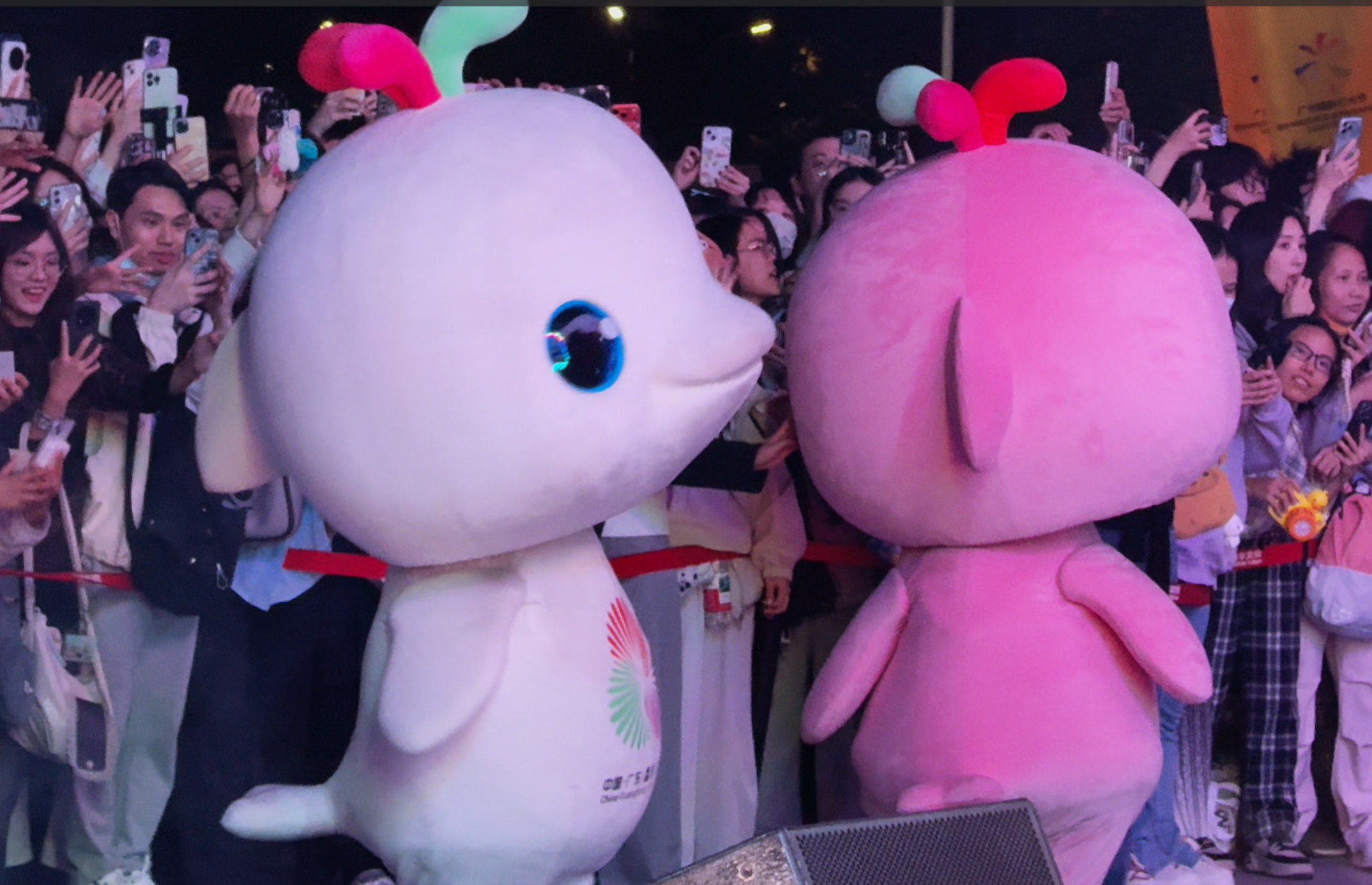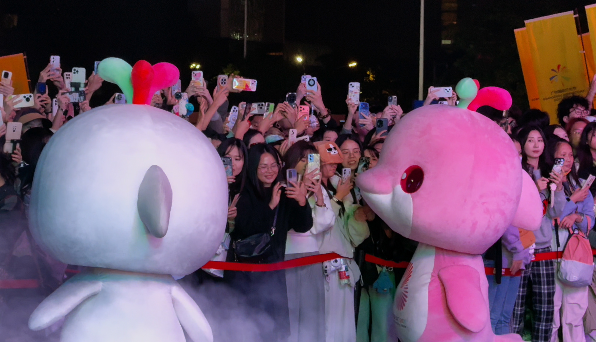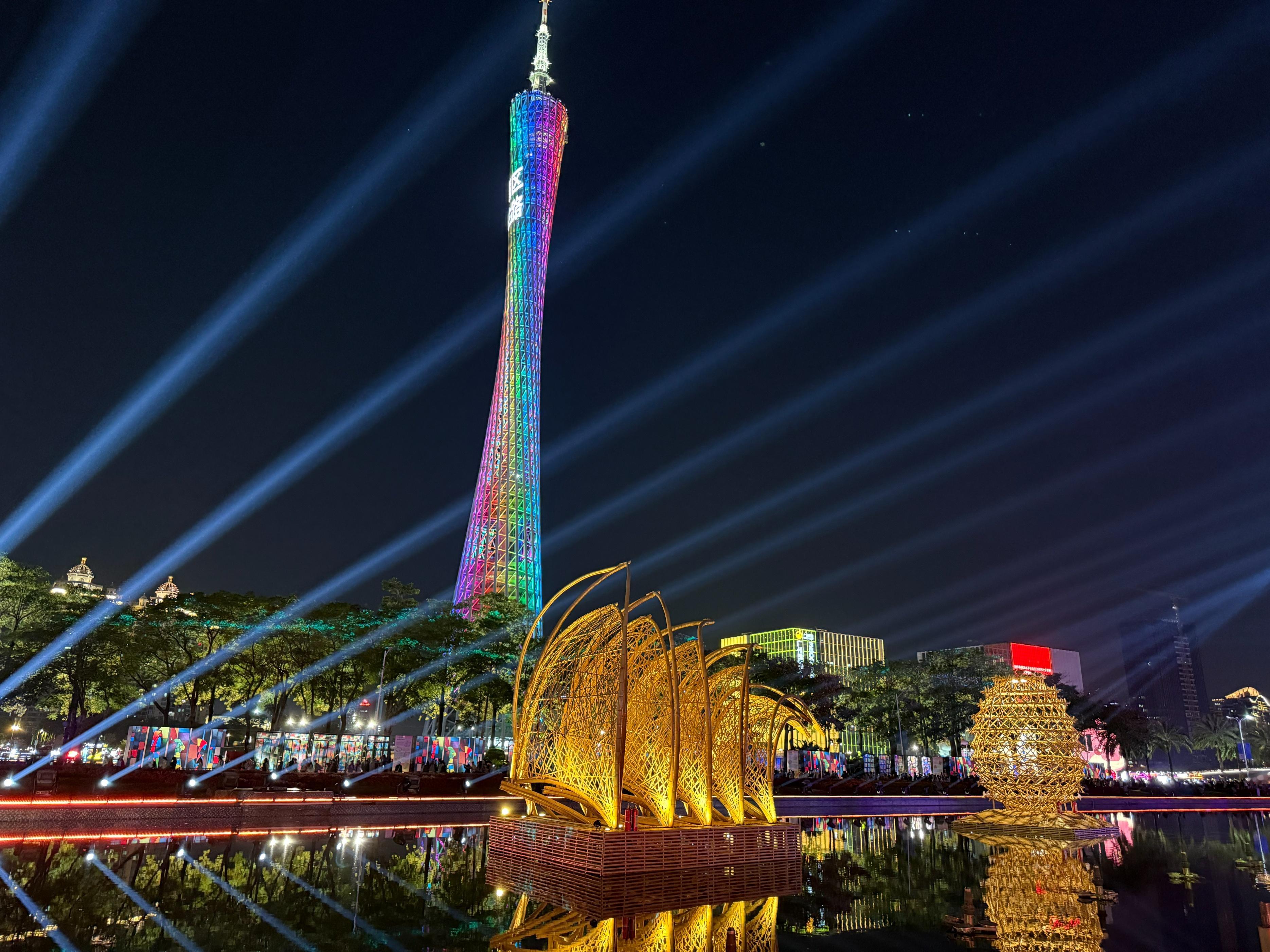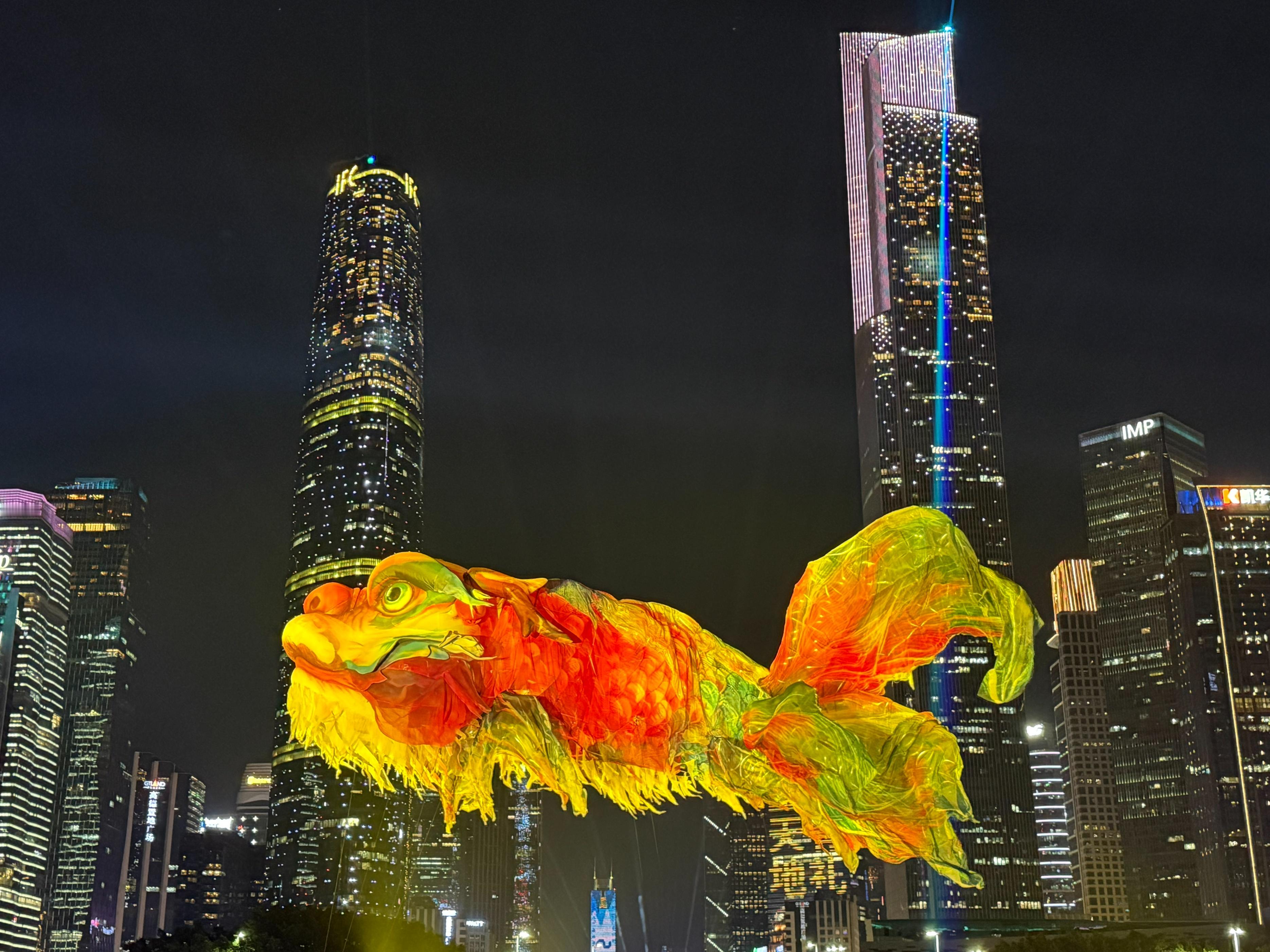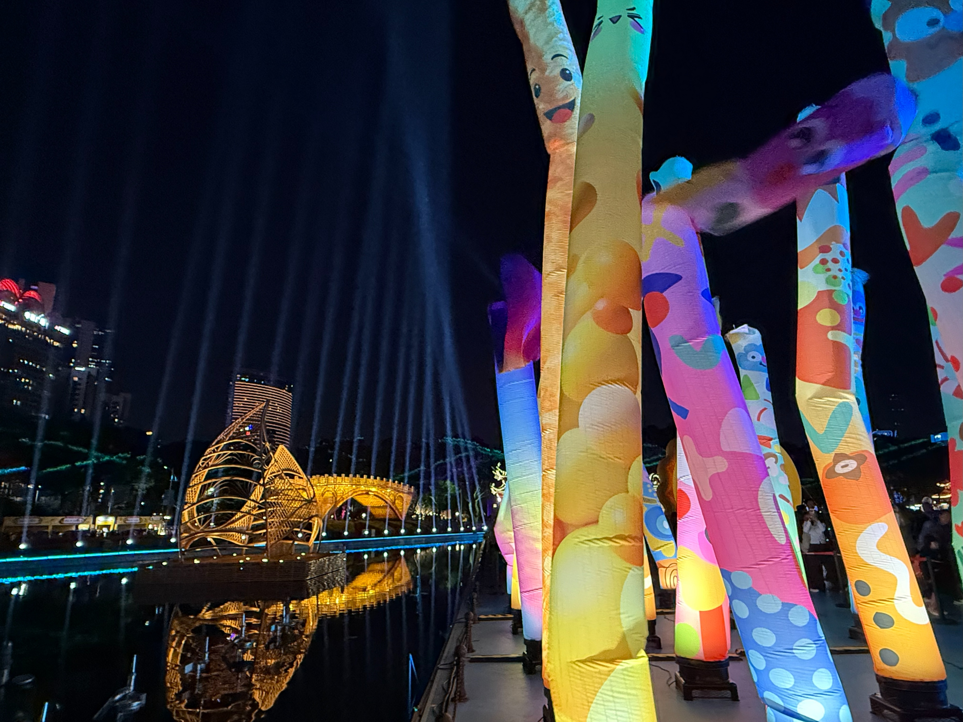 2025年广州灯光节 最后的时刻我还是预约上广州灯光节了,赶了个晚场,21:00-22:00的,感觉今年的灯光节比去年的元素少,但传统元素比去年浓厚,最大的区别就是很多在全运会开幕式展示的作品平移到海心沙来了,比如那条著名的鳌鱼。 验身份证,过安检,进入灯光节的内场,人气最旺的是十五运会的吉祥物喜洋洋和乐融融,尤其是由武校学生表演的,人们围拢在周围,特别是小孩子,都喜欢这对吉祥物。 其次人流量最大的是鳌鱼,它游走在广州塔和珠江新城的浮光掠影里,模样憨态可掬又孔武有力,到了22:00,工作人员牵引着鳌鱼回家,一天的灯光节至此退场,随着鳌鱼回家,灯光节结束,我认为是一个非常有创意的构思。至于灯光节的现场情形,我稍后会上传视频,喜欢的请关注哦。