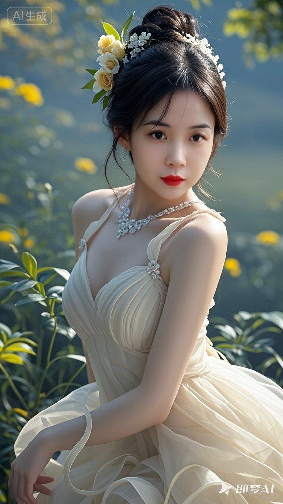 一位女子散发着优雅与甜美的气息。她的长发自然垂落,为整体造型添了几分柔美与风情。