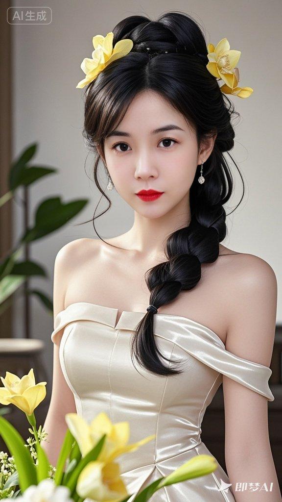 一位年轻女性妆容清新自然,淡红唇明亮,眼妆精致,长发编成单侧麻花辫并点缀白色花饰