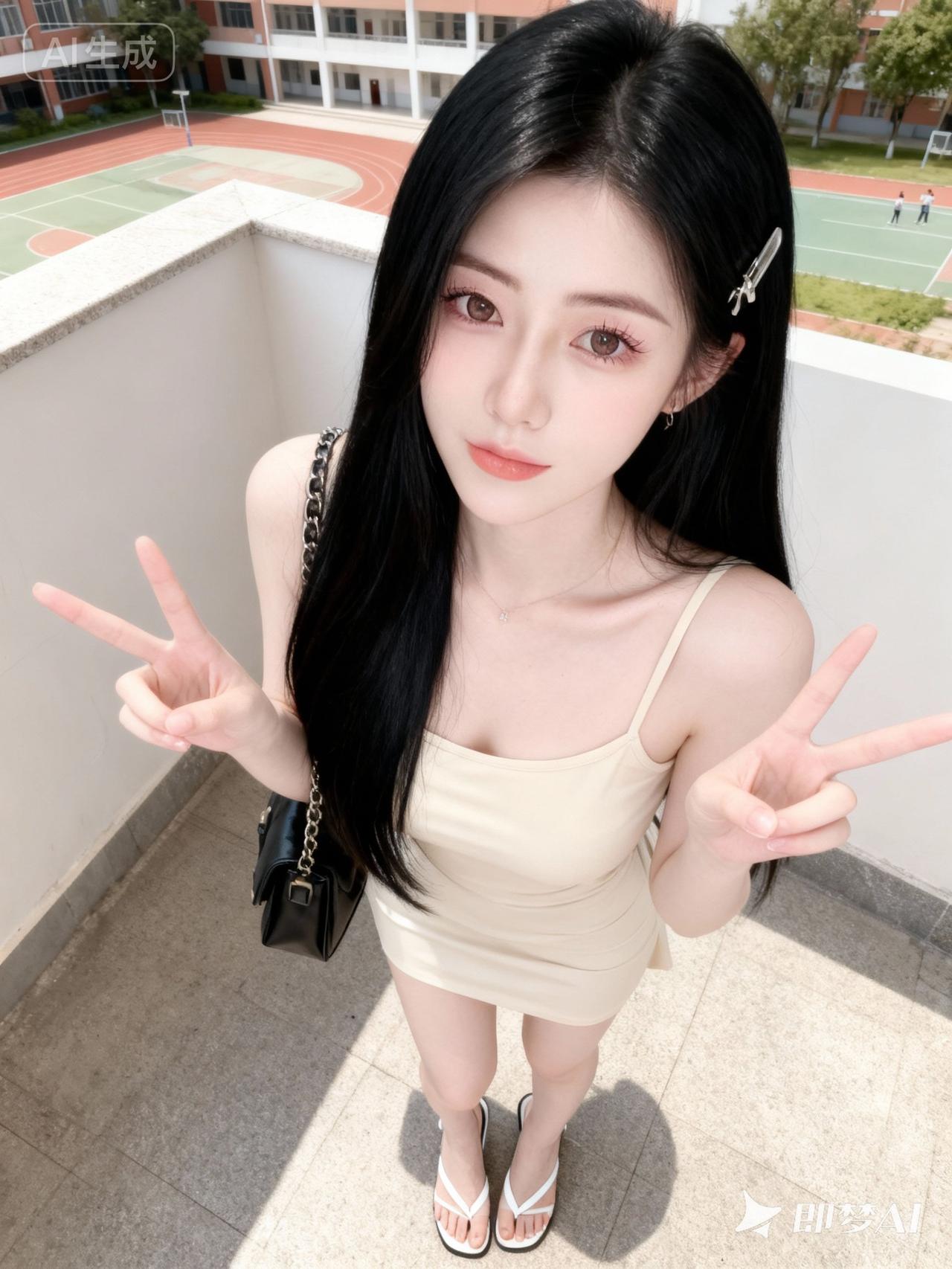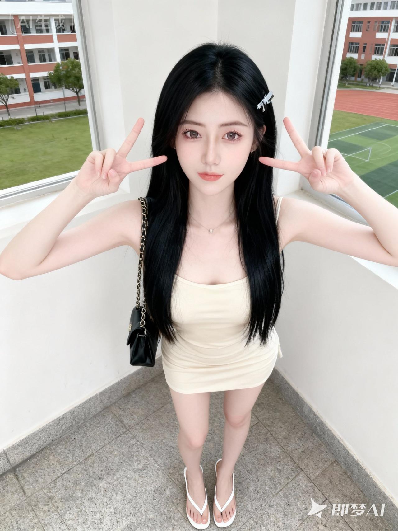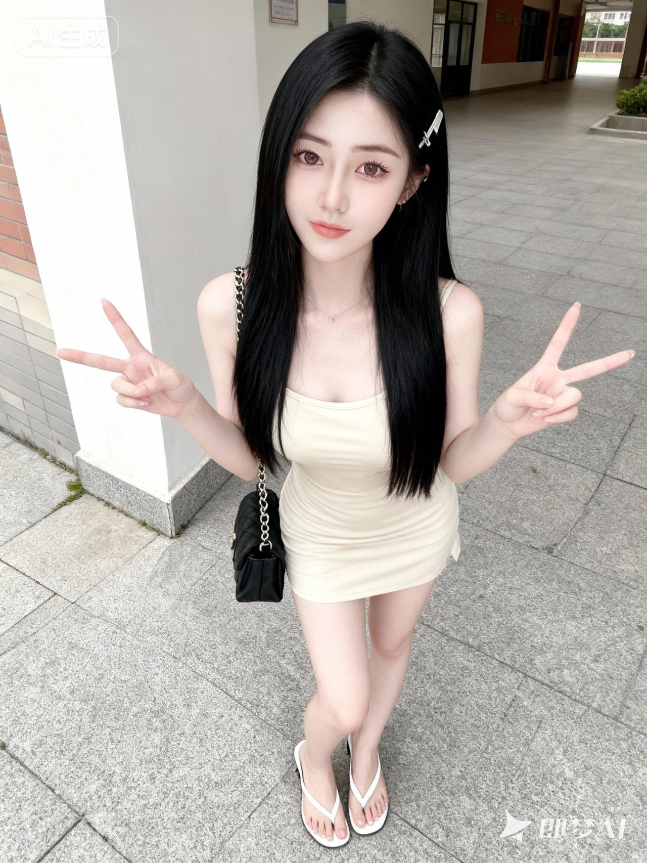高颜值清纯可爱长相、绝美双眼,精致五官、发质滑顺有光泽、透白皮肤。 精致女性,冷白皮,黑色长发,大眼睛水汪汪,纯欲、傲娇、厌世、高冷、甜美,仿佛会说话的眼睛,眼部妆容精致,淡色眼影,长睫毛;穿米色吊带连衣短裙、白色细高跟人字拖、黑色链条包、发夹,双手比耶,整体呈现纯欲少女感,一眼惊艳的构图、清新可爱氛围感,自然姿势。