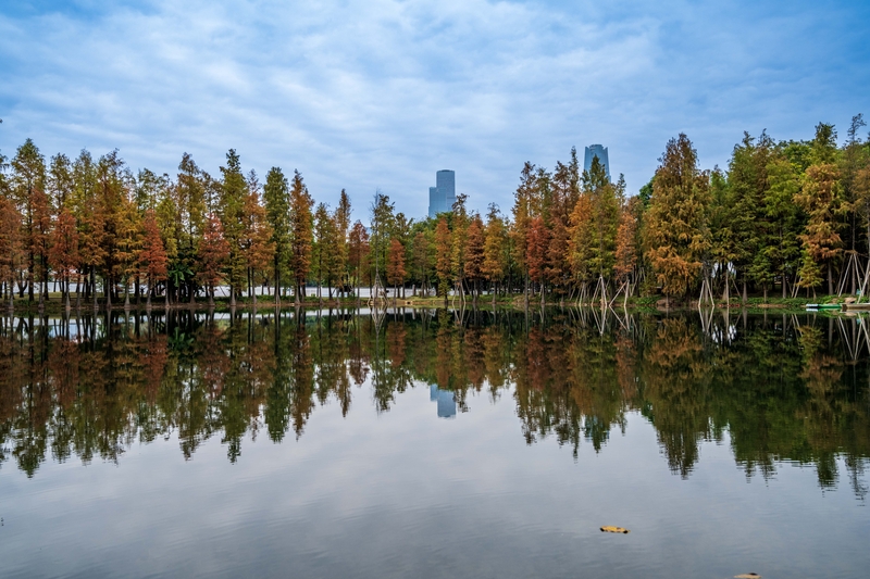 从春夏的郁郁葱葱,到秋冬的层林尽染,落羽杉变成了迷人的“焦糖色”,仿佛大自然打翻了调色盘。漫步公园,看着这些色彩斑斓的落羽杉,美得让人移不开眼。