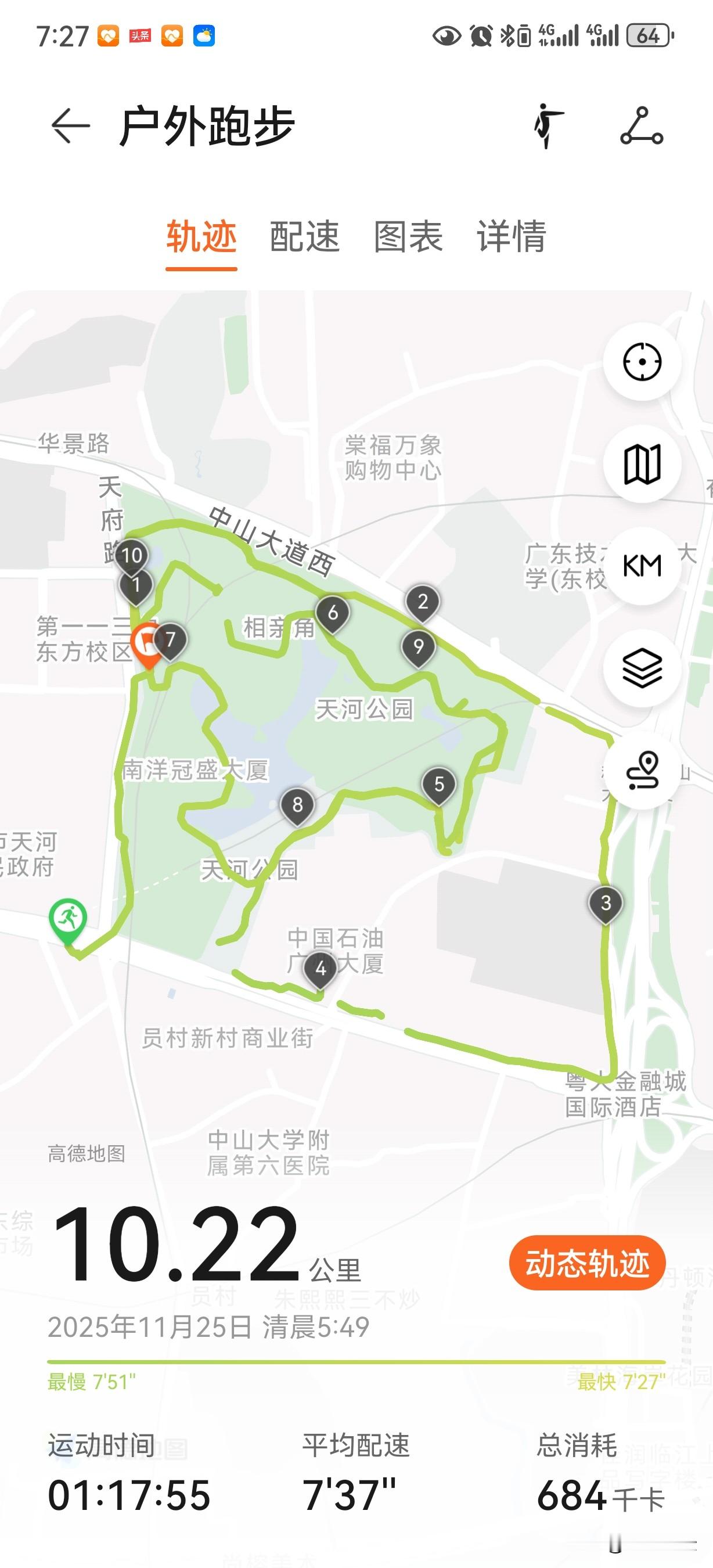 11月25日,打卡广州天河公园10公里。昨日送走一个同学,明天和意外哪个先来?谁也不知道[捂脸]唯一可把我的,就是脚下跑过的路,强健身体,从容面对,淡定生活规律,不再迎合,对得起自己[祈祷][祈祷]坚持跑步,感受律动的活力生命[比心][比心]天河拍照打卡 天河公园 今天你跑步了吗