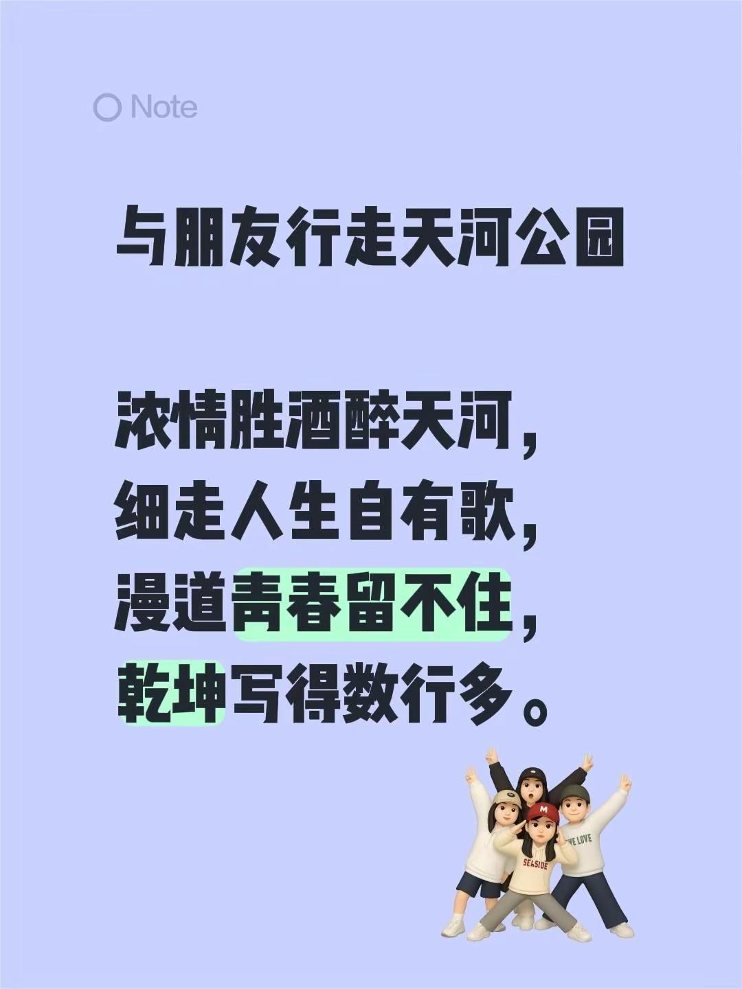 与朋友行走天河公园浓情胜酒醉天河,细走人生自有歌,漫道青春留不住,乾坤写得数行多。
