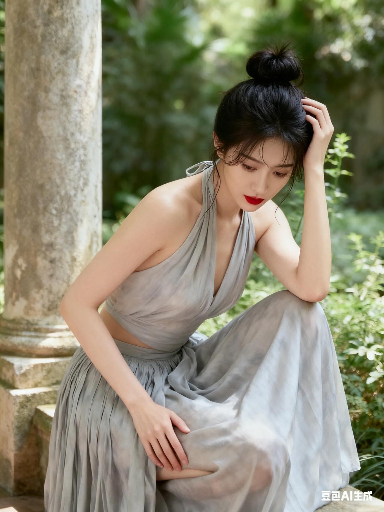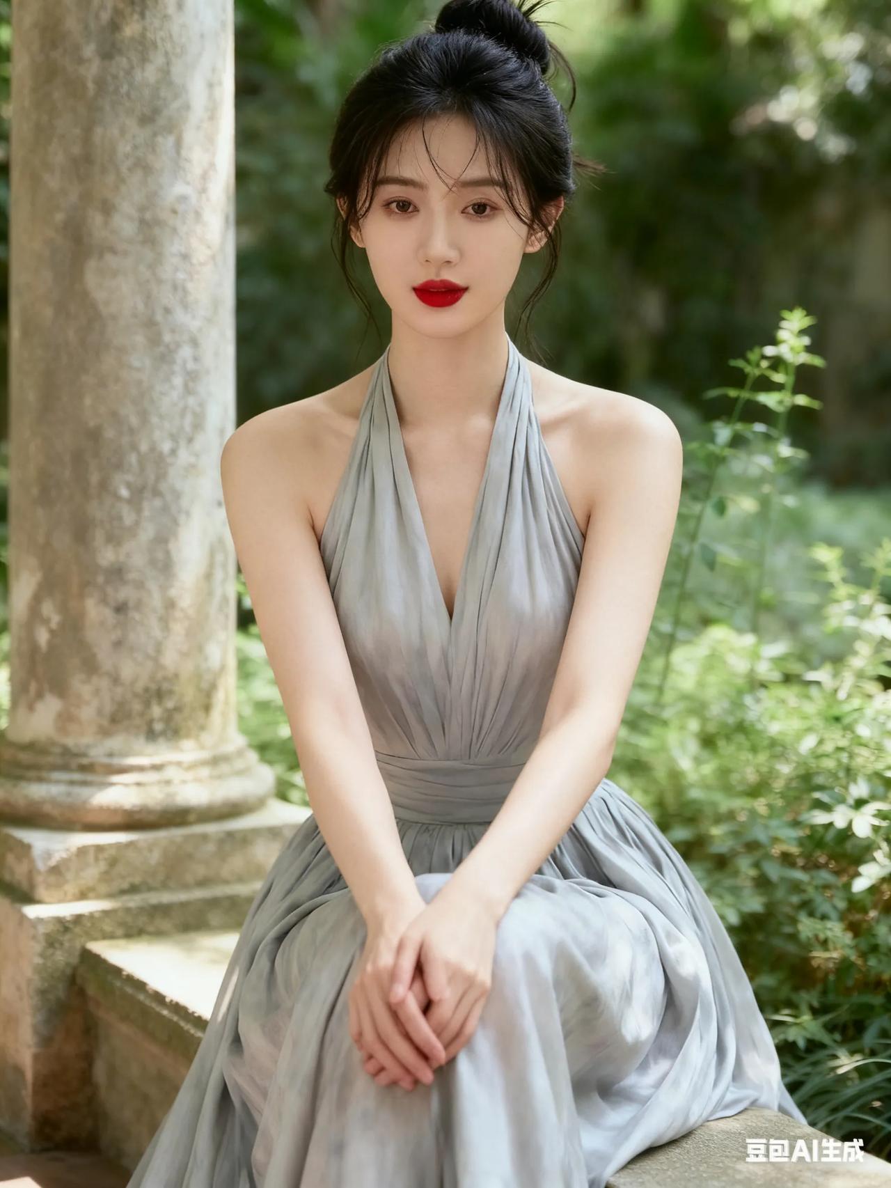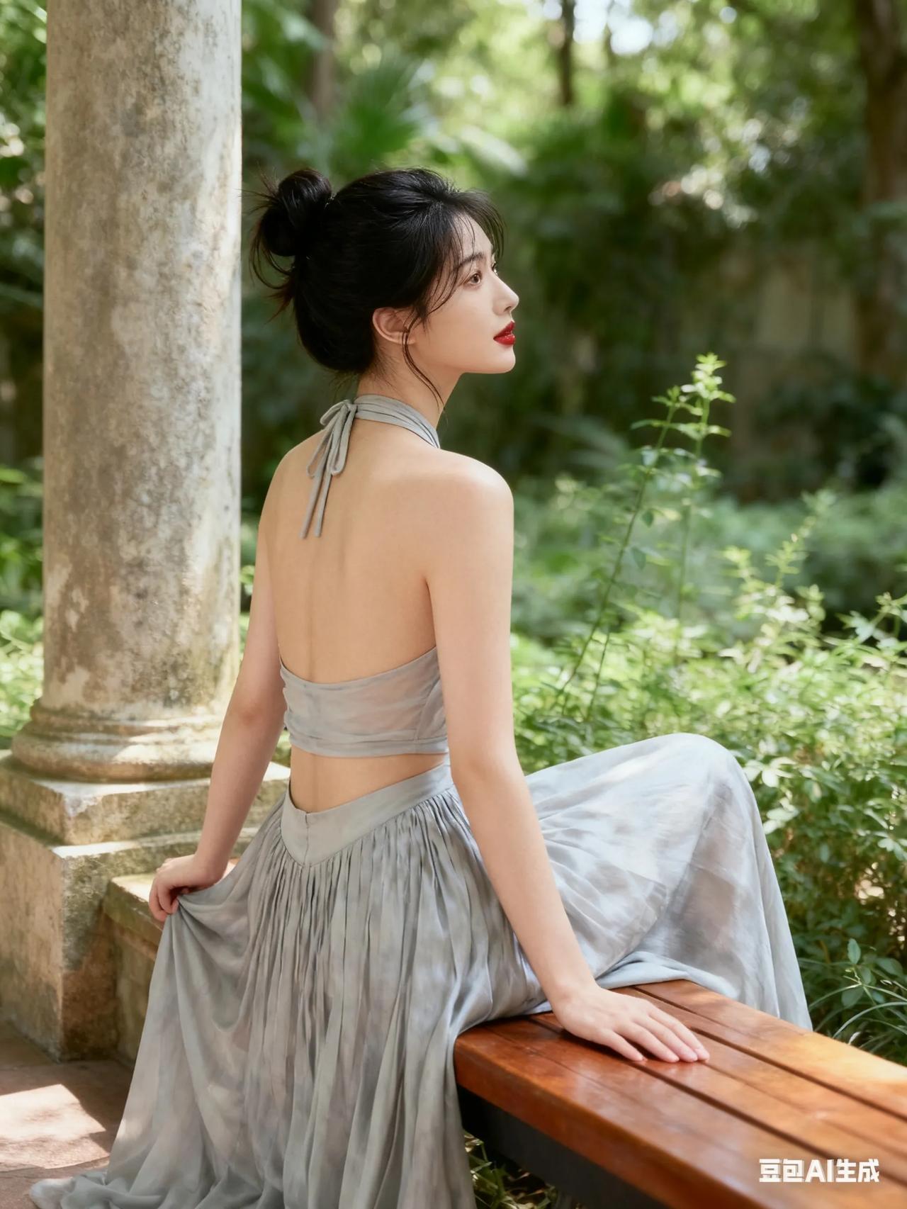 优雅黑发美人,红唇与灰裙相映成趣,静坐绿意盎然中。