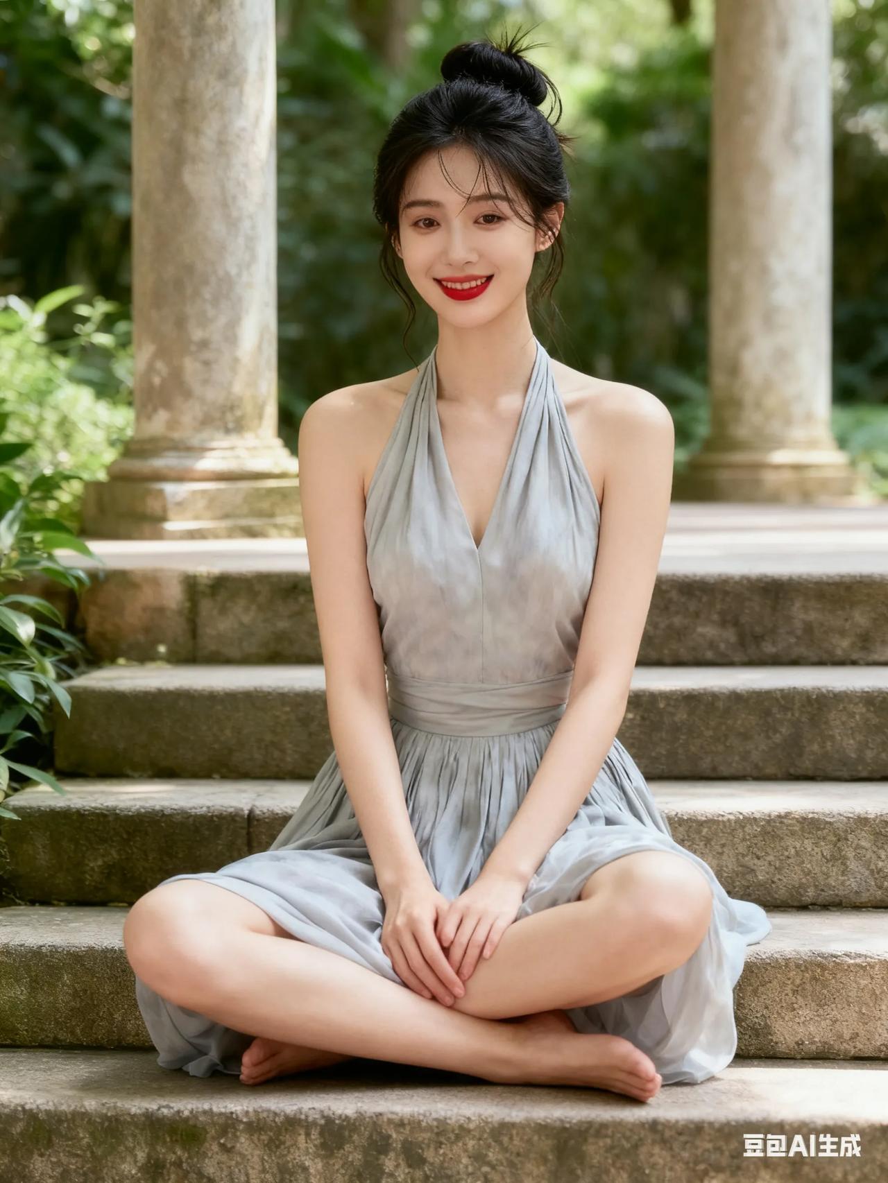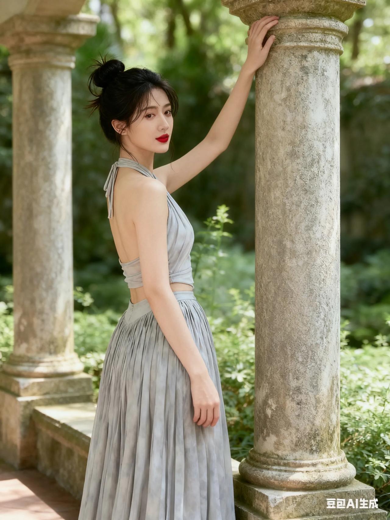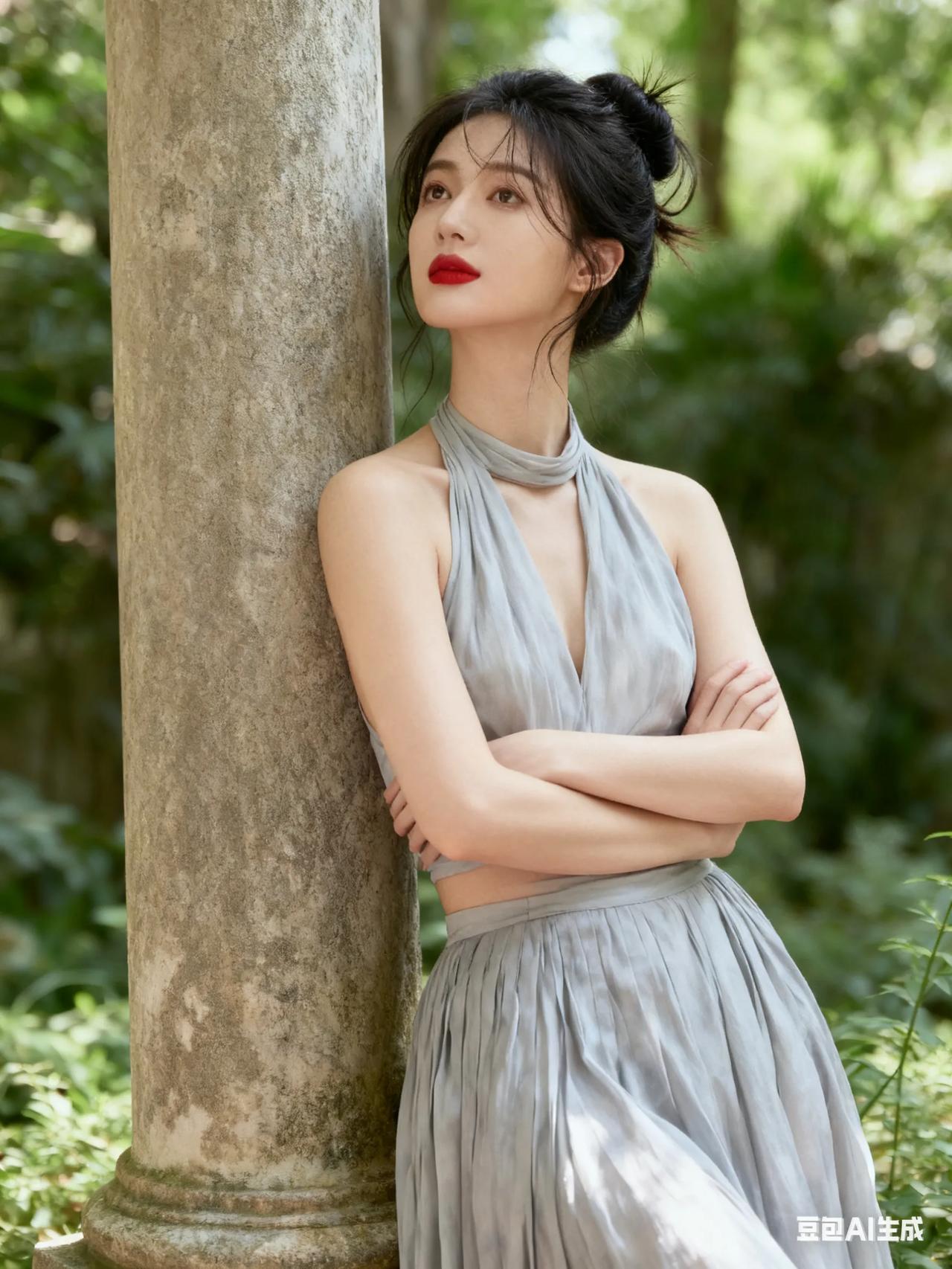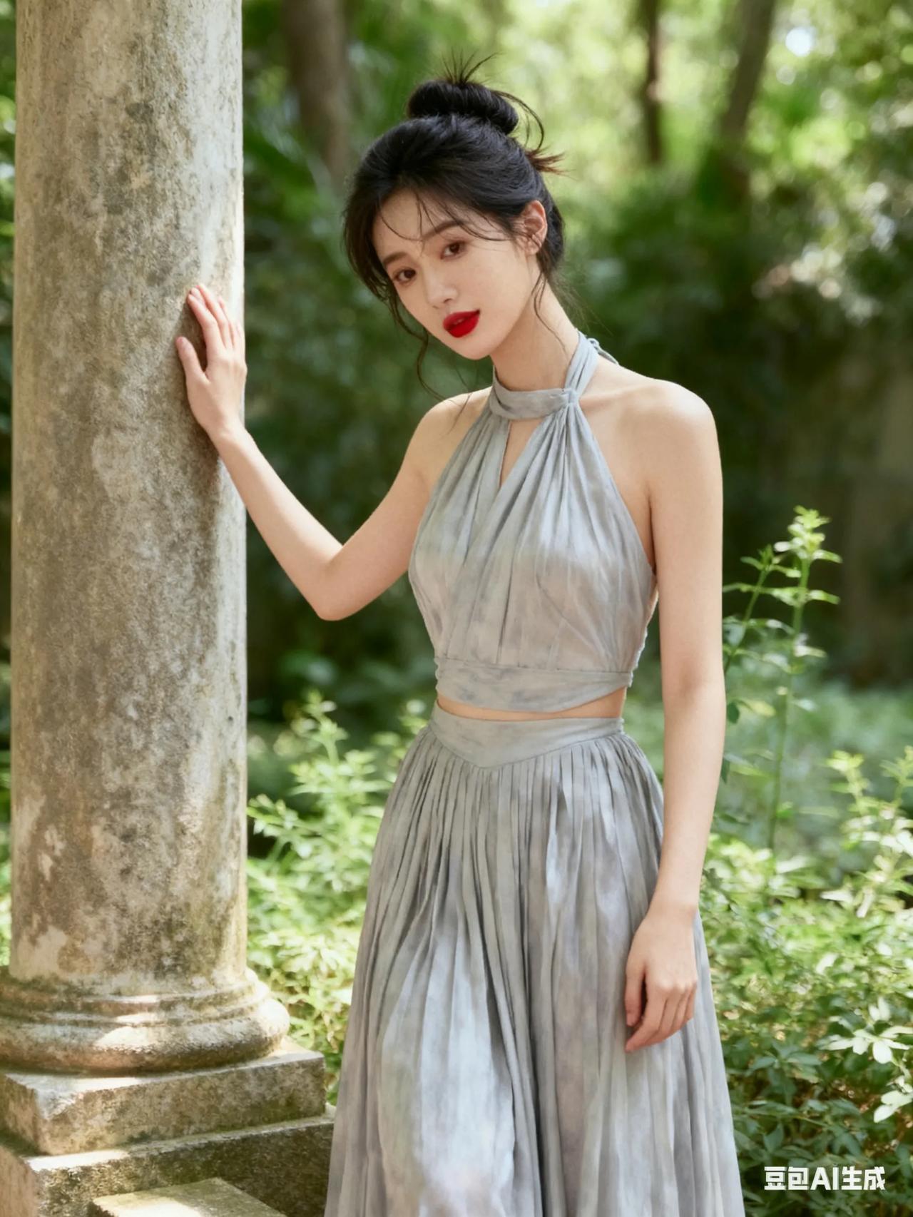 优雅黑发美人,红唇与灰裙相映成趣,静坐绿意盎然中。