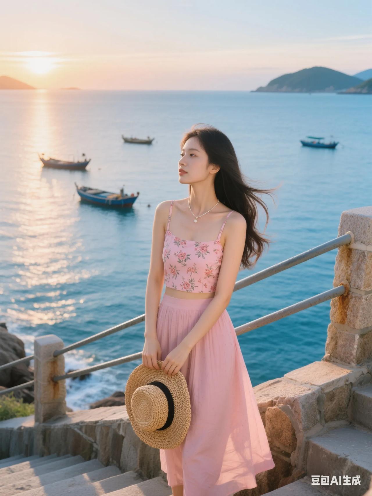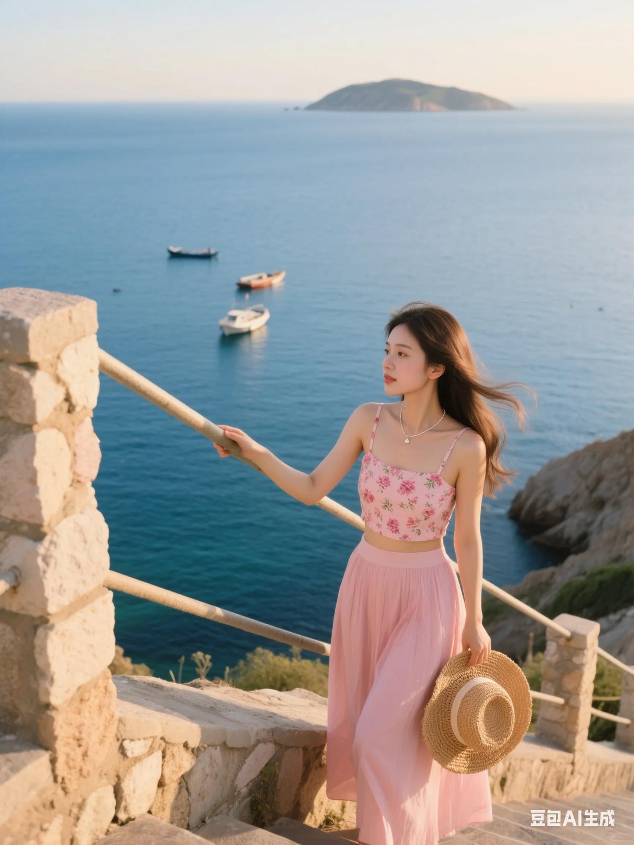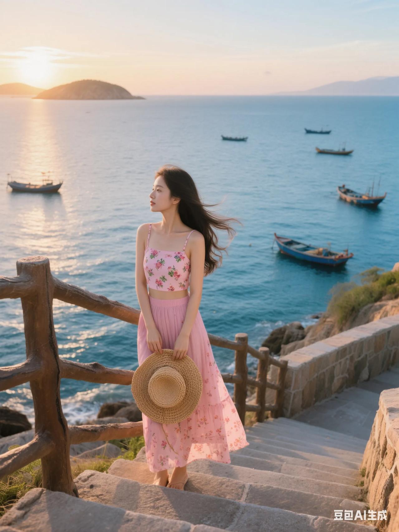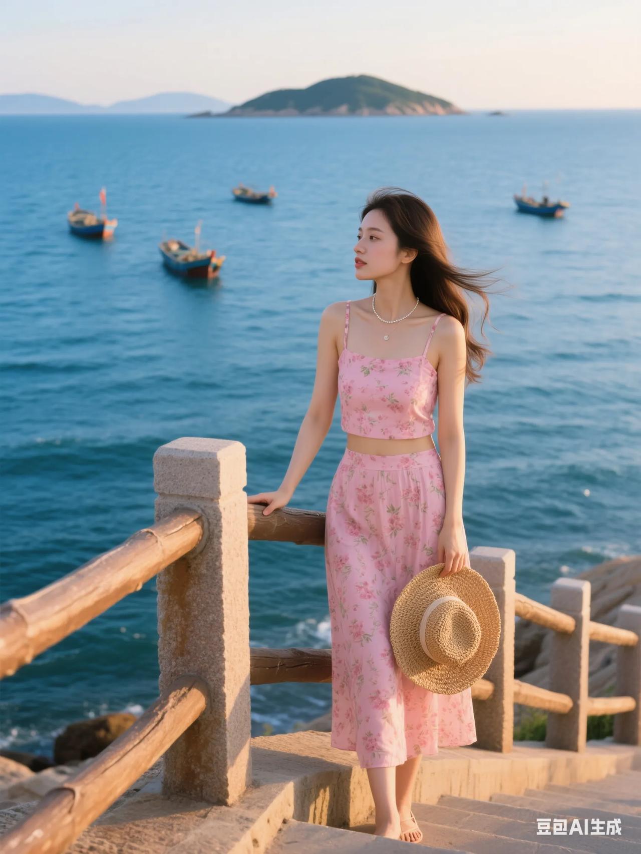 海边漫步,粉裙飘飘,感受海风轻拂。