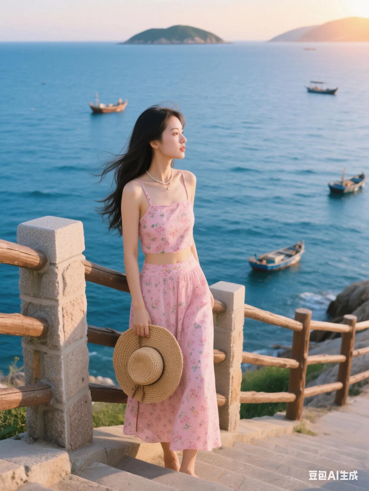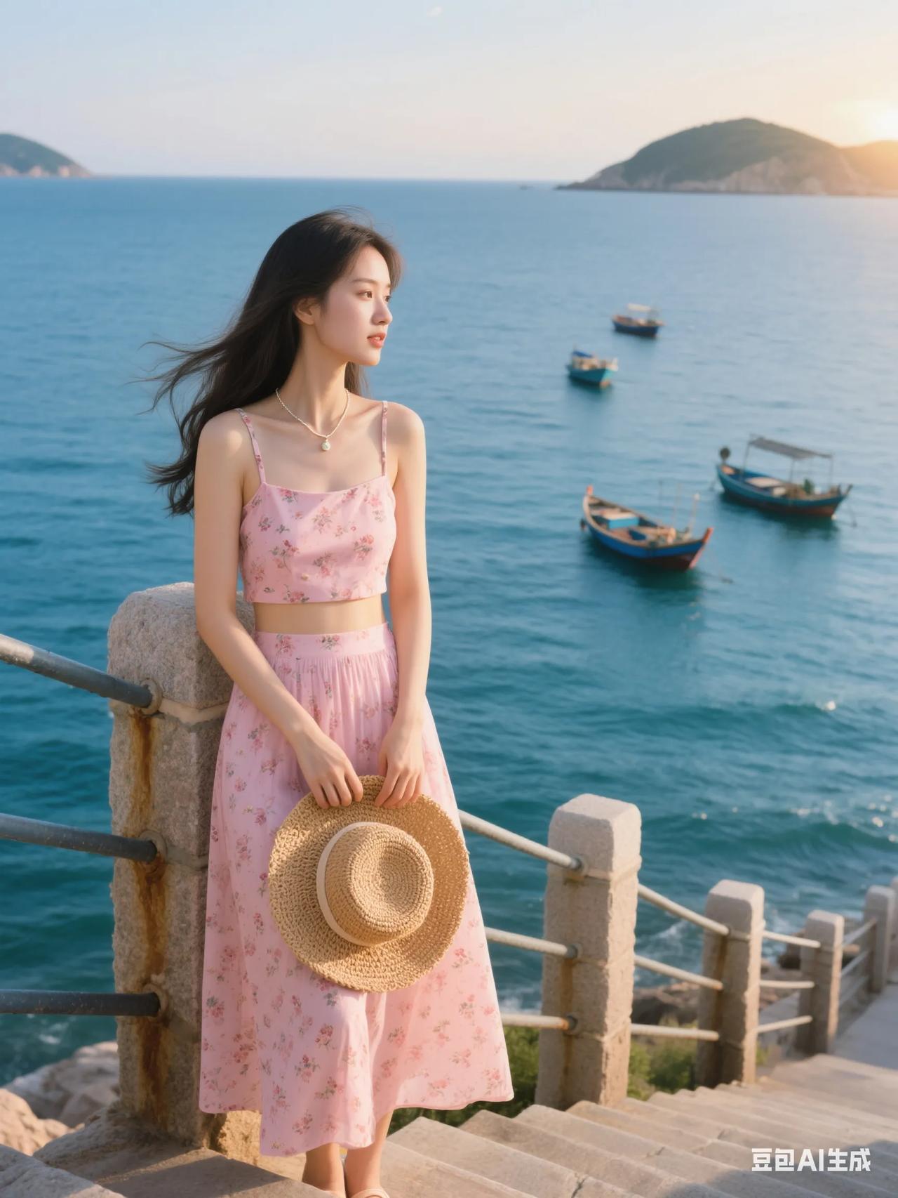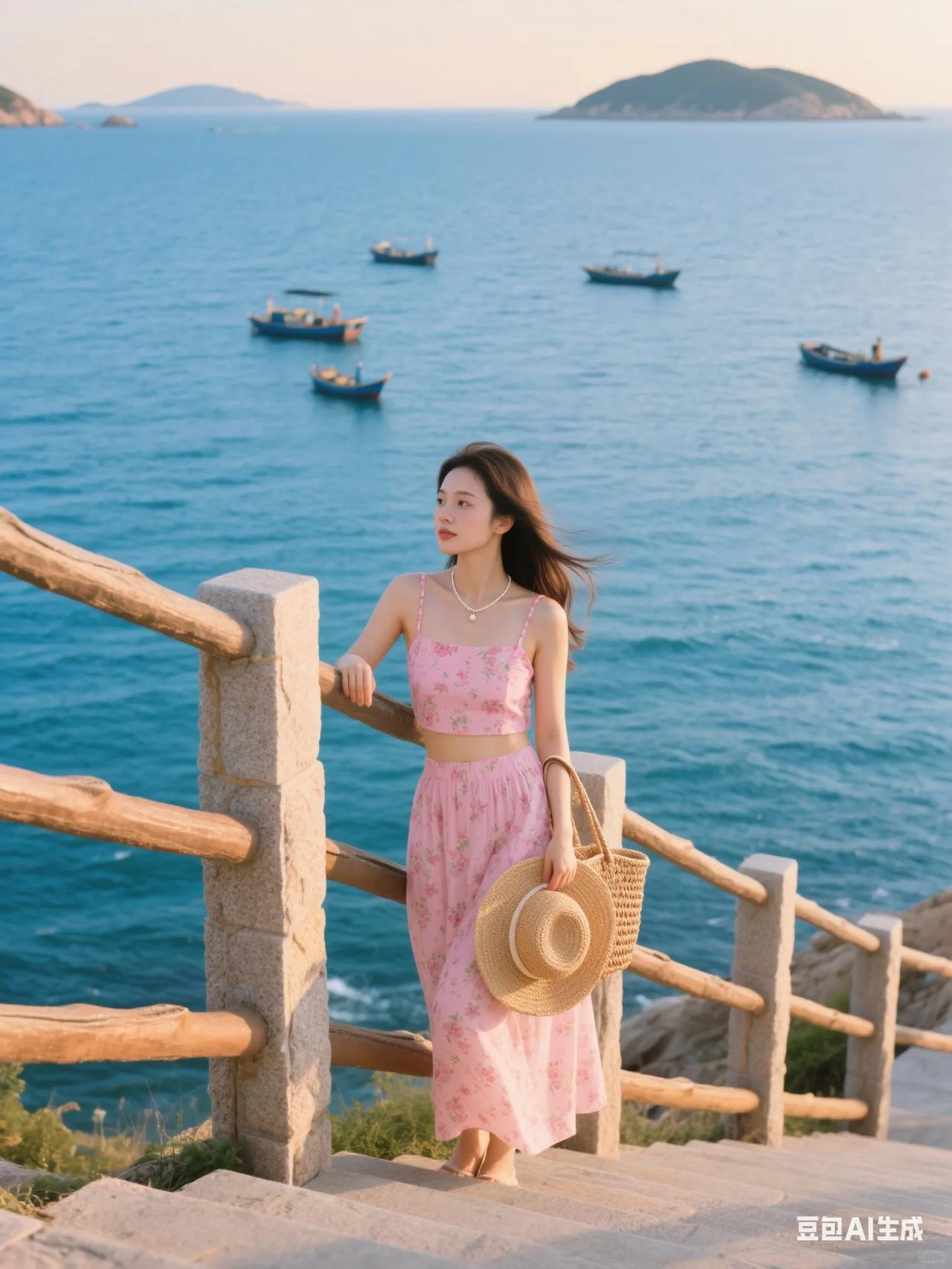 海边漫步,粉裙飘飘,感受海风轻拂。