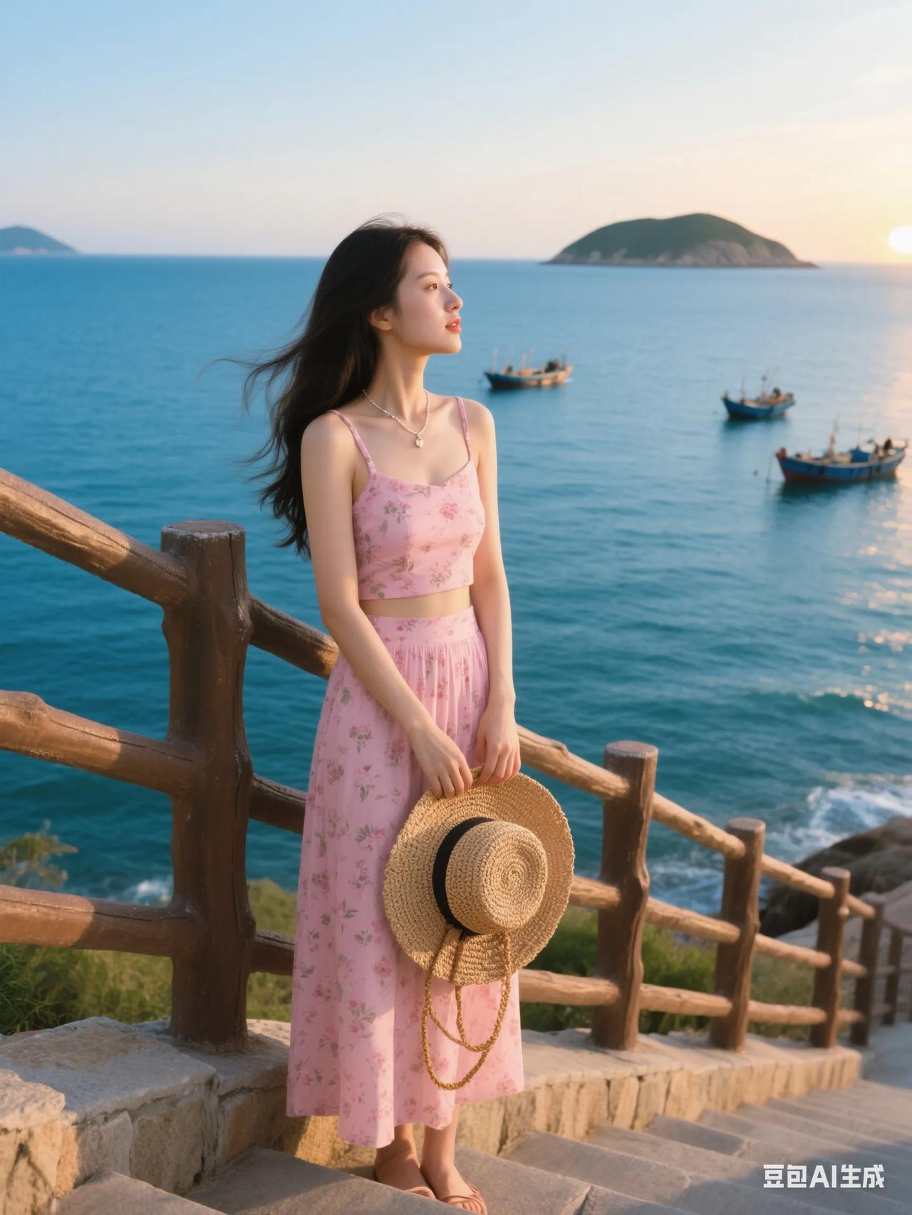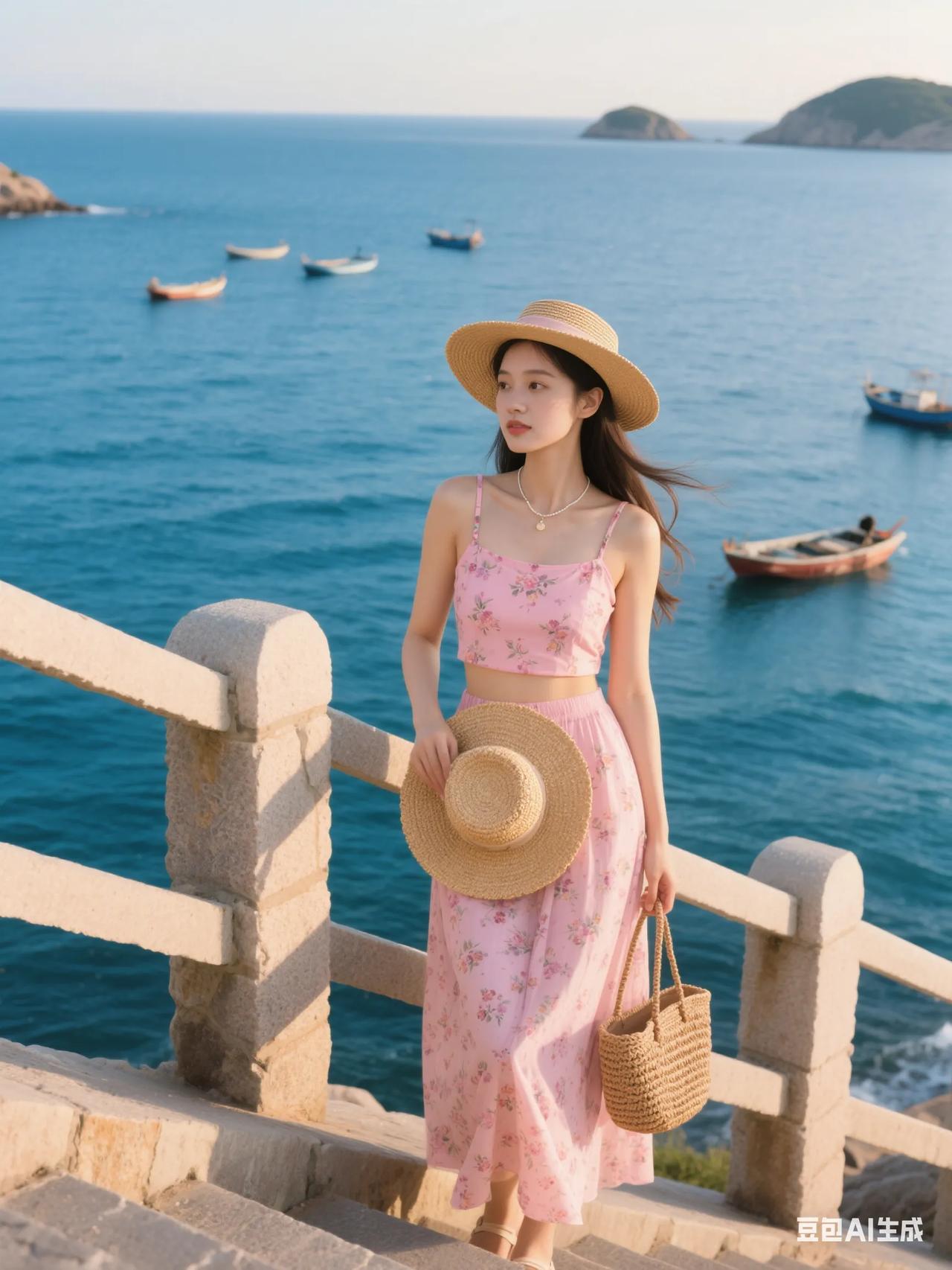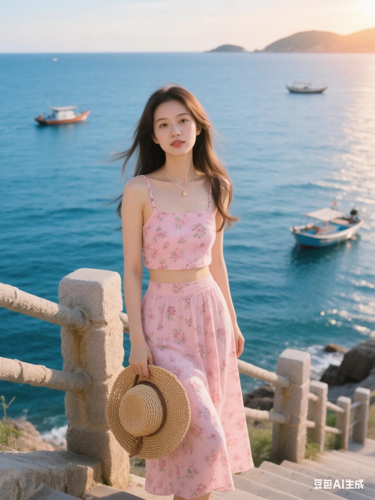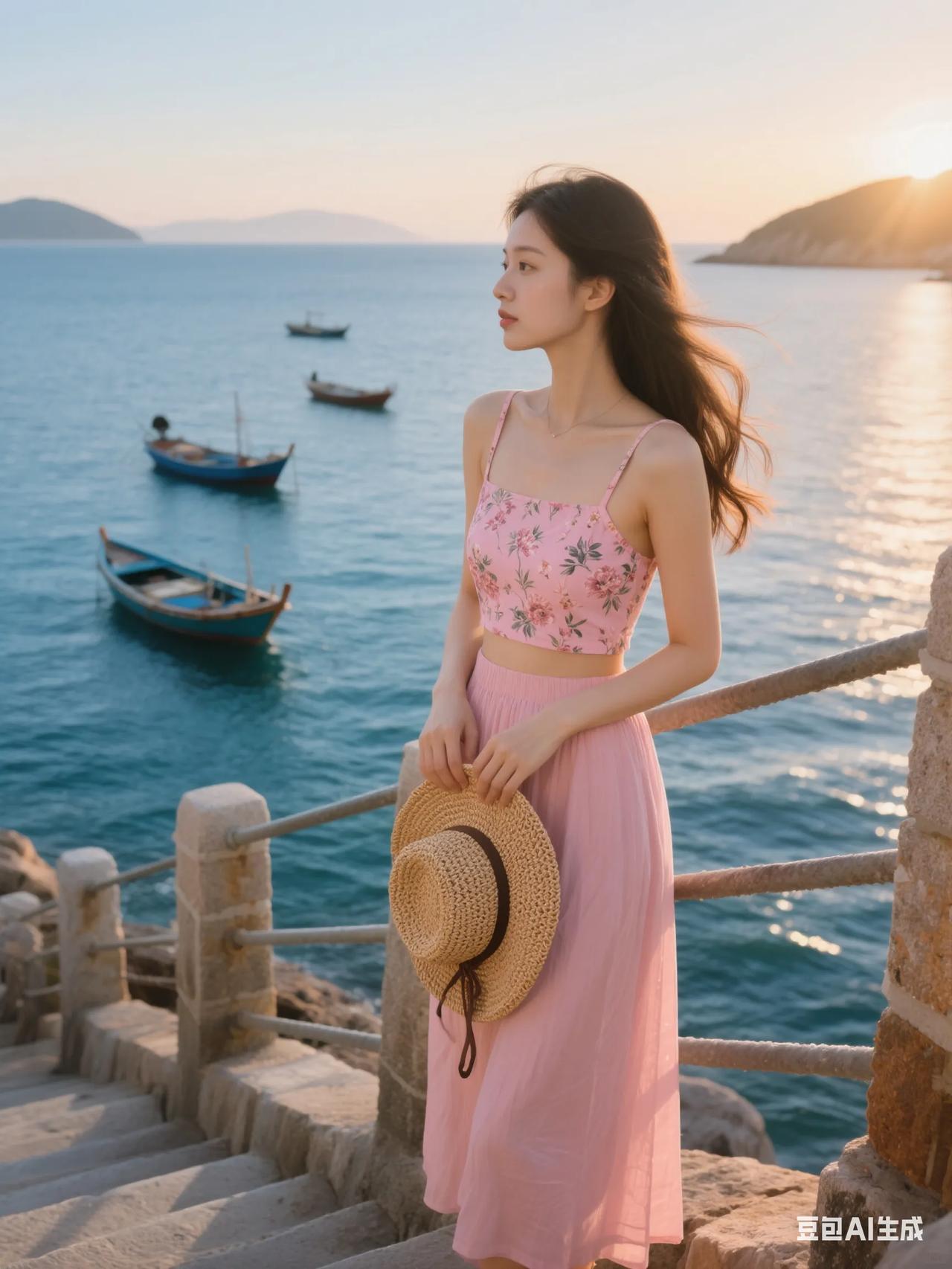 海边漫步,粉裙飘飘,感受海风轻拂。