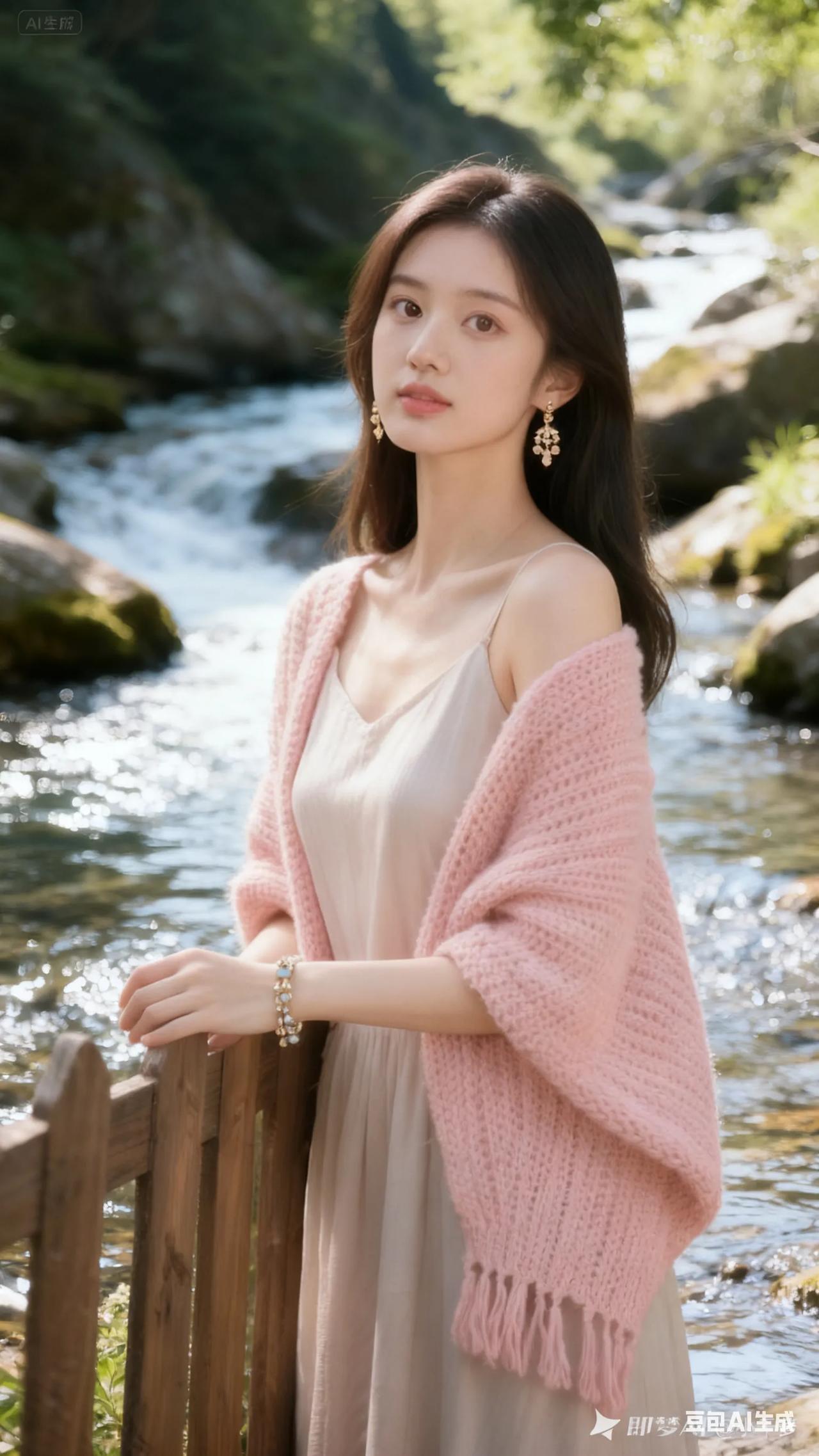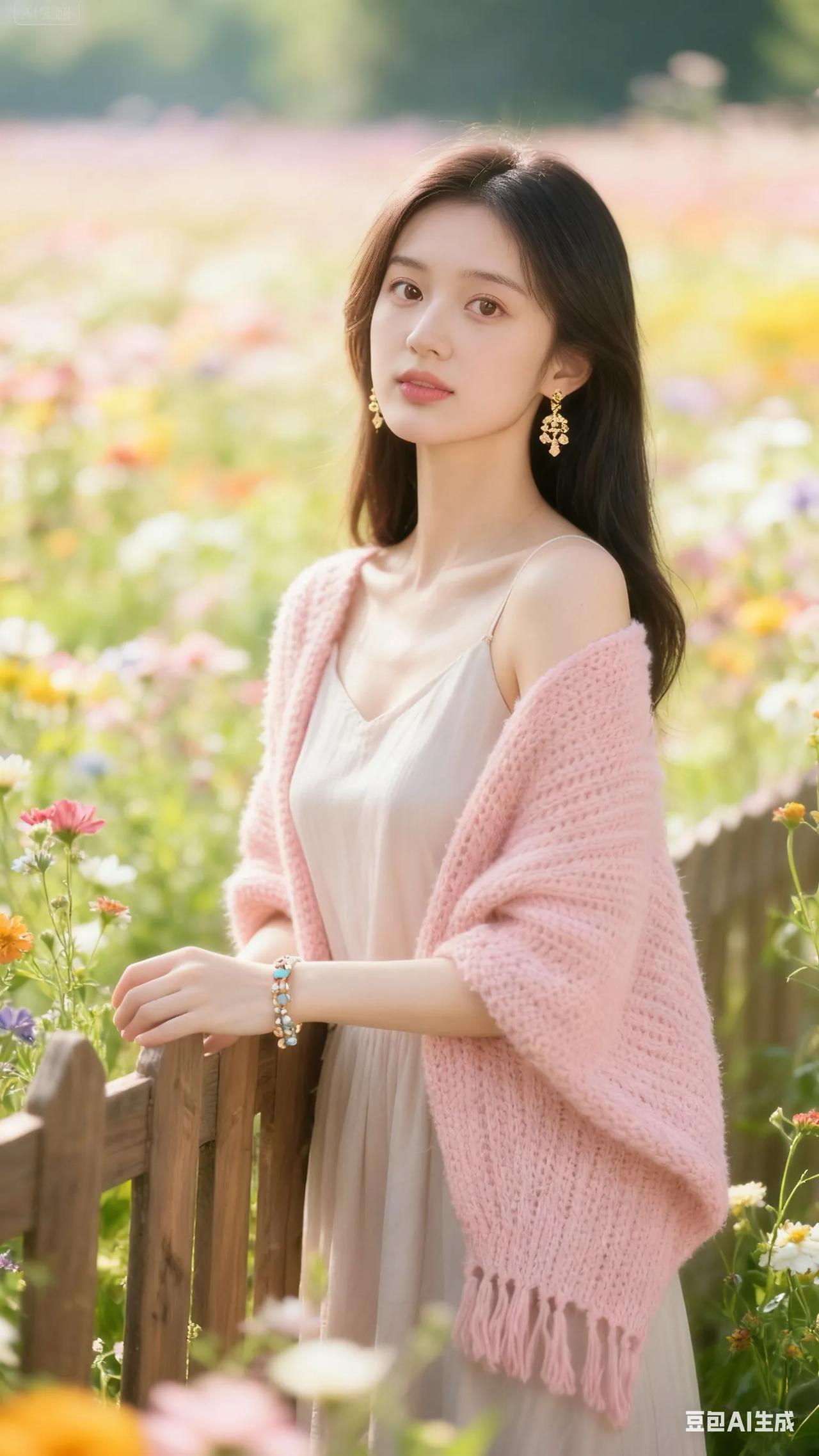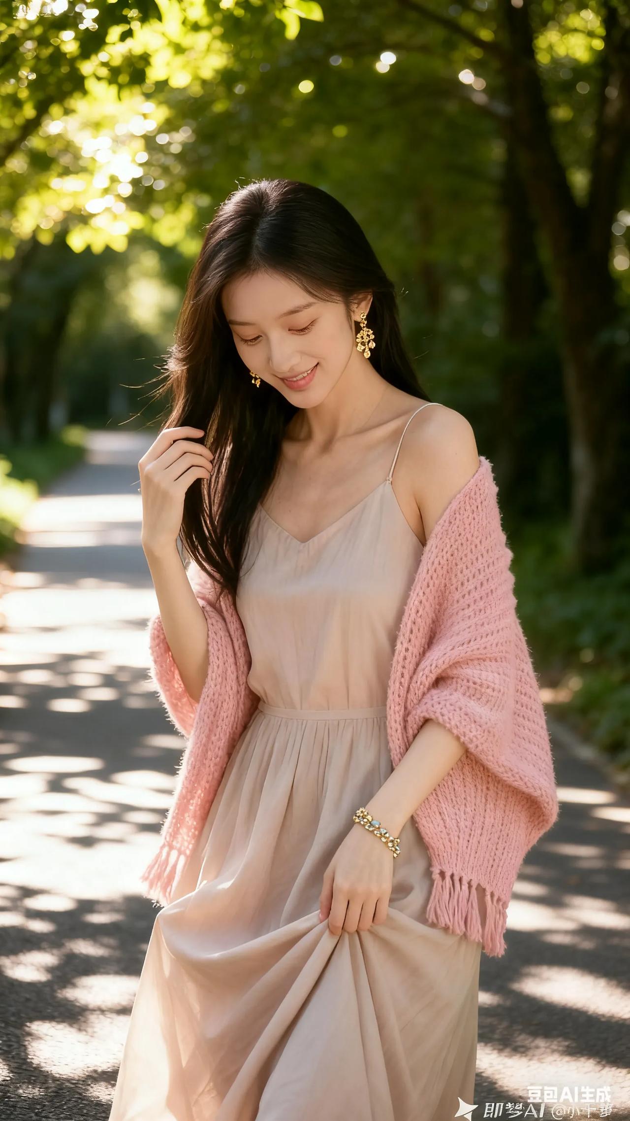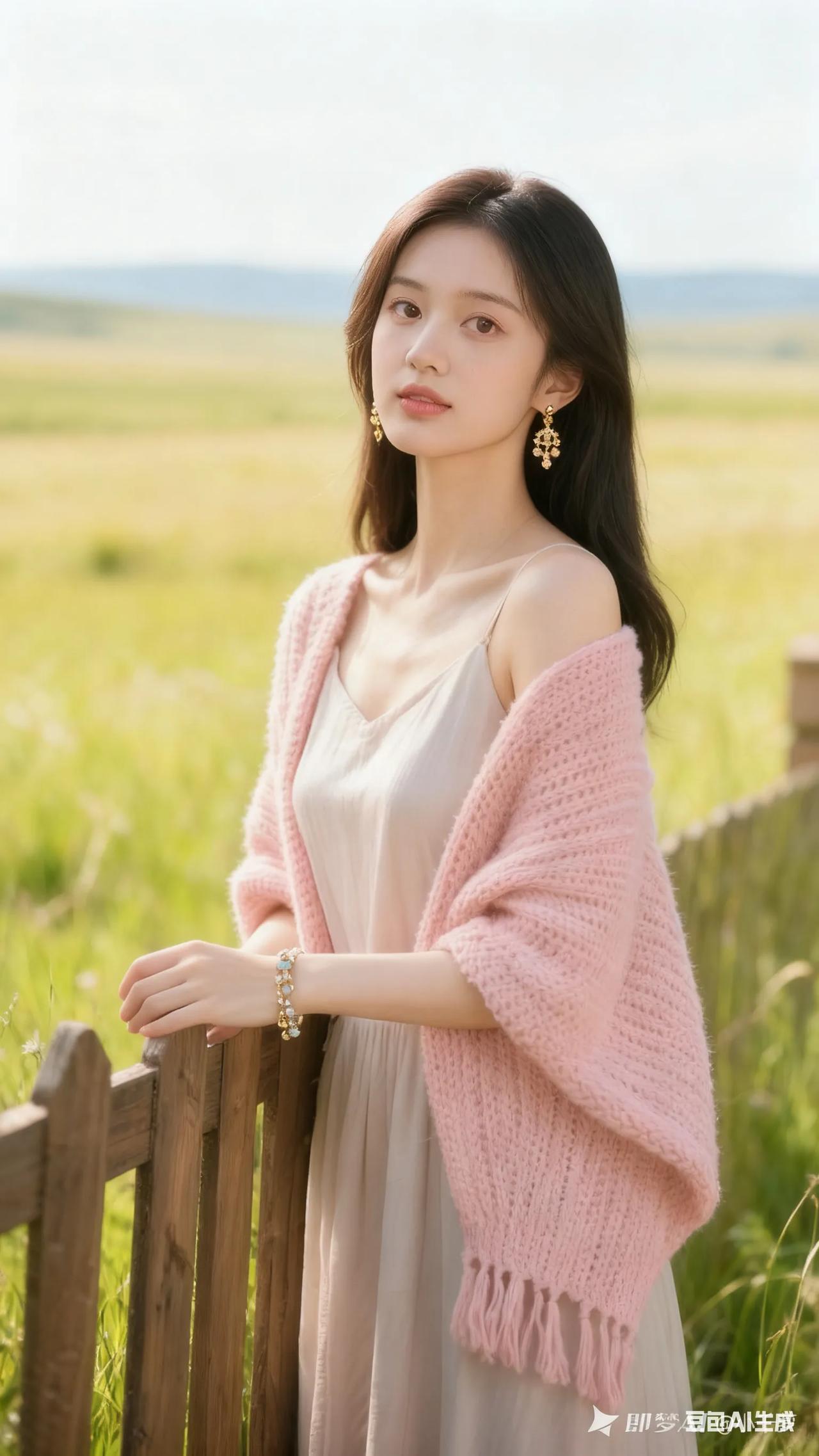 清新穿搭,粉色针织衫搭配米色连衣裙,尽显优雅与自然。